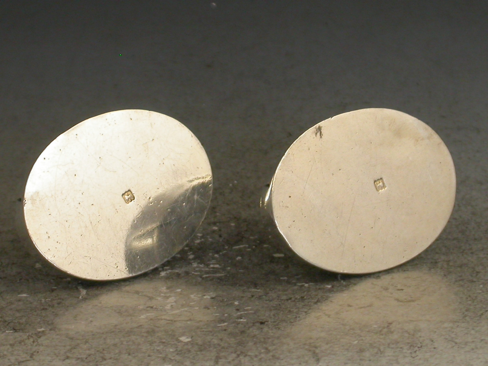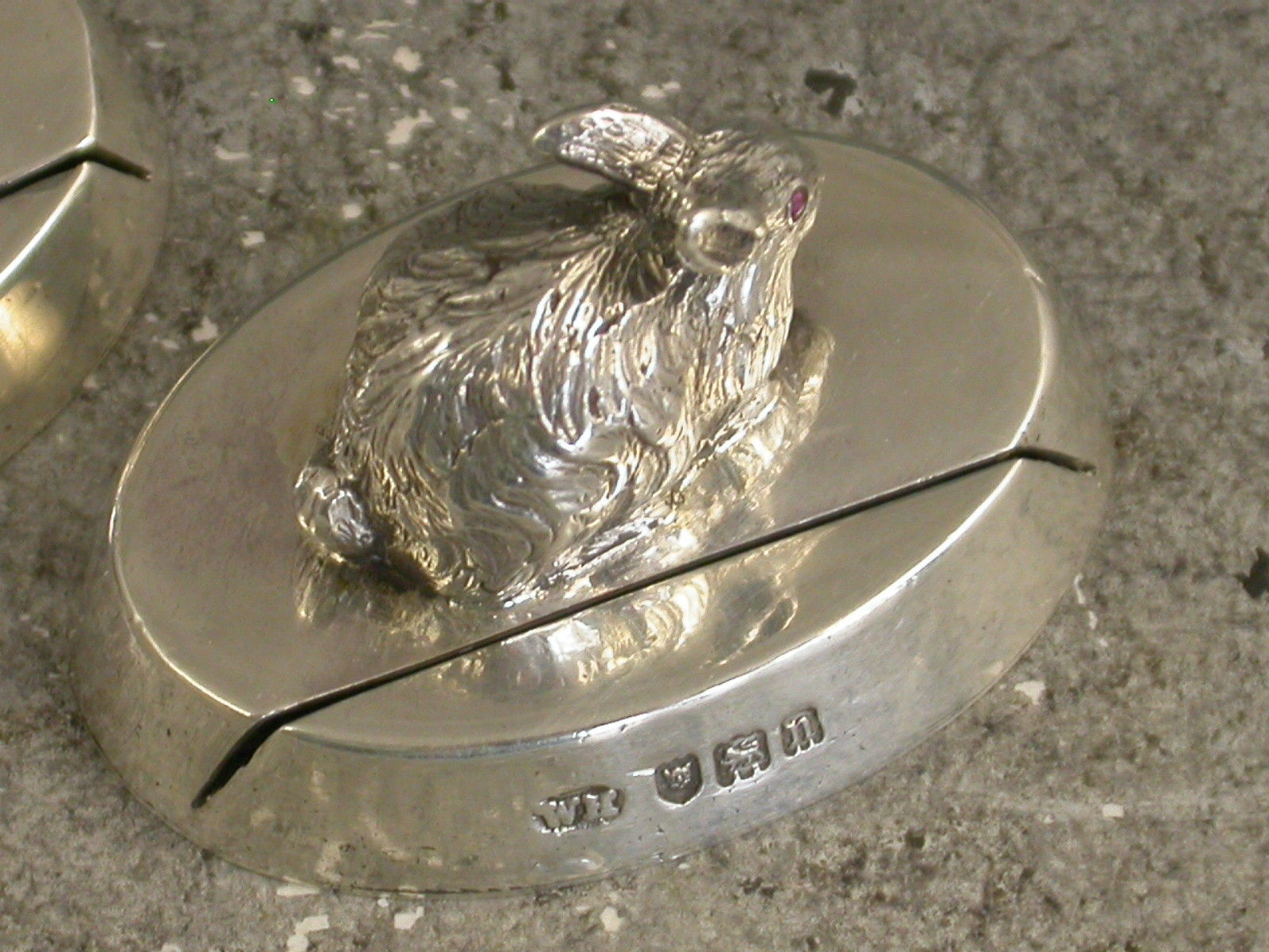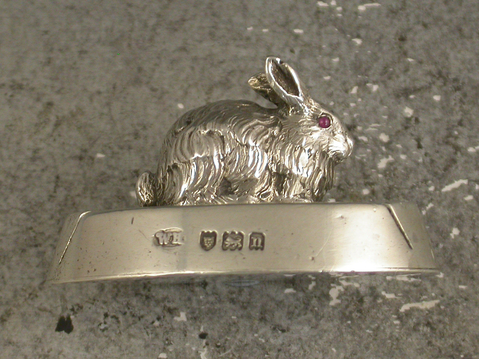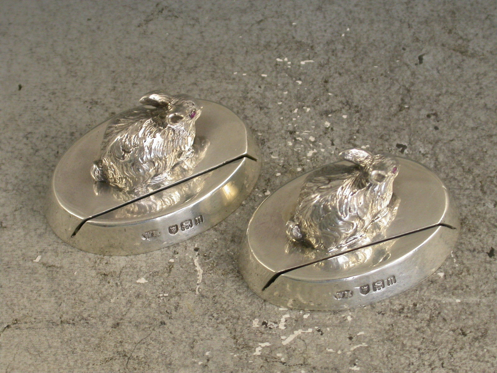 A fine quality pair of Edwardian cast silver Menu Holders formed as crouching rabbits, on slotted oval bases, complete with red glass eyes.