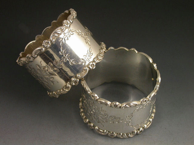 A very fine quality and heavy pair of Edwardian silver Napkin Rings with ornate cast raised borders, finely engraved with foliate sprays and vacant circular cartouches.