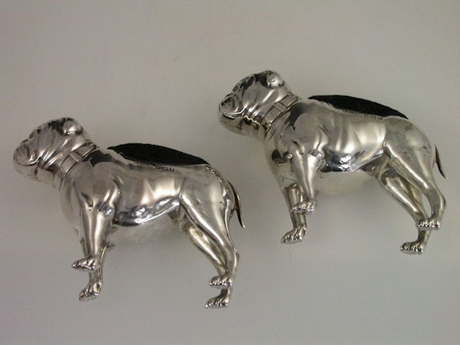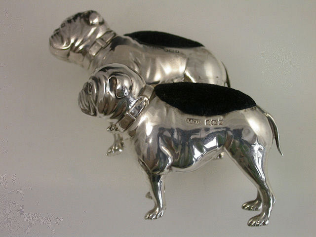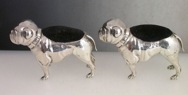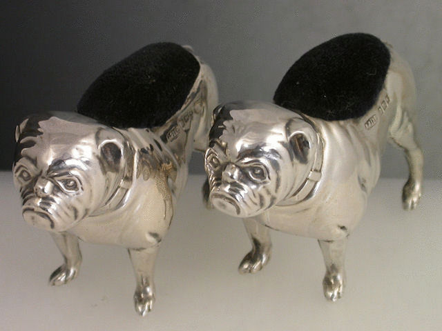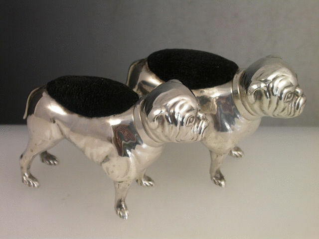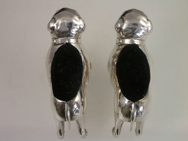 A good pair of Edwardian silver Pin Cushions modelled as Pug dogs with navy blue velvet cushions.