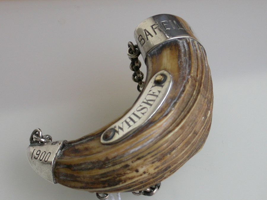 An interesting pair of Victorian/Edwardian silver mounted Boars Tusk Wine Labels, with crescent shaped silver plaques engraved for Whiskey & Sherry, the tusks carved to fit inside the silver mounts which are engraved 'Bareilly' and '1900' (Bareilly is a prominent city in Northern India).