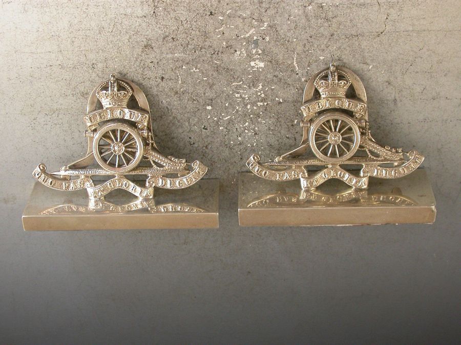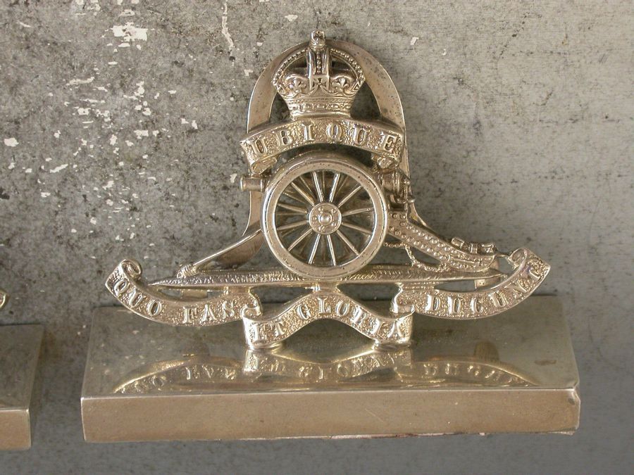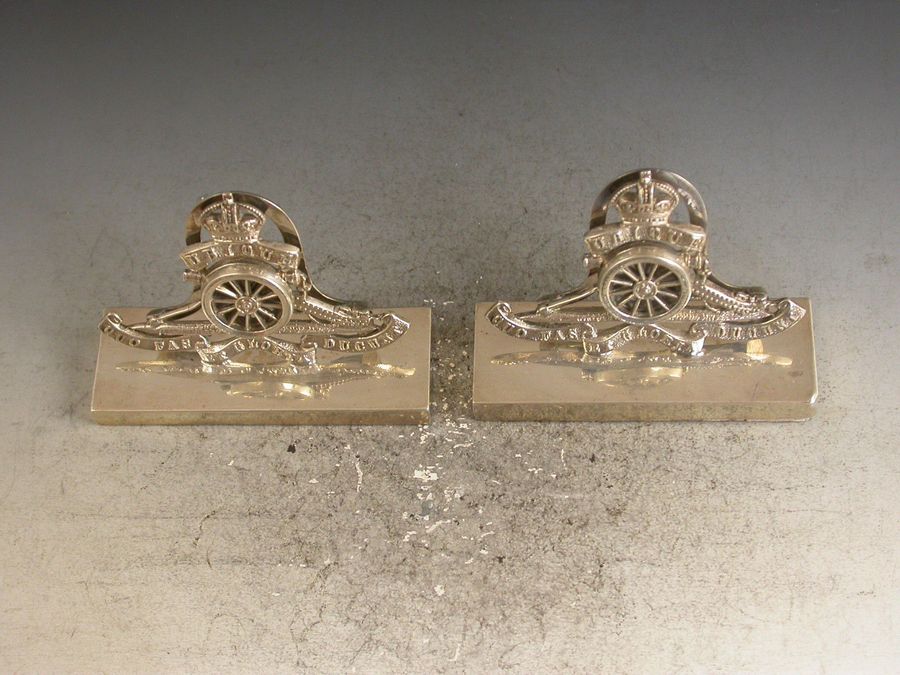 A good pair of Edwardian cast silver Menu Holders formed as Royal Artillery Badges set on weighted rectangular bases