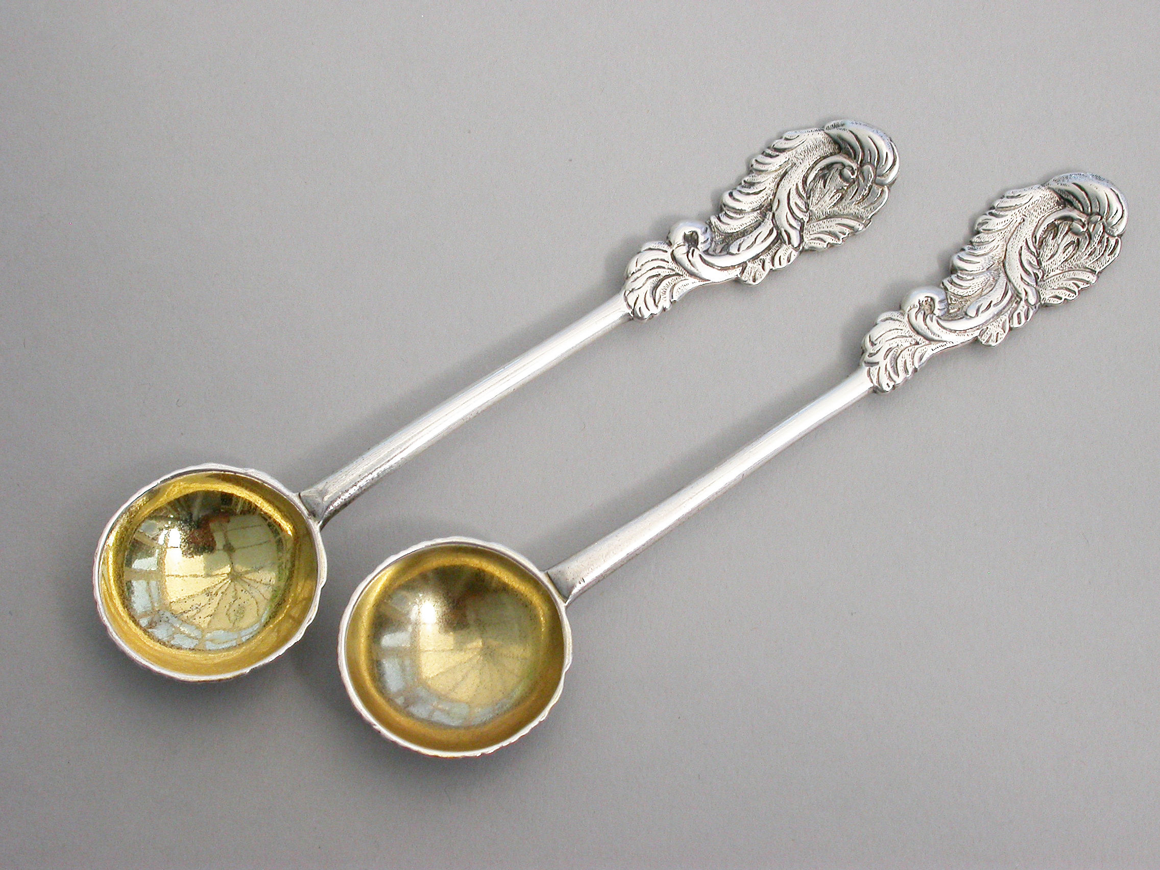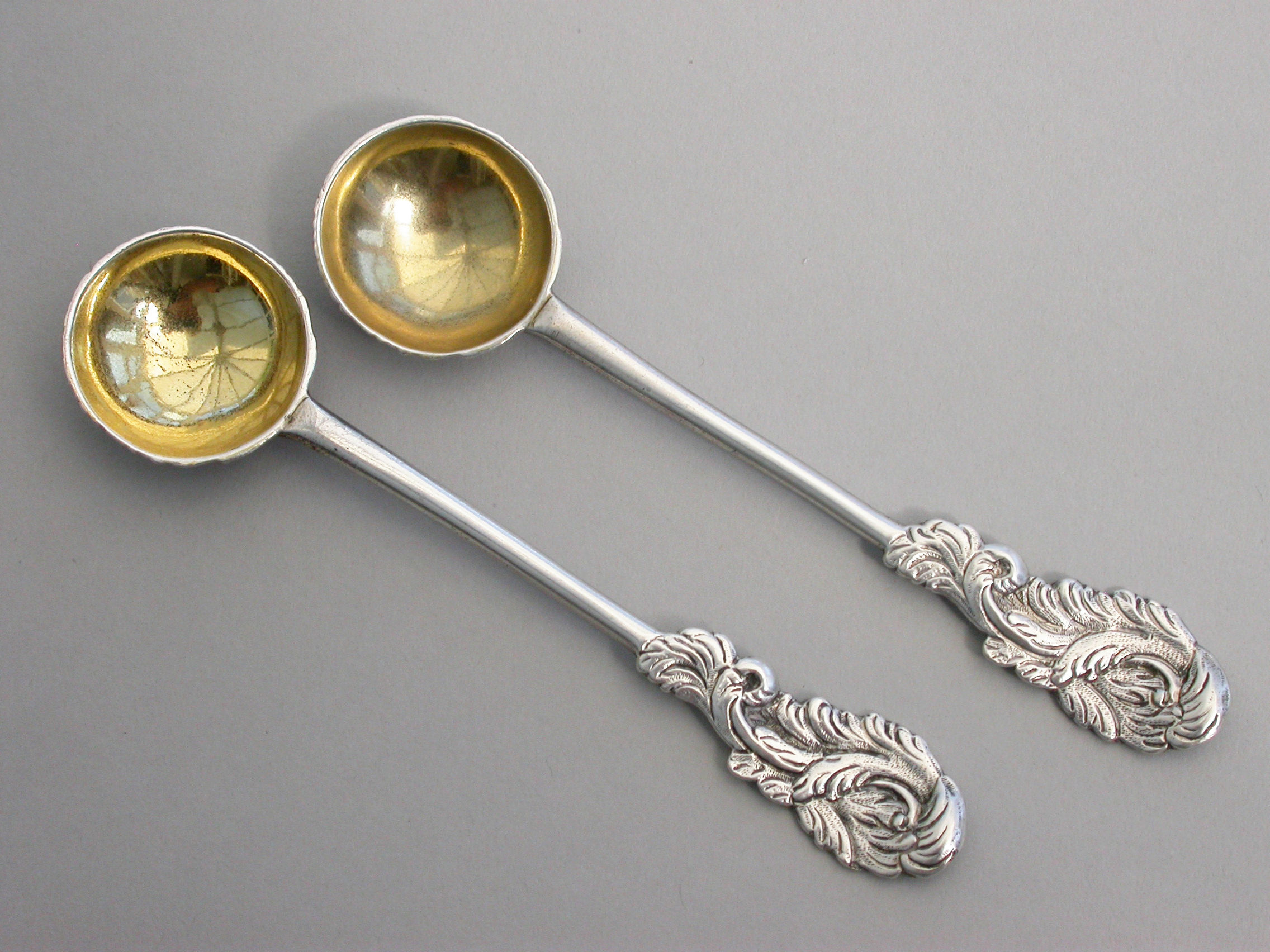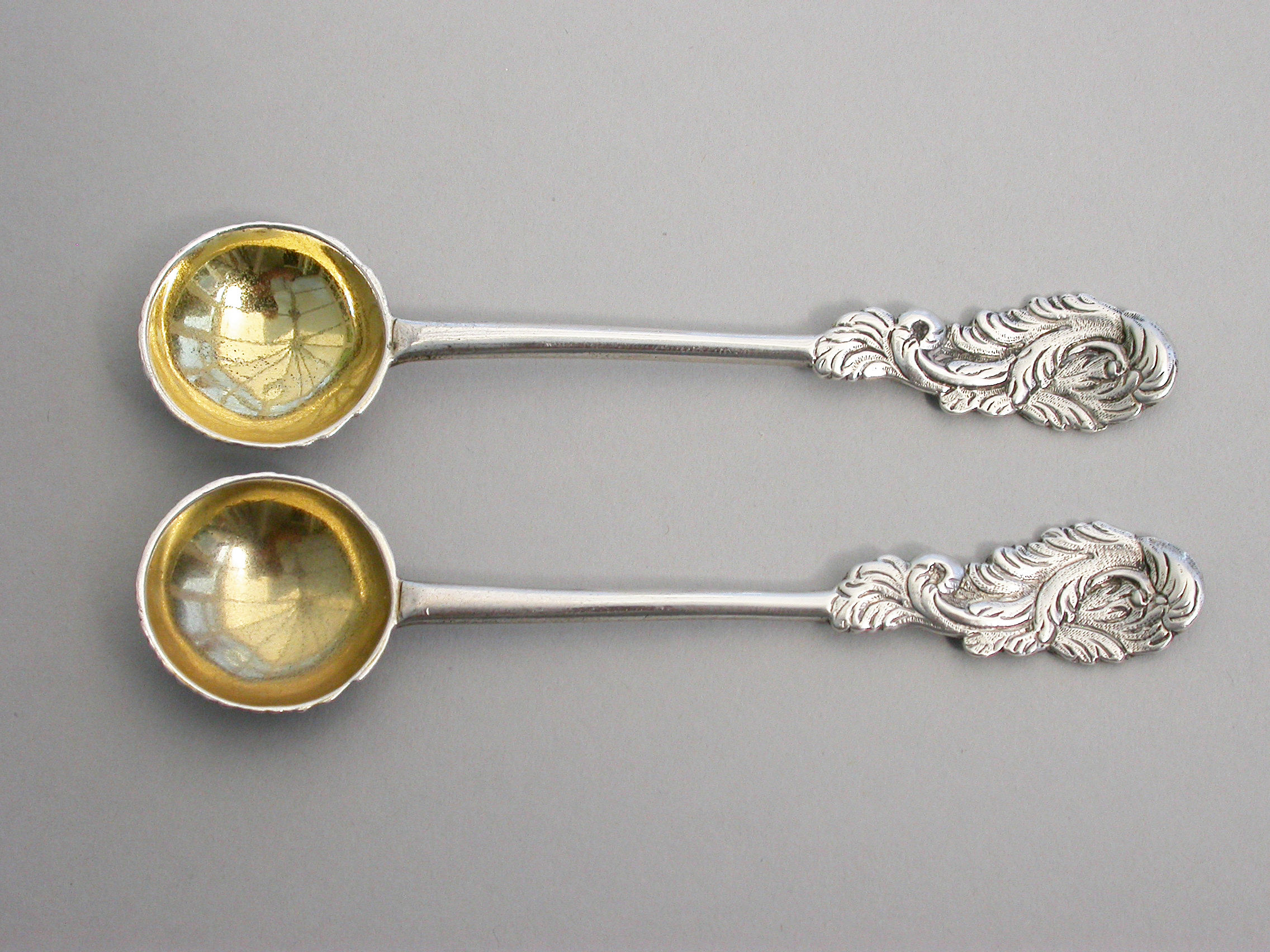 A good pair of George II cast silver Naturalistic Salt Spoons with leafy terminals and circular shell shaped gilded bowls.