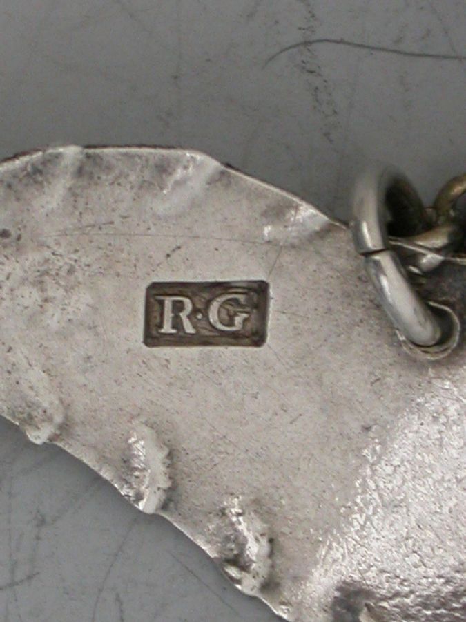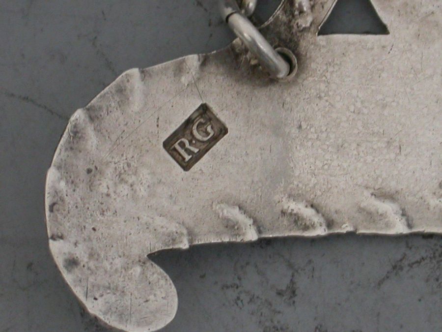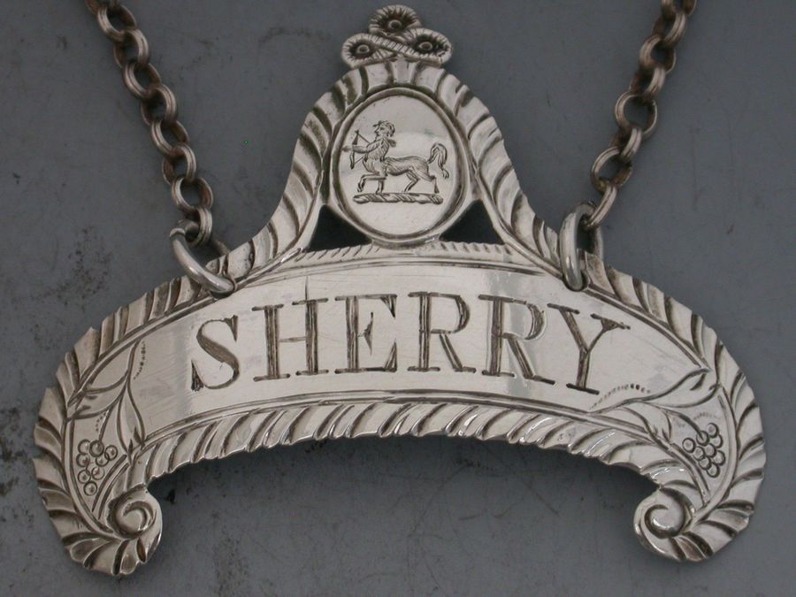 An unusual composed pair of George III 18th century silver Wine Labels of down-turned scroll form with feather edged borders and tied ribbon surmounts, oval cartouches engraved with crests of a Centaur or Sagittarius, incised for Madeira and Sherry.