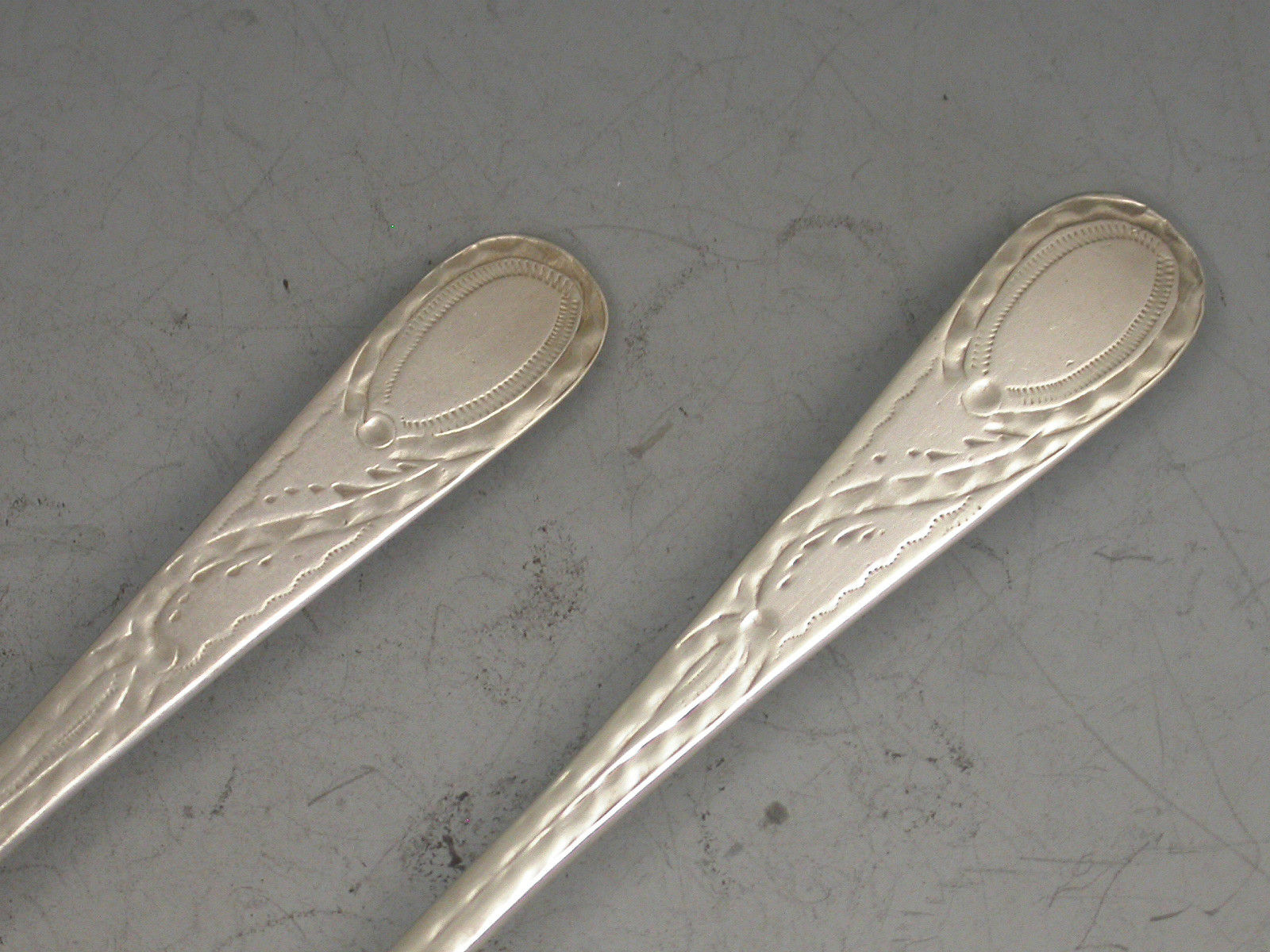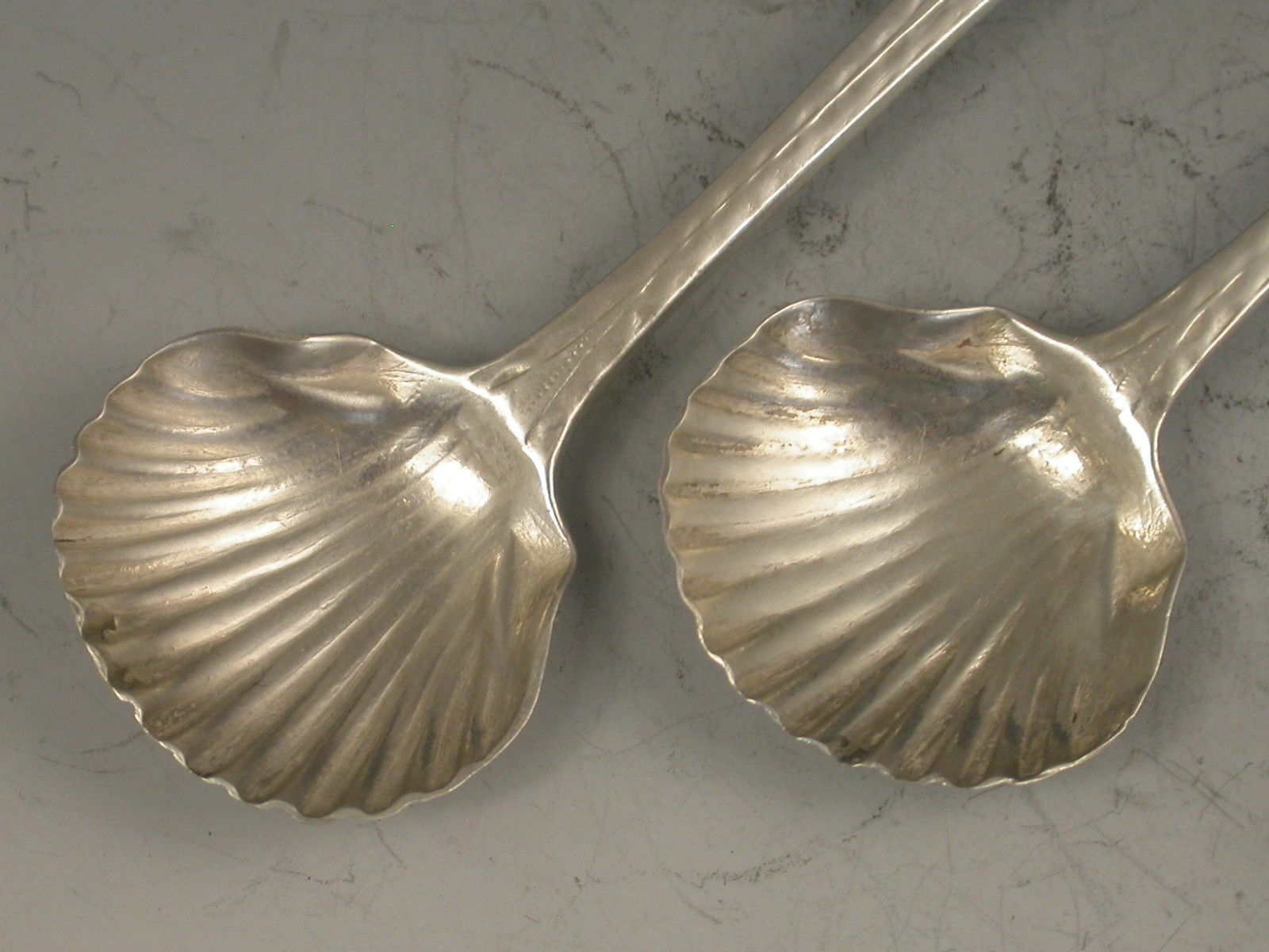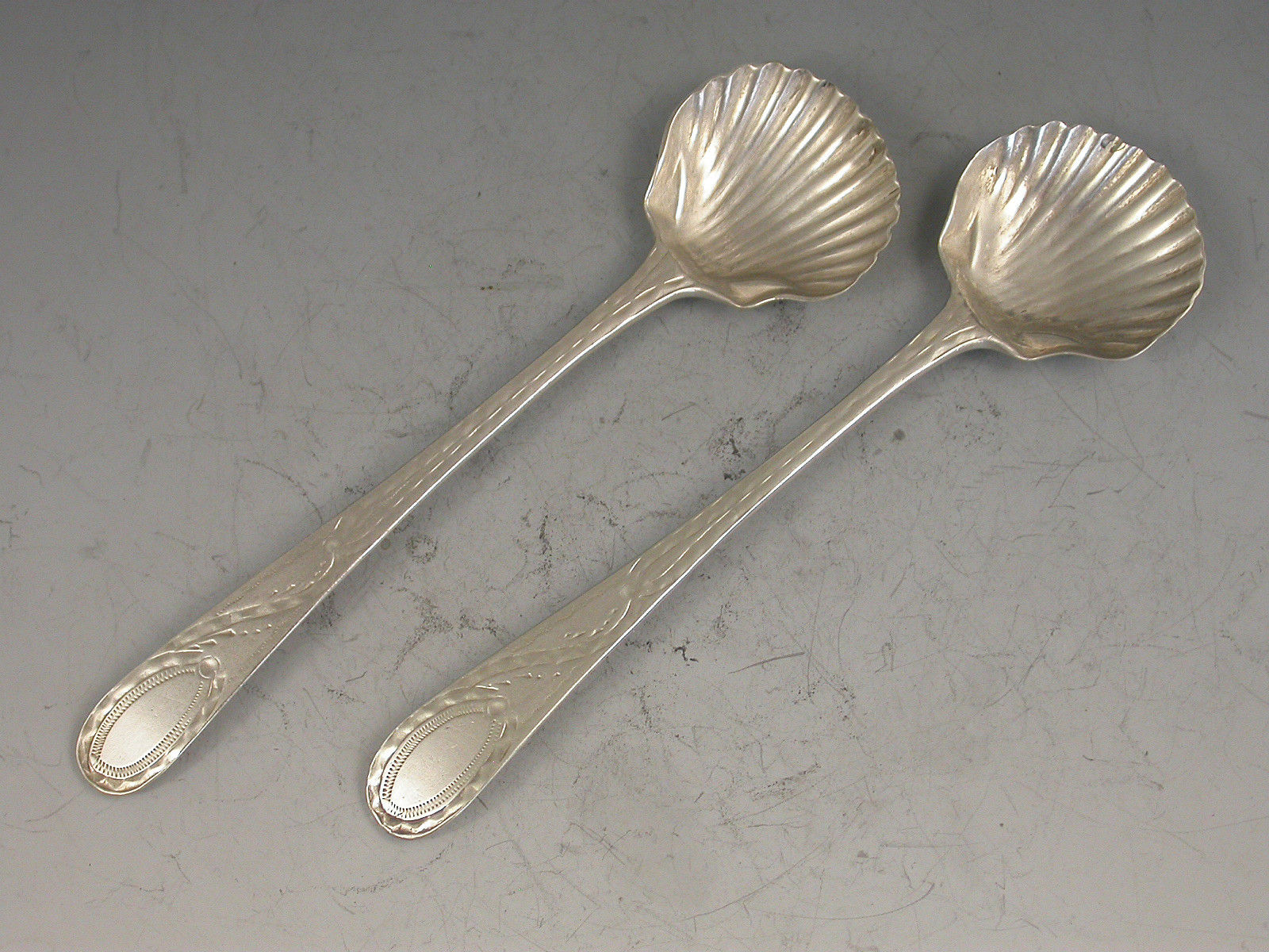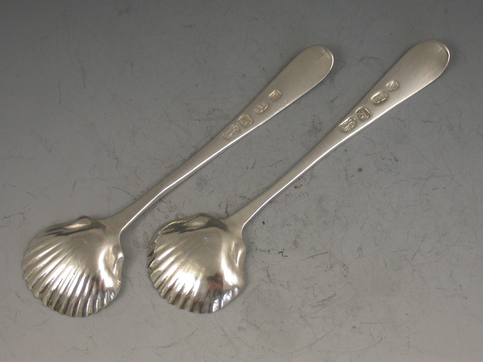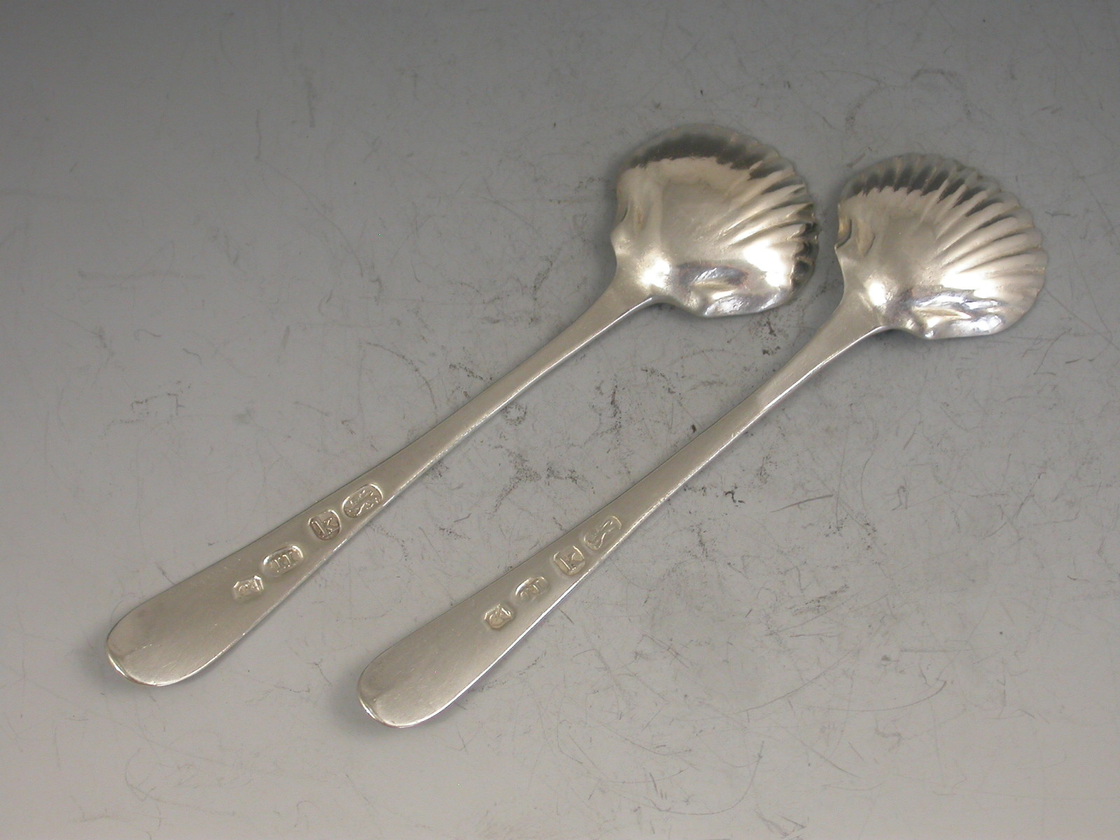 A good pair of late 18th century silver Salt Spoons with fluted scallop shell bowls and bright-cut Old English handles.