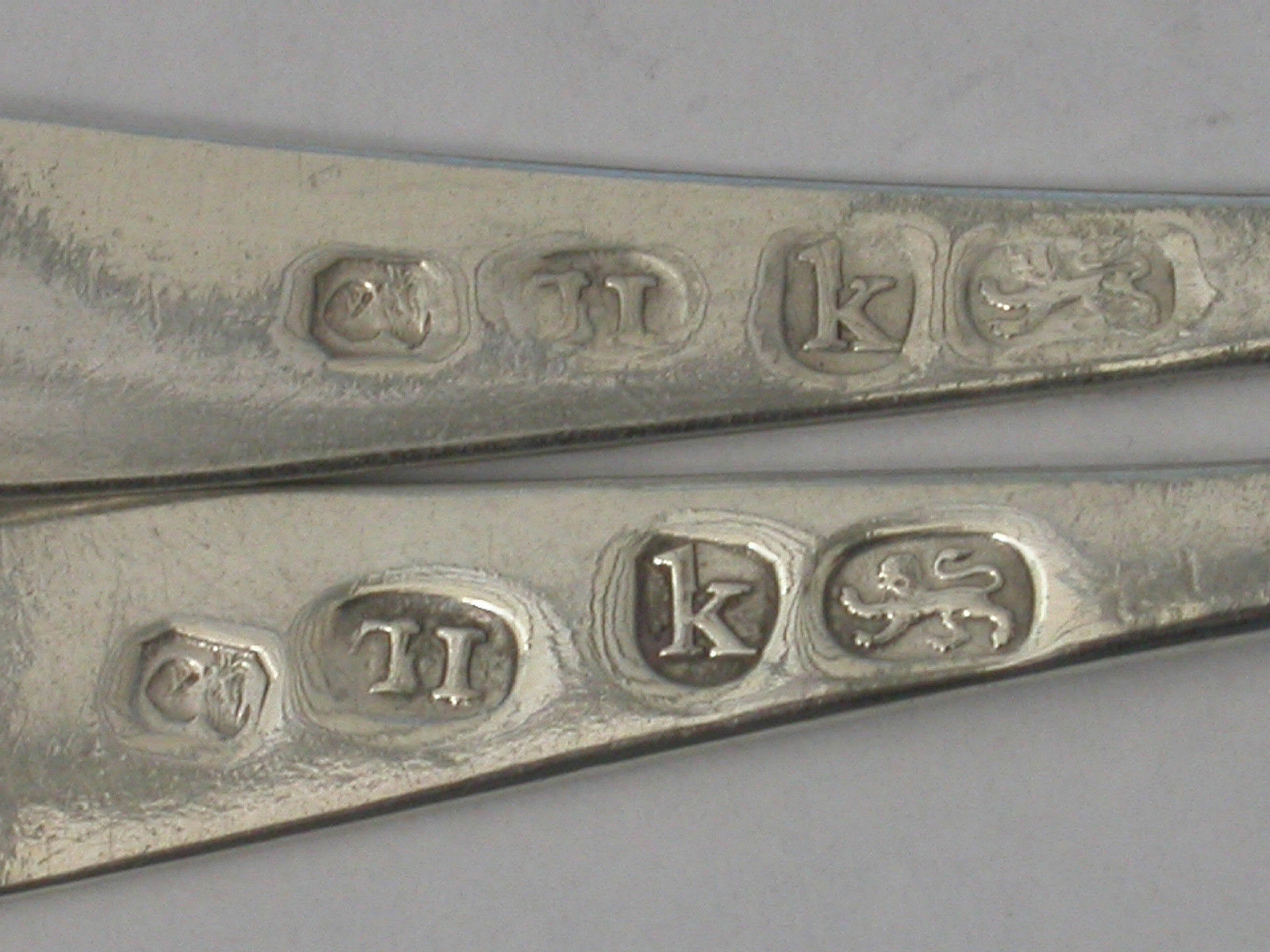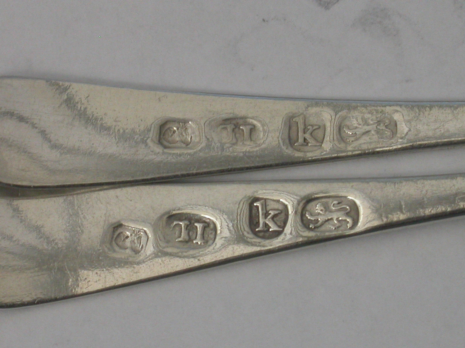 Pair George III Bright Cut Engraved Salt Spoons - Incuse Head Mark