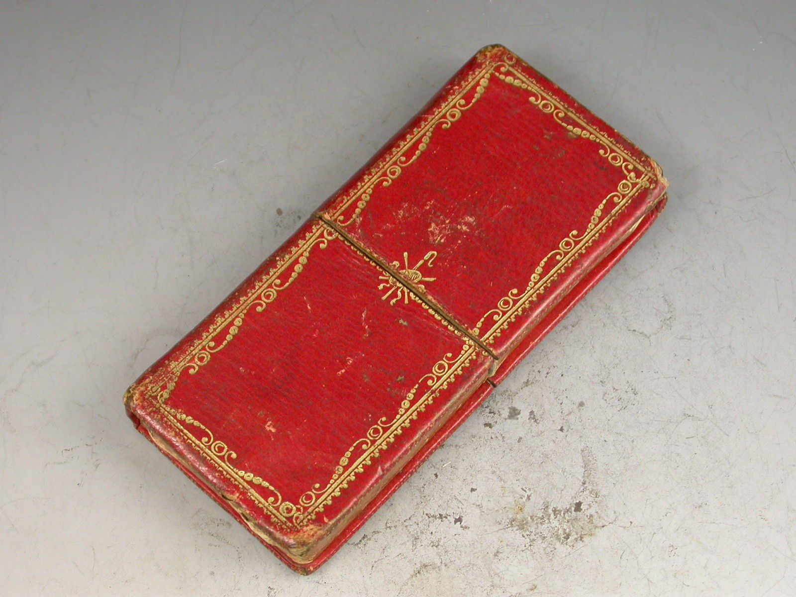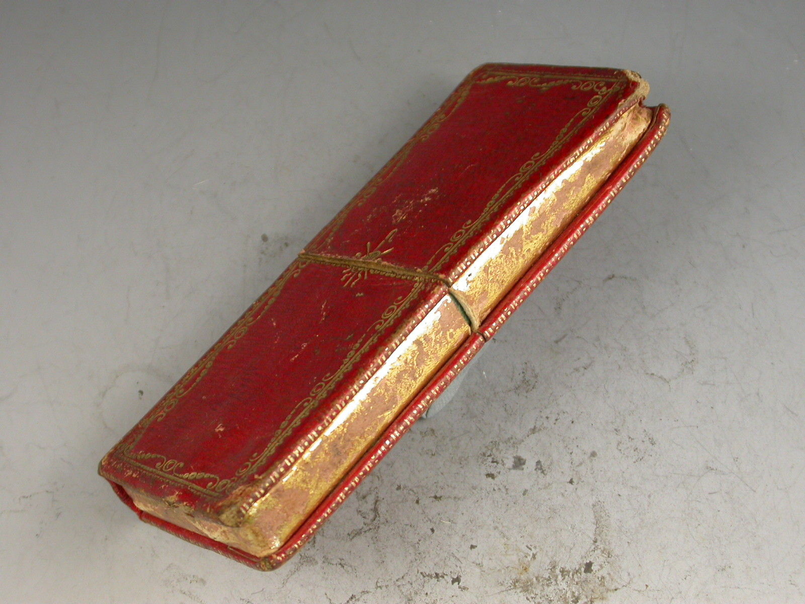 The fork in fine condition with no damage or repair, the knife with a couple of hairline surface cracks to the mother of pearl. The leather case with some wear.