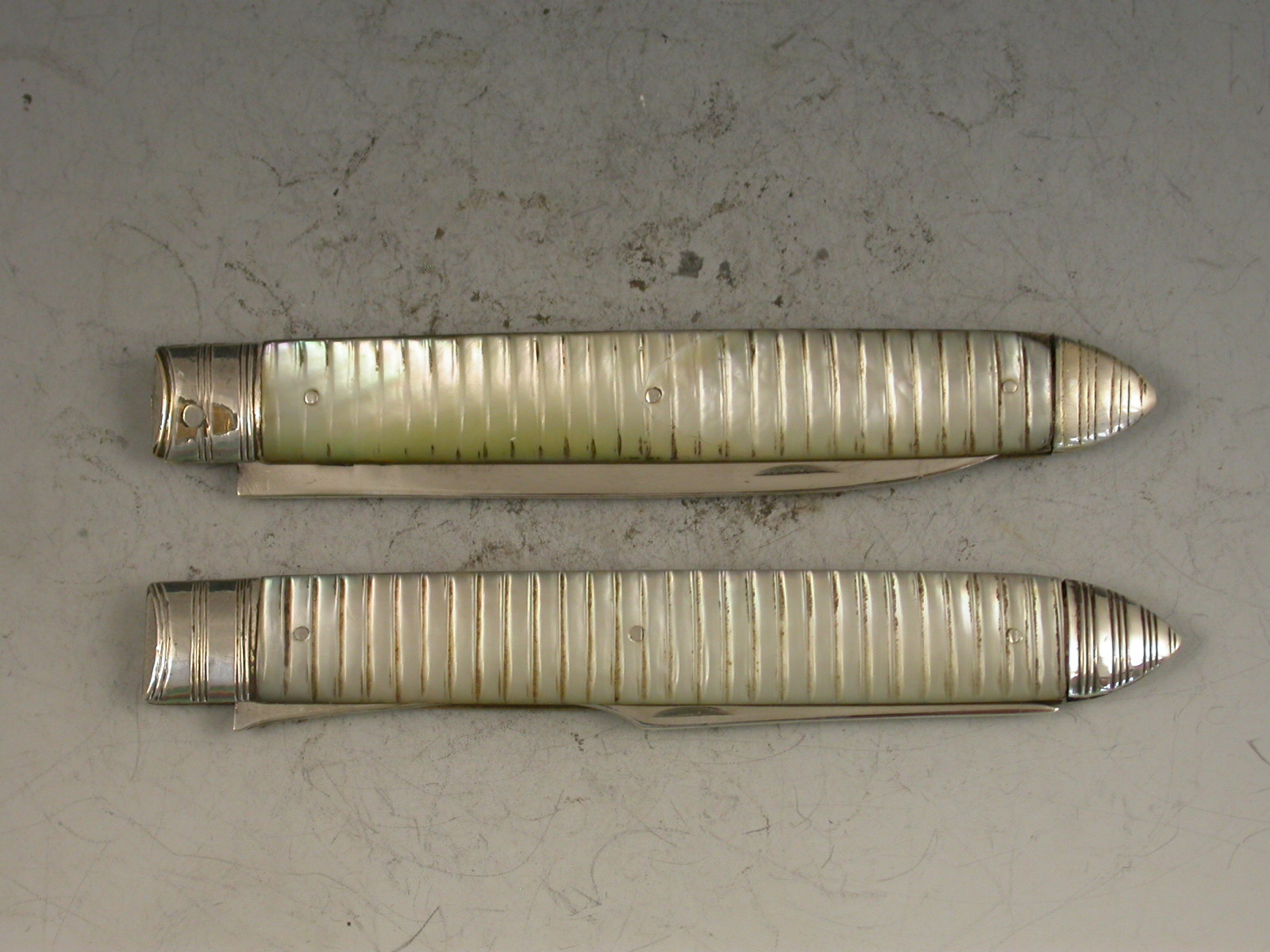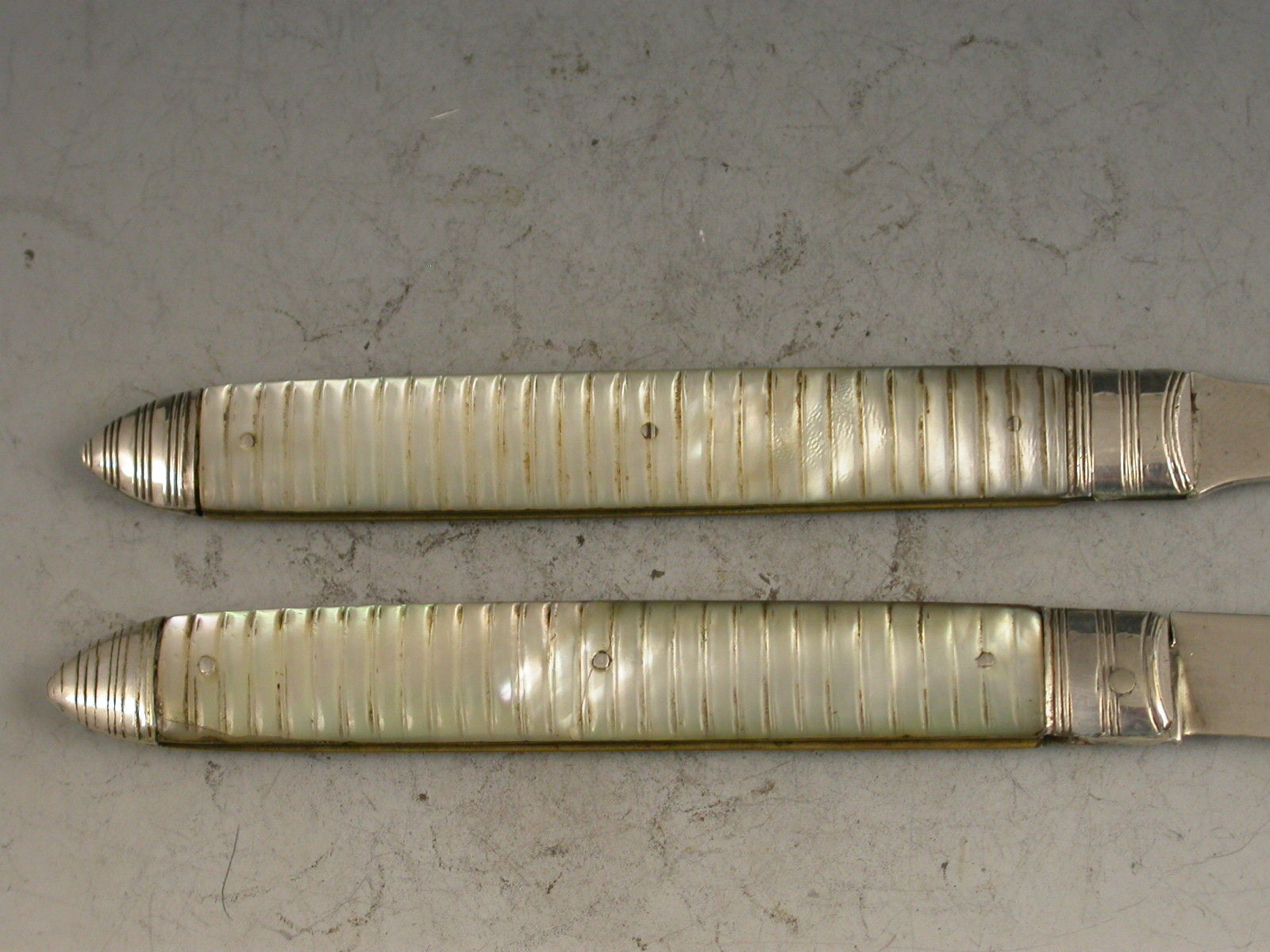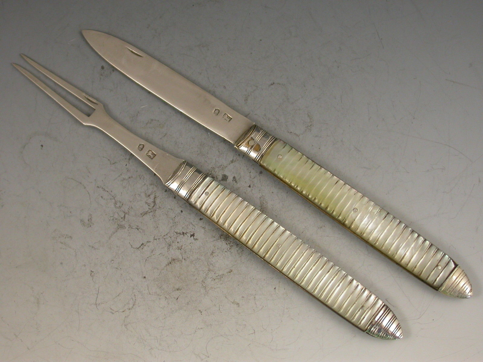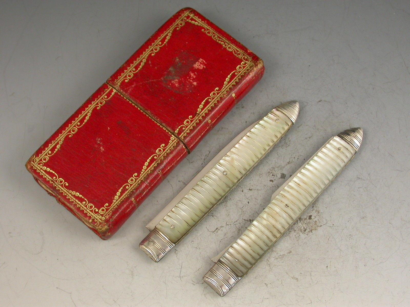 Pair George III Cased Silver & Mother of Pearl Folding Fruit Knife & Fork