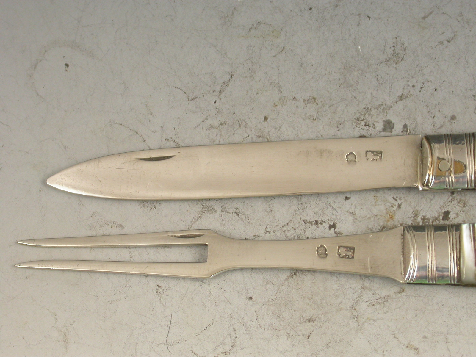 A good George III cased silver and mother of pearl folding Fruit Knife and Fork, the mother of pearl handles with reeded decoration, the plain silver blades stamped with cusped George III duty marks and lion passants only, Sheffield, c1798.