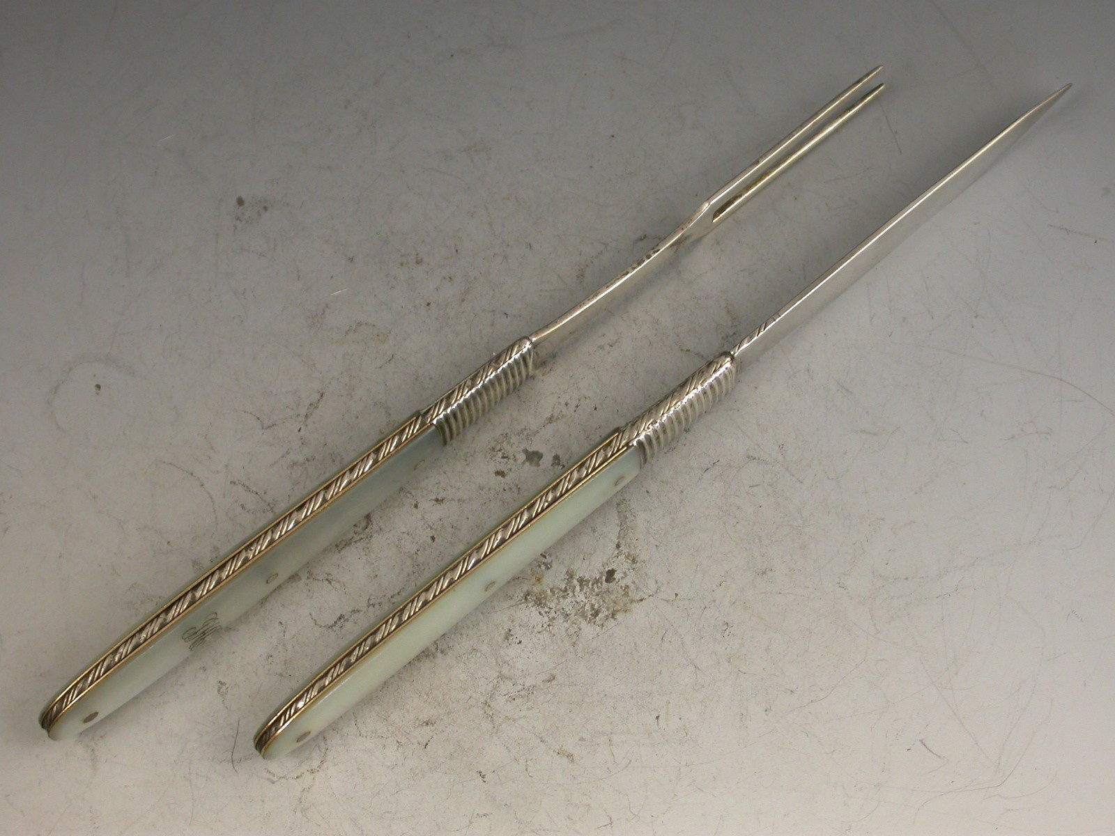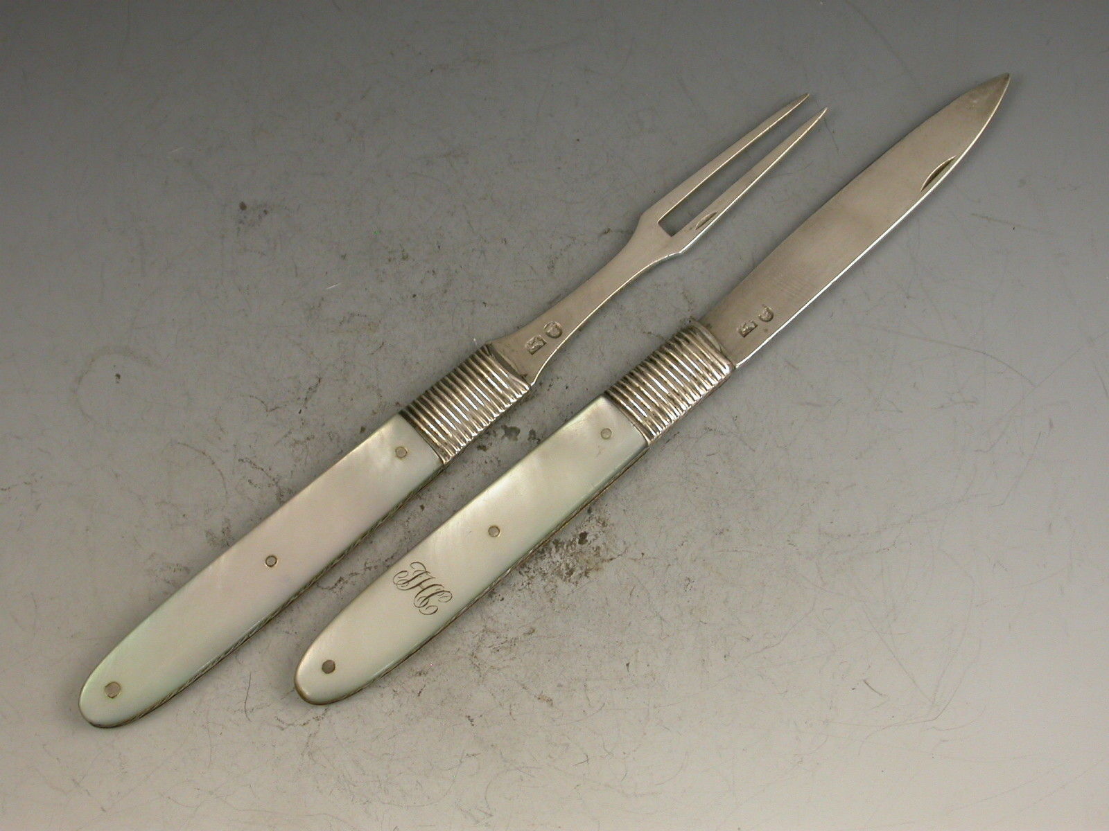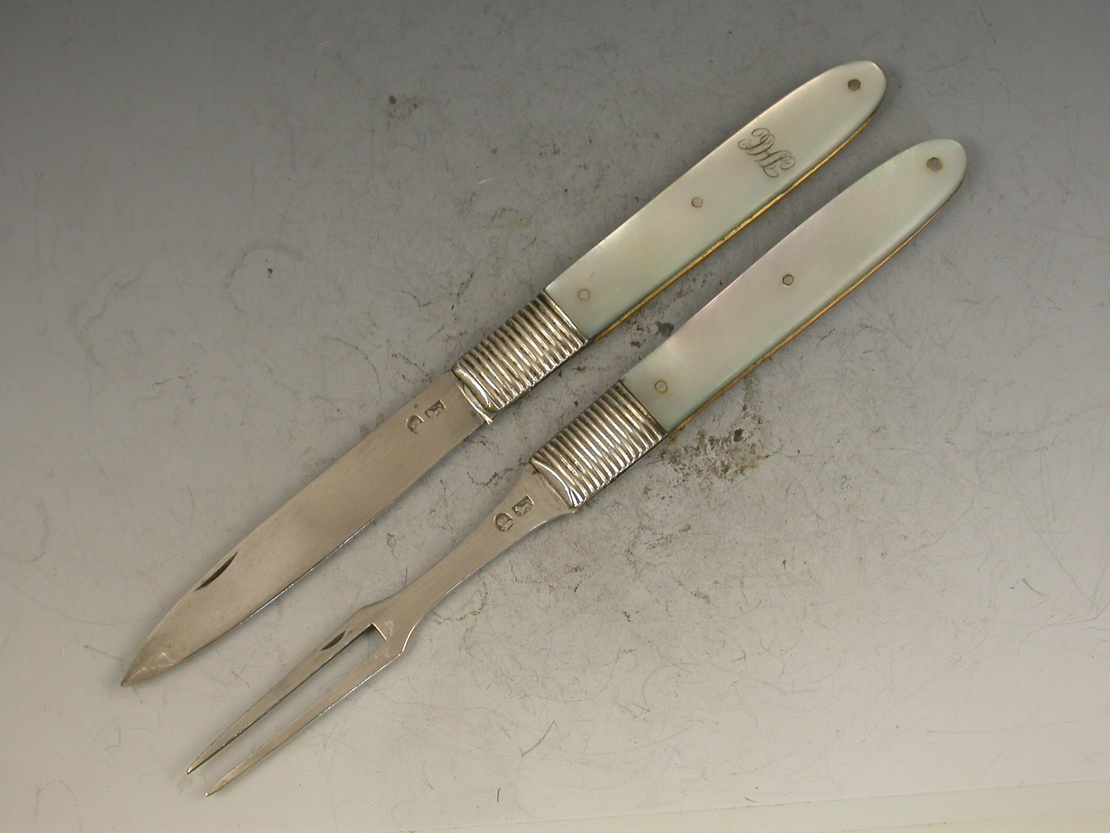 A good cased pair of George III silver and mother of pearl folding Fruit Knife and Fork, the plain mother of pearl handles engraved with initials, the plain silver blades stamped with George III duty marks and lion passants only. Sheffield, c1800.