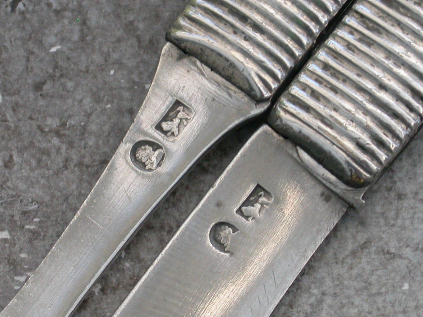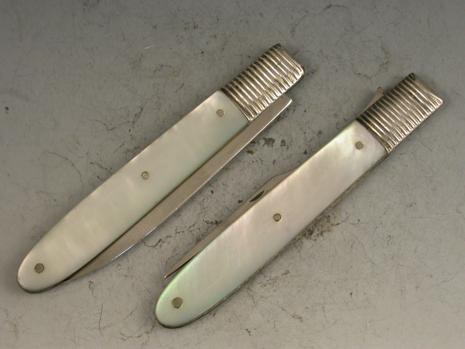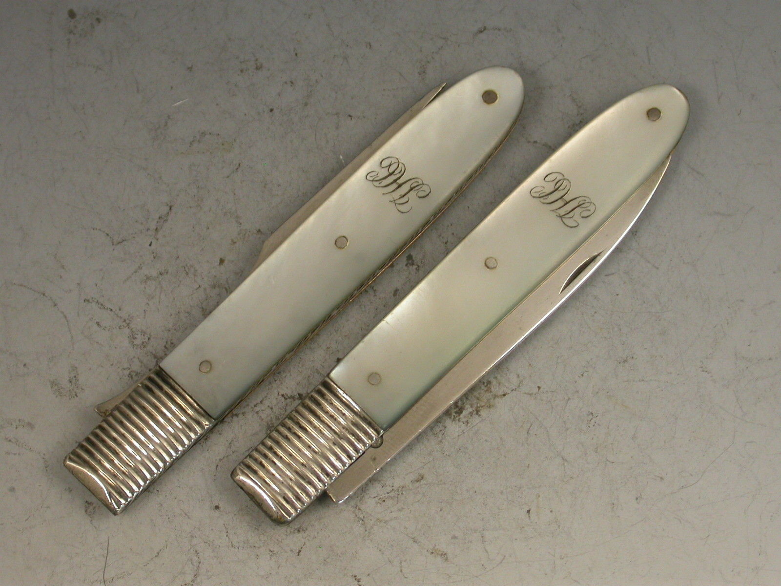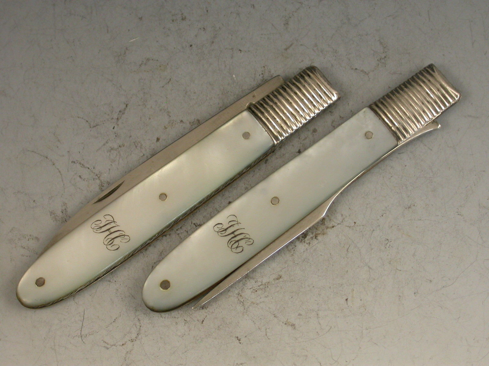 A good cased pair of George III silver and mother of pearl folding Fruit Knife and Fork, the plain mother of pearl handles engraved with initials, the plain silver blades stamped with George III duty marks and lion passants only. Sheffield, c1800.