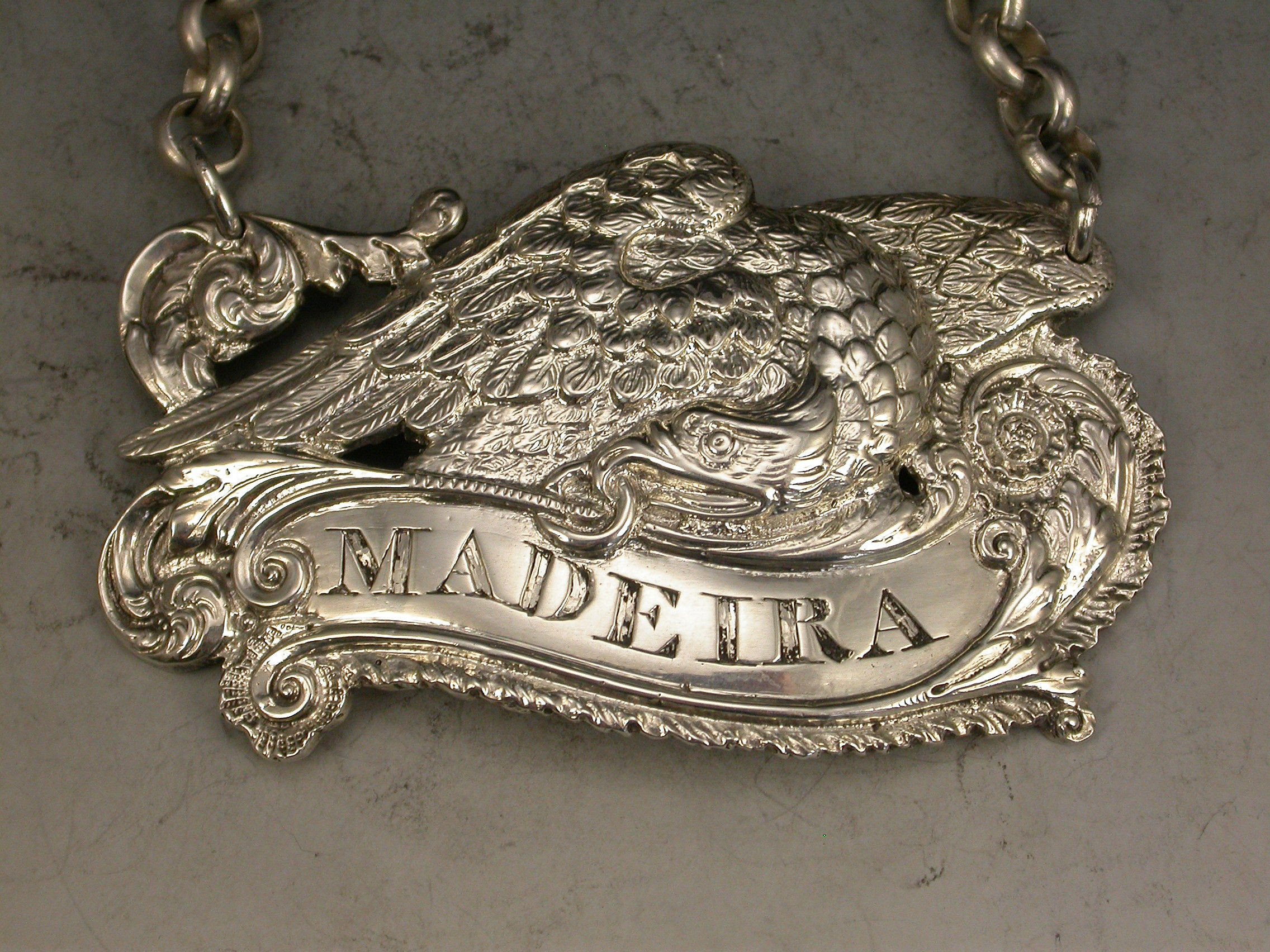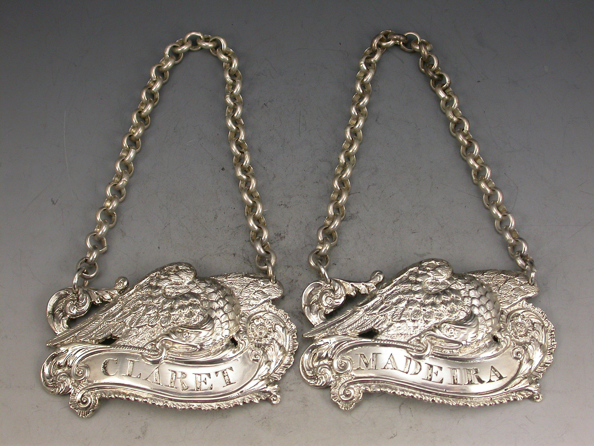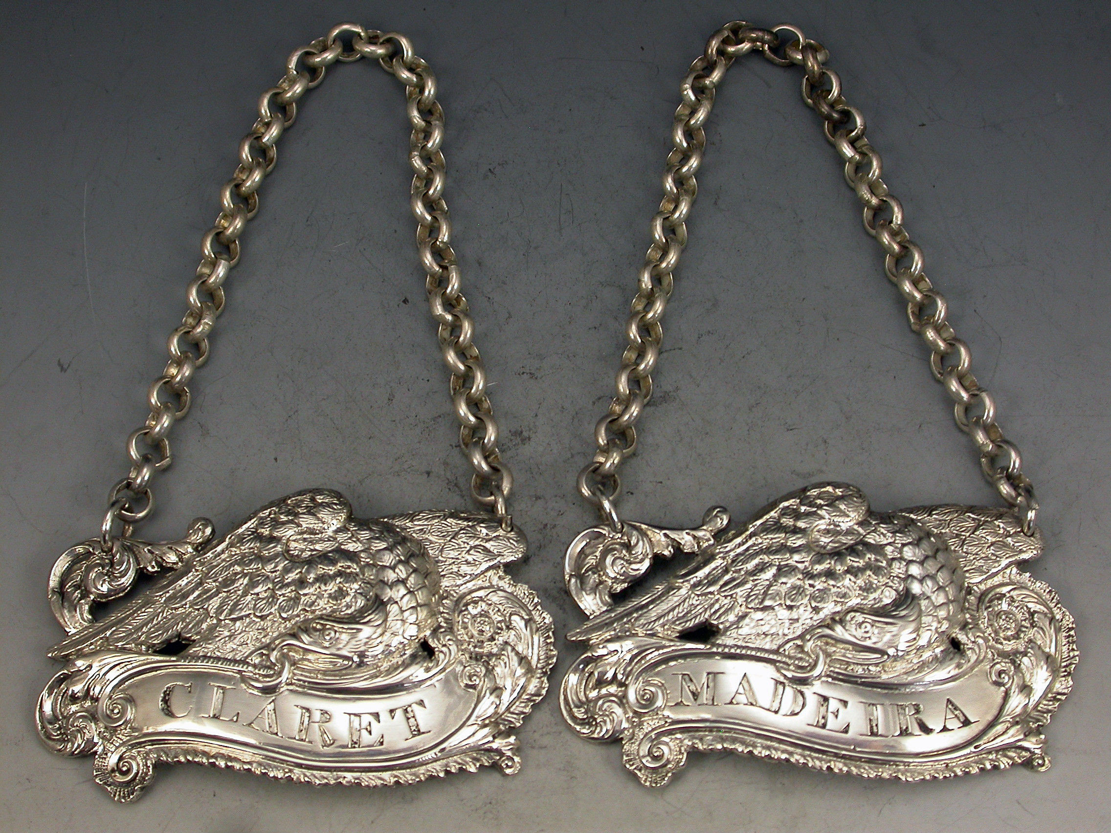 An extremely fine and rare pair of George III cast silver Armorial Wine Labels depicting Eagles holding scrolled name plates in their beaks with suspension rings and incised for CLARET & MADEIRA, acanthus leaf and shell ends to the scrolls and feathered borders.