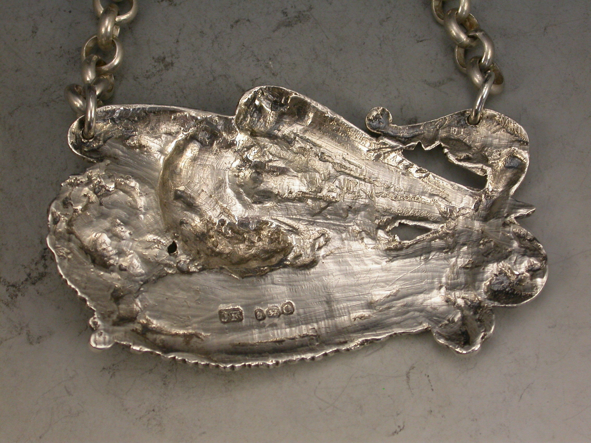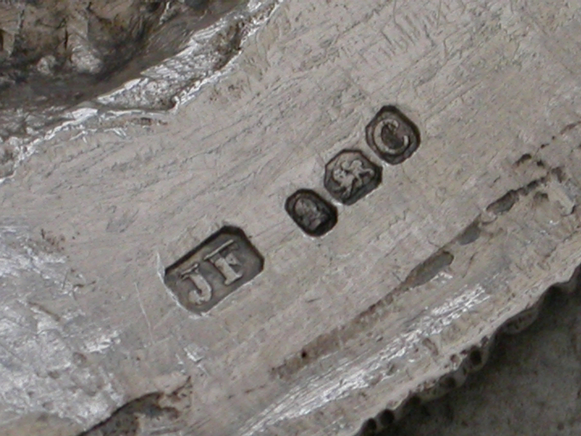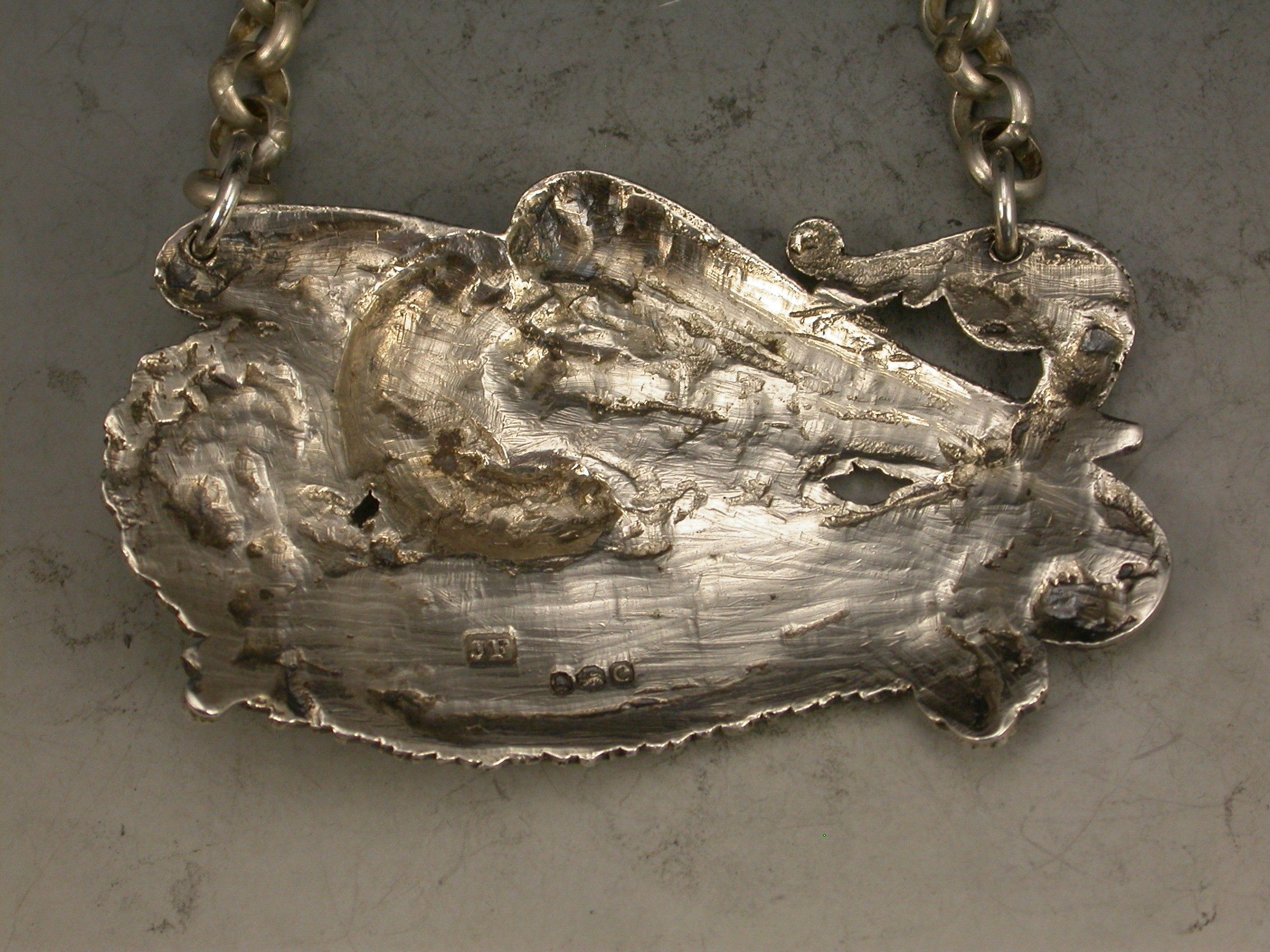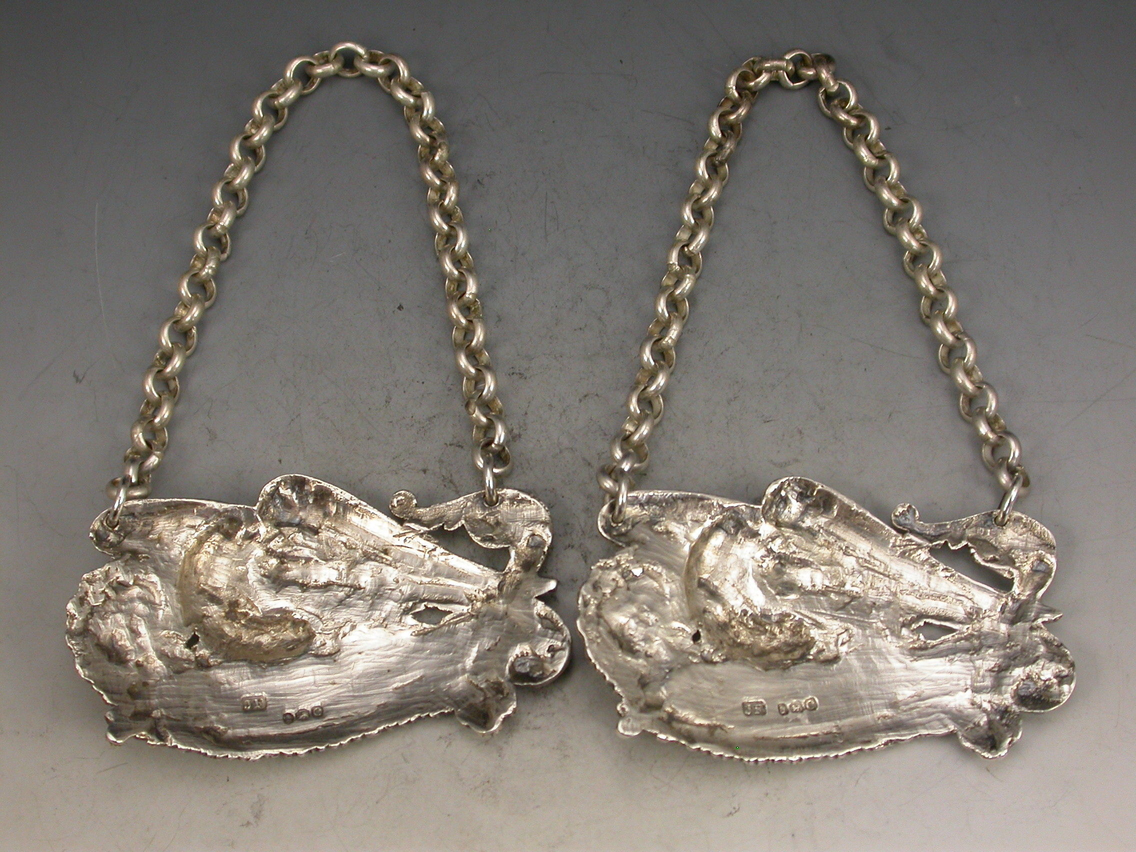An extremely fine and rare pair of George III cast silver Armorial Wine Labels depicting Eagles holding scrolled name plates in their beaks with suspension rings and incised for CLARET & MADEIRA, acanthus leaf and shell ends to the scrolls and feathered borders.