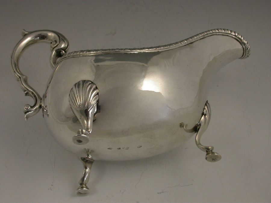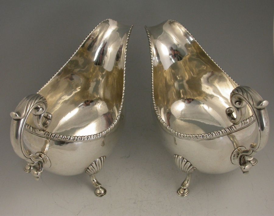 A good pair of George III large Irish Sauce Boats, the plain bodies with gadrooned rims and leaf capped scroll handles, standing on three hoof feet.