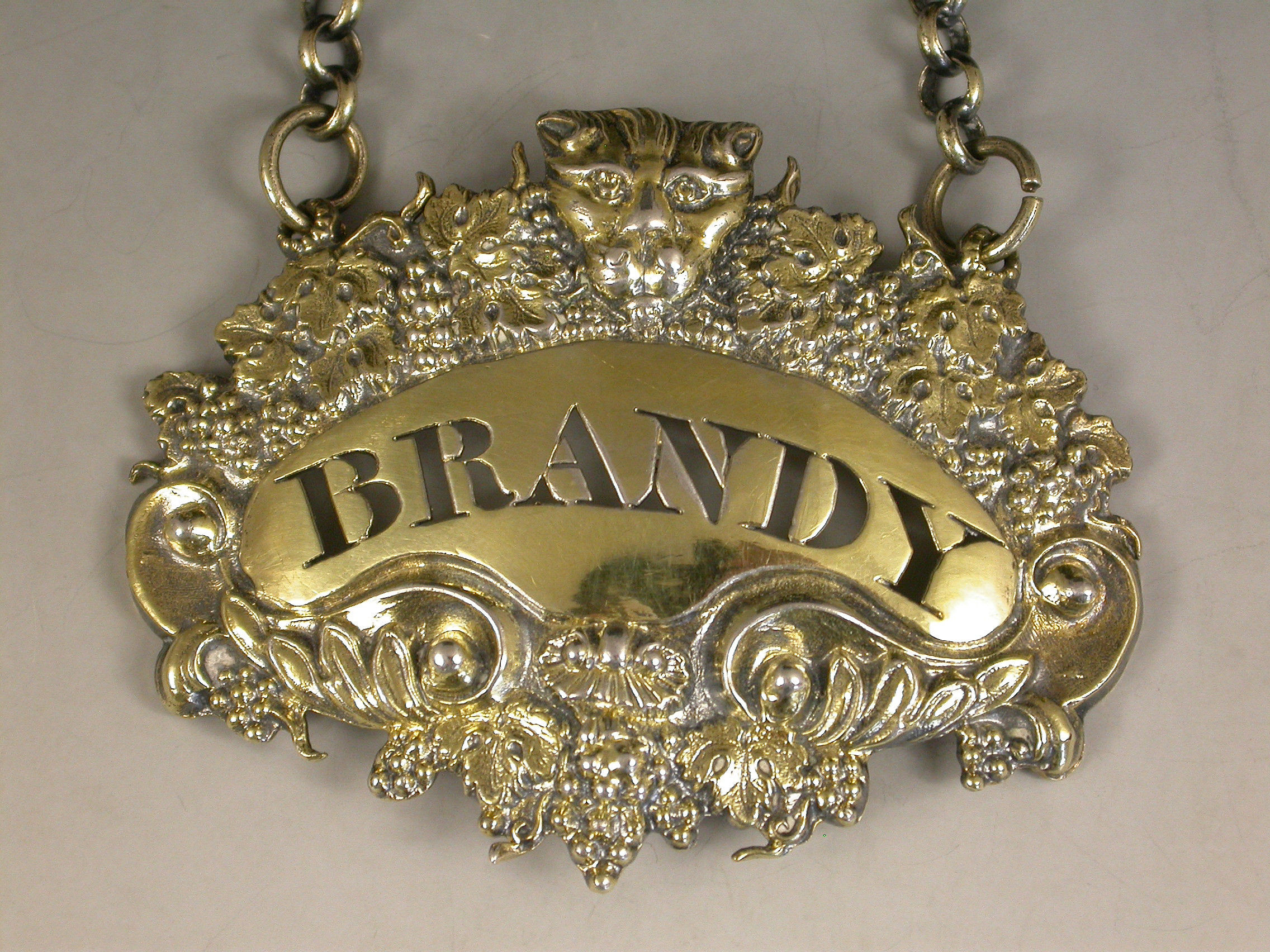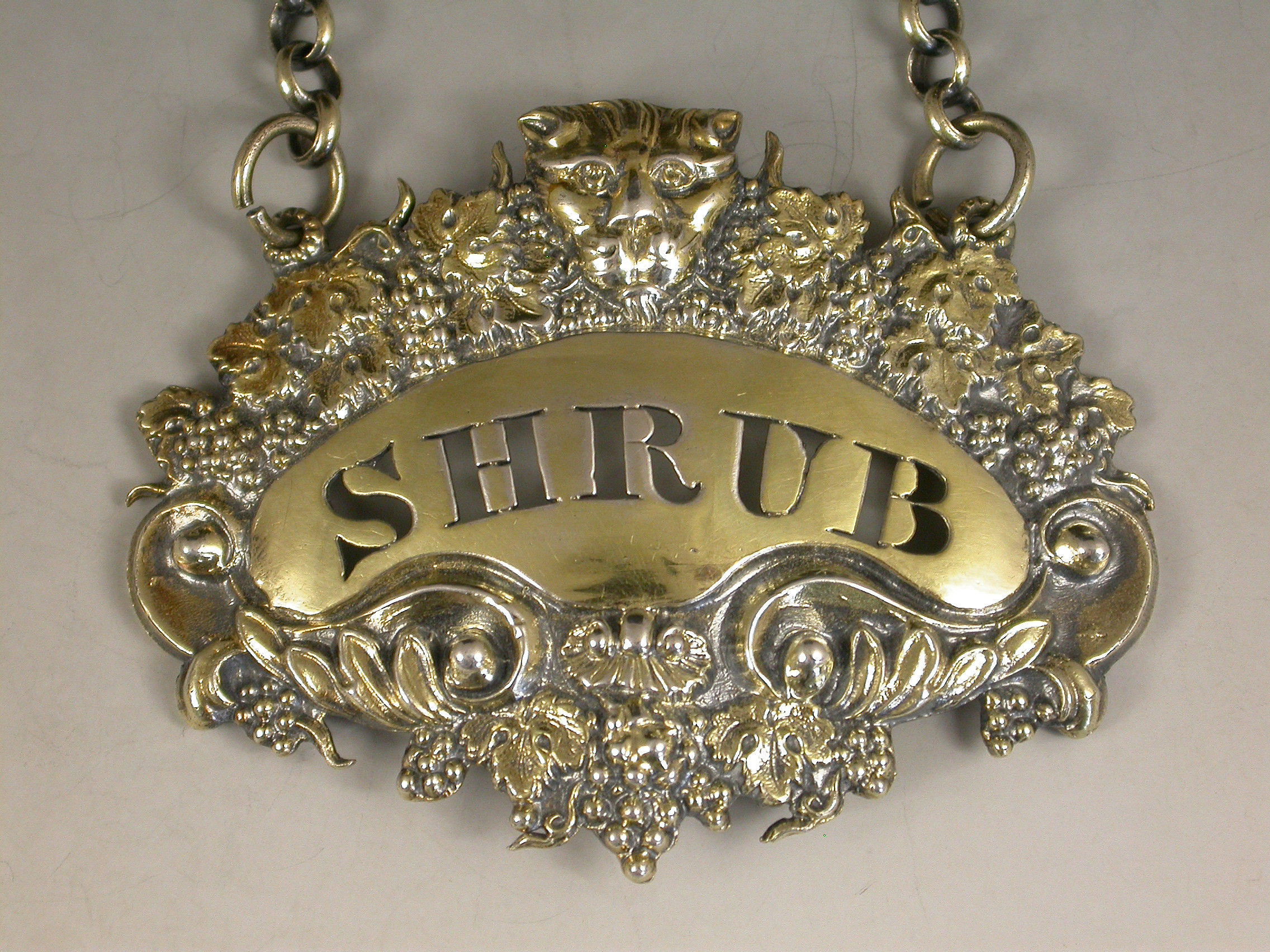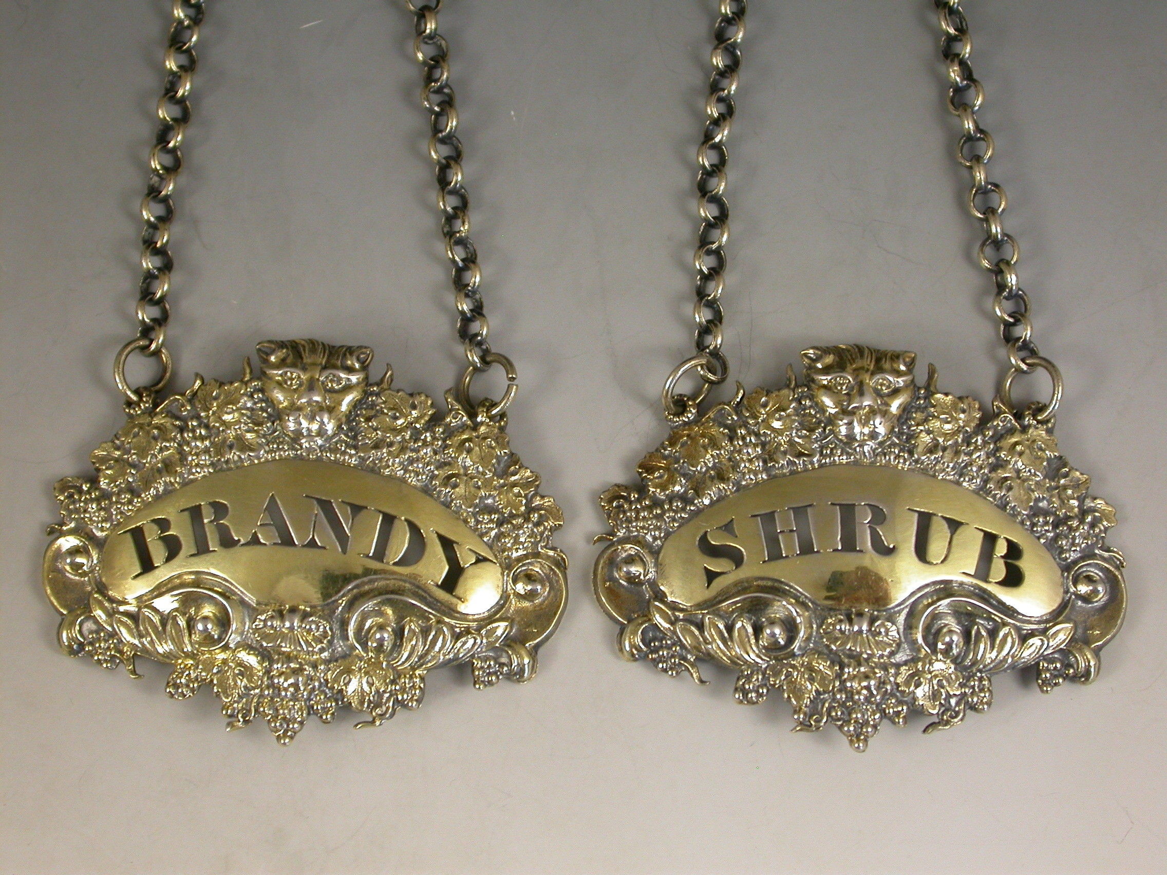 Pair George III Silver Gilt Leopards Head Wine Labels 'Shrub & Brandy'