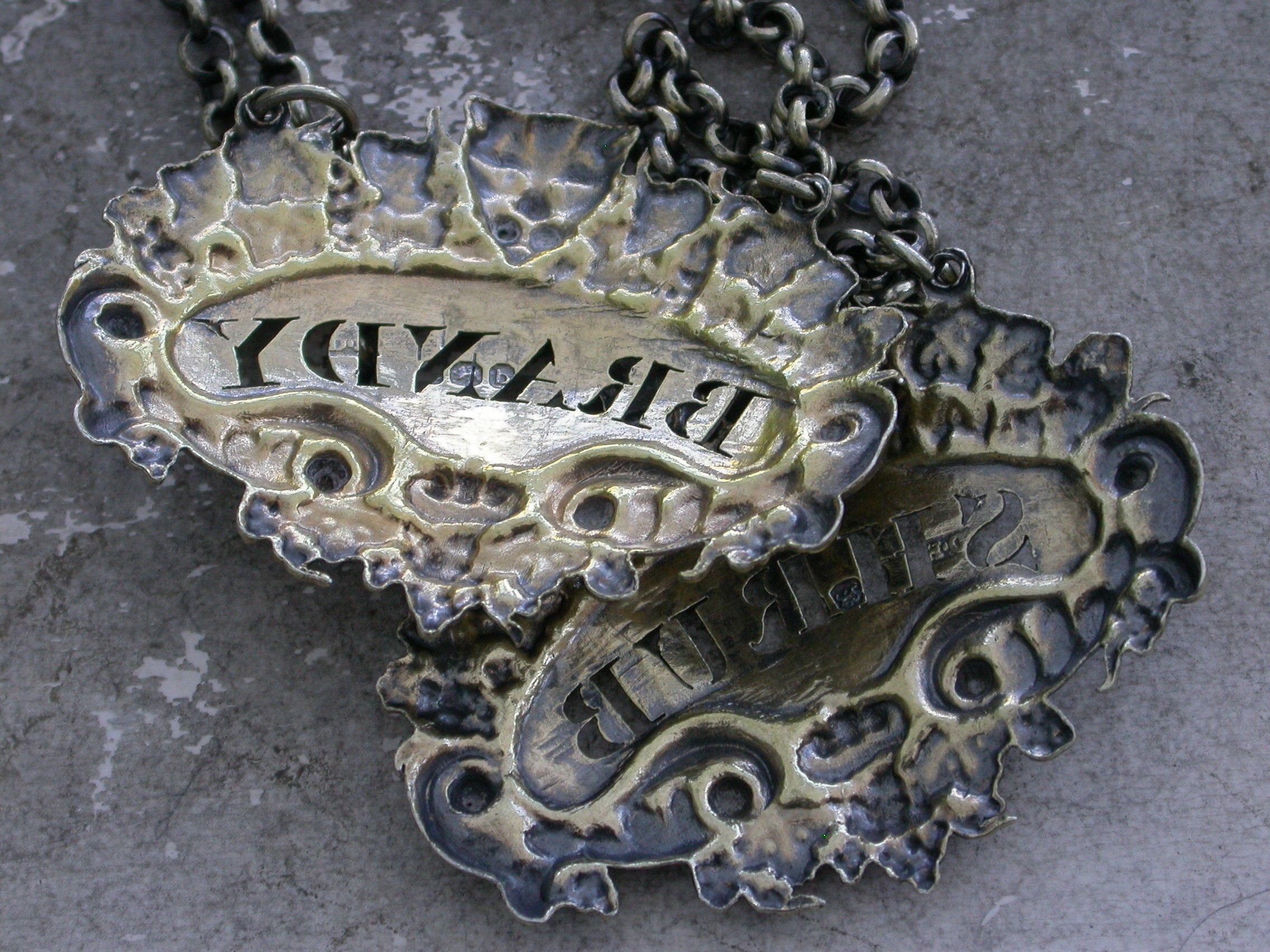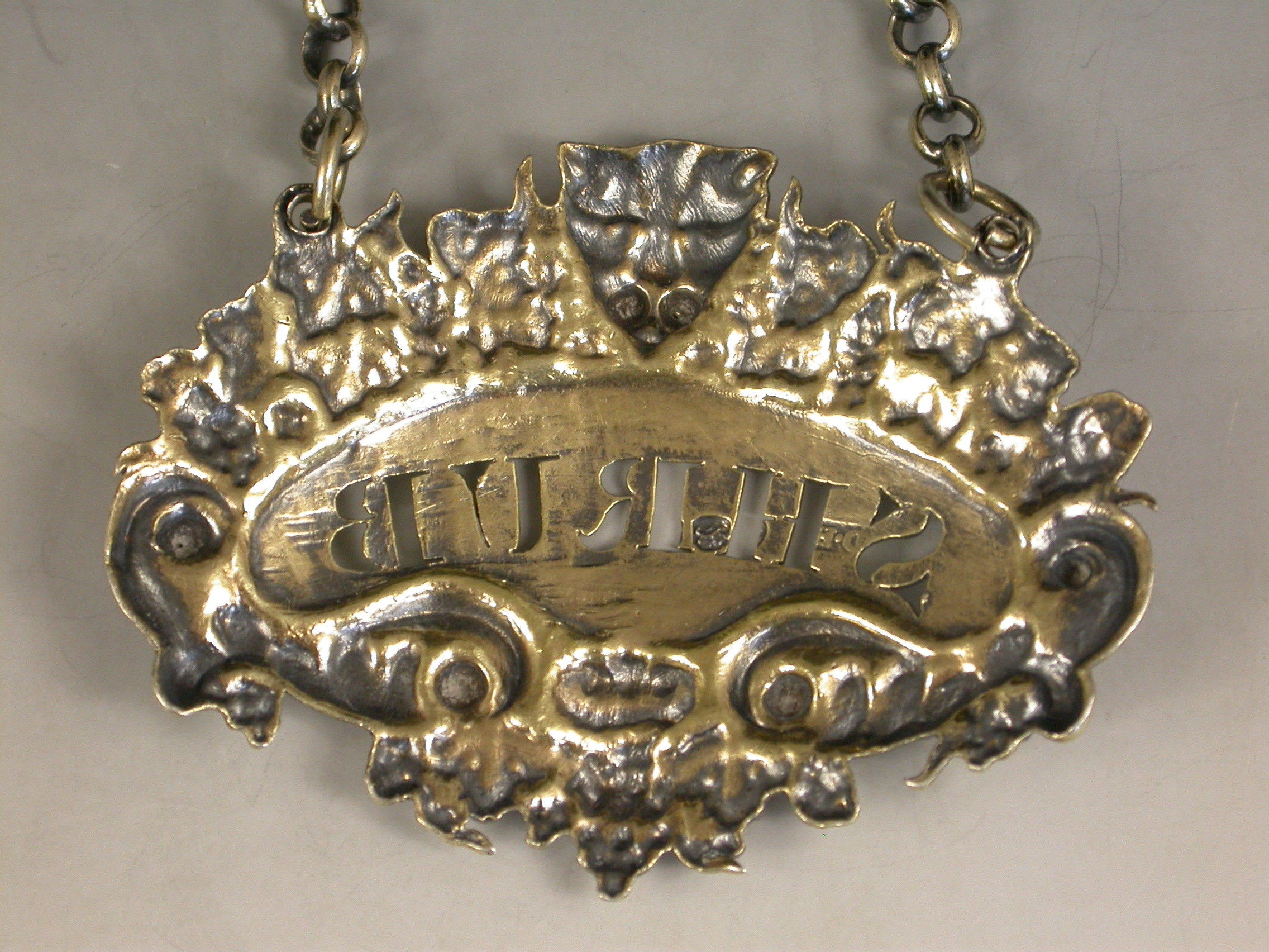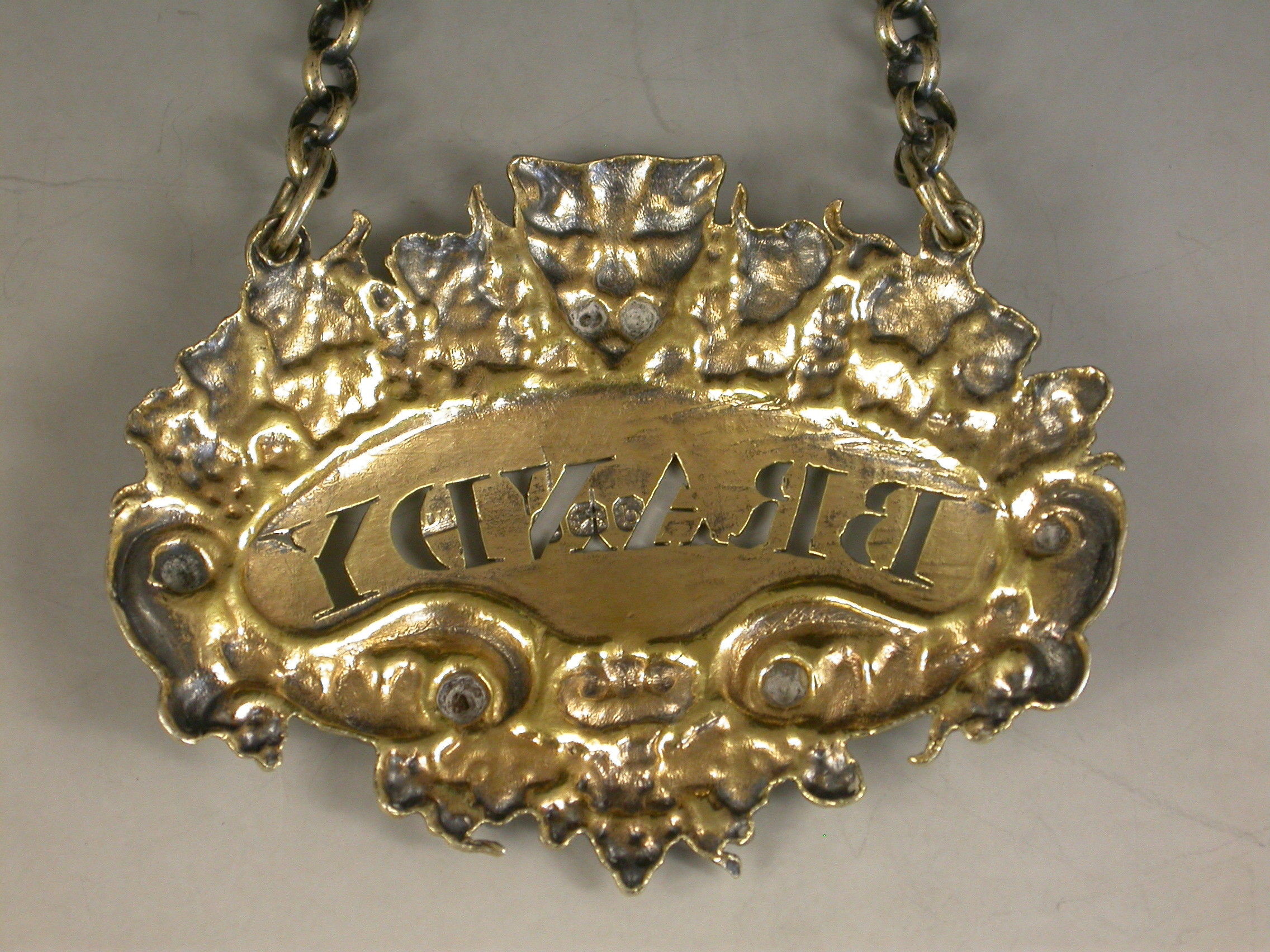 Pair George III Silver Gilt Leopards Head Wine Labels 'Shrub & Brandy'
