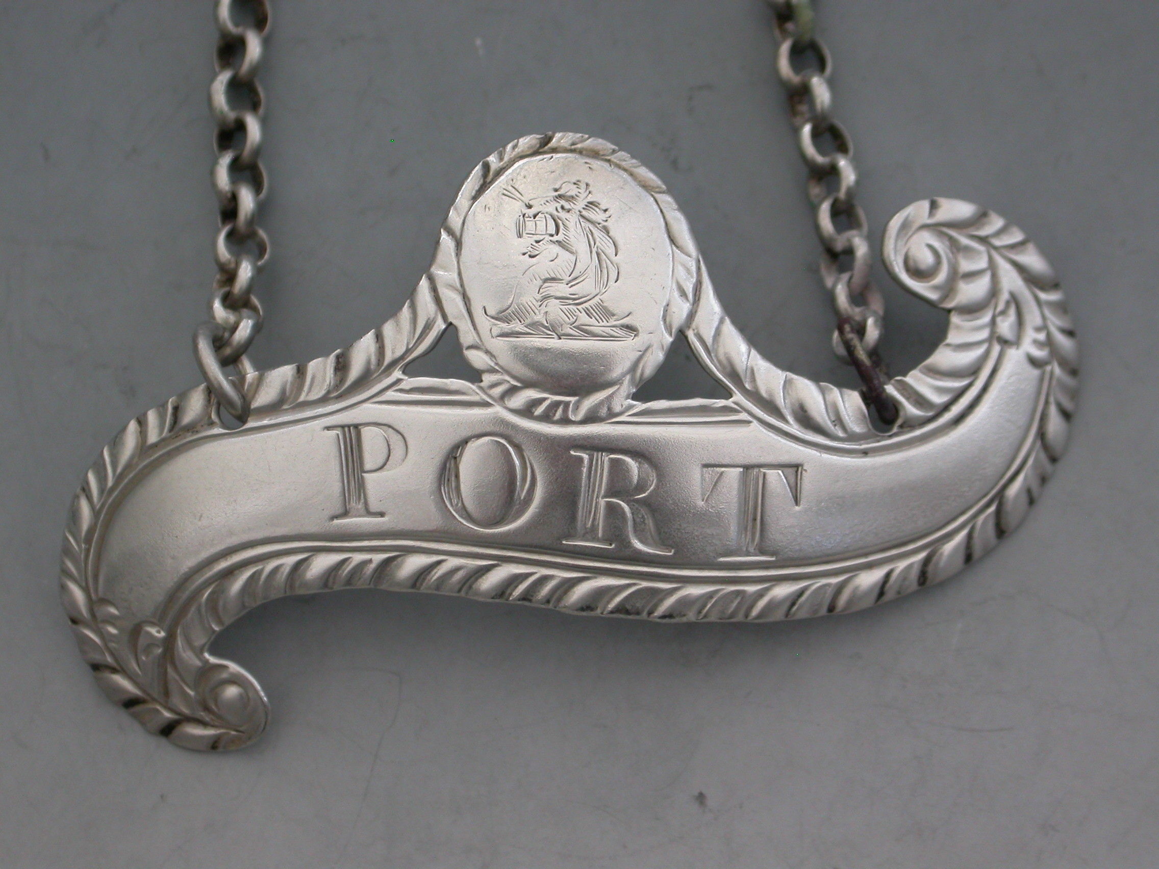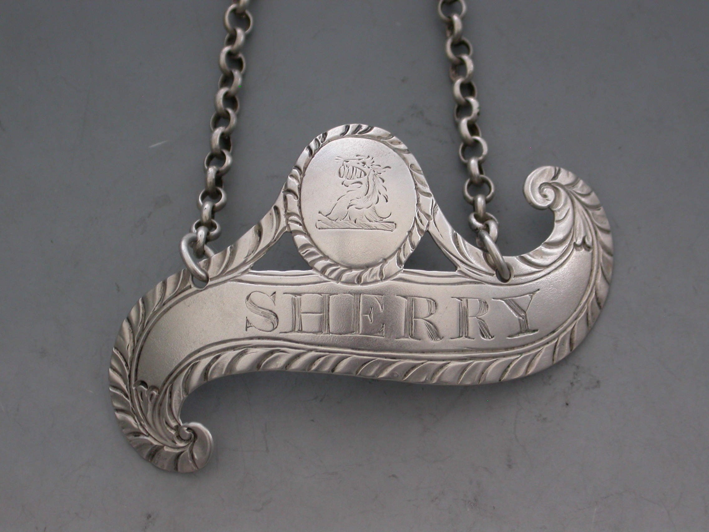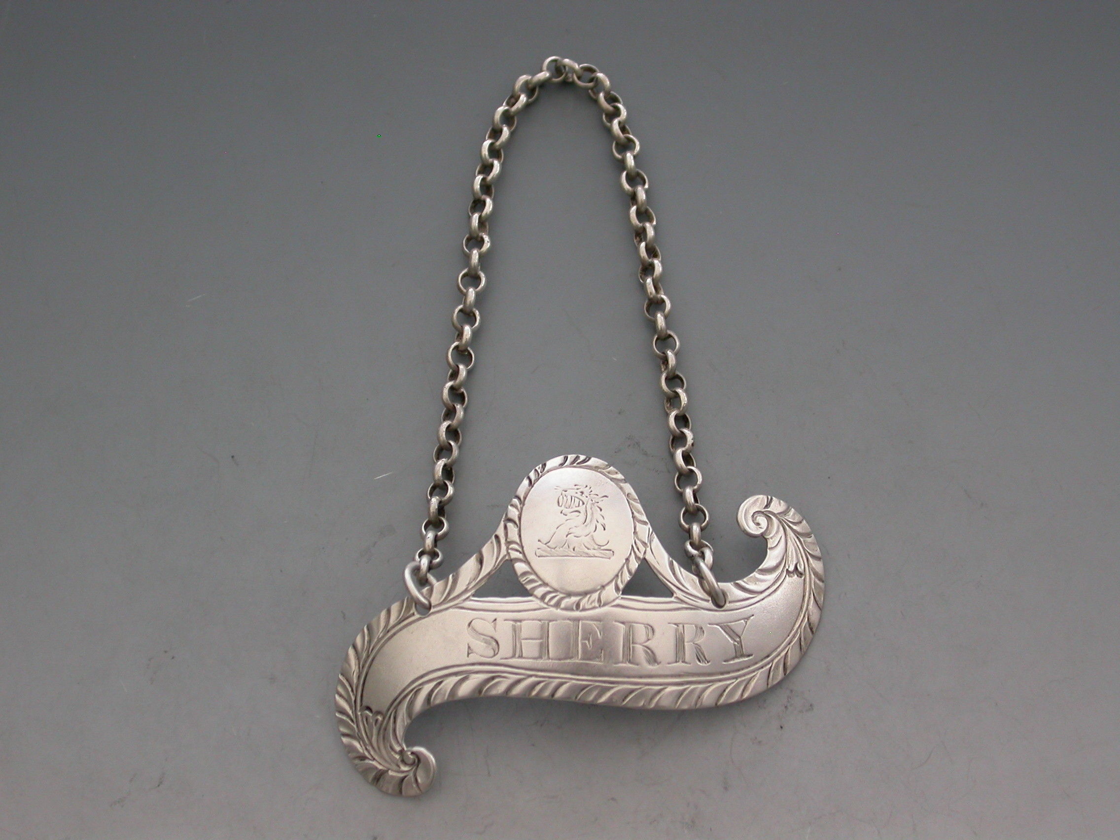 Pair George III Silver Scroll Wine Labels 'Sherry & Port' Crest of Eyton