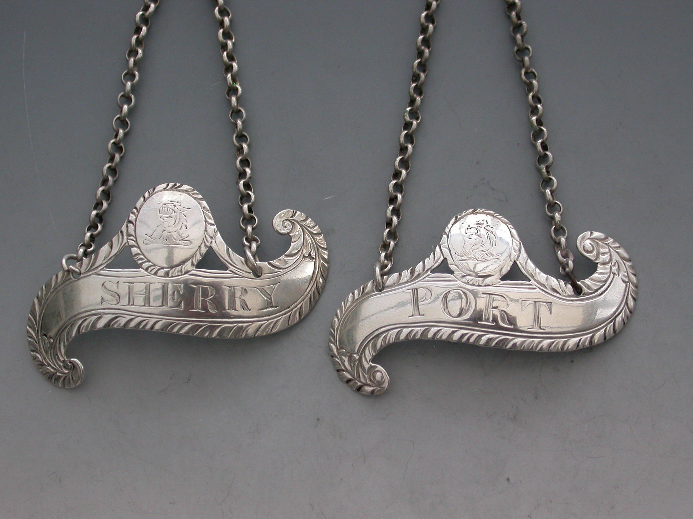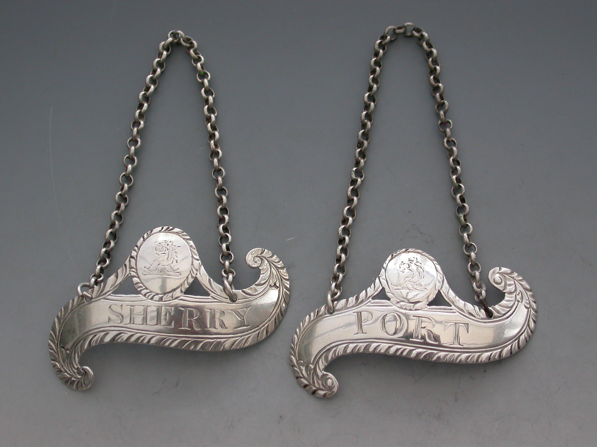 A good pair of George III silver Wine Labels of scroll form with feather edge borders and oval cartouches above engraved with crests depicting lions heads devouring tons, probably for Eyton of Shropshire. The names plates for Sherry and Port.