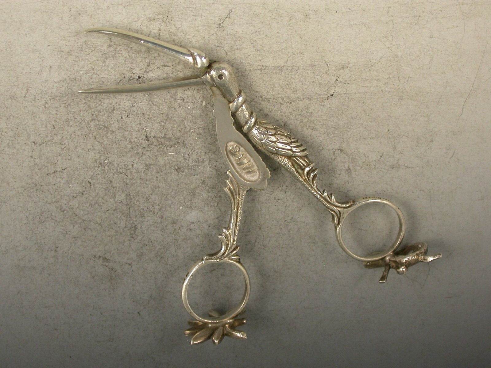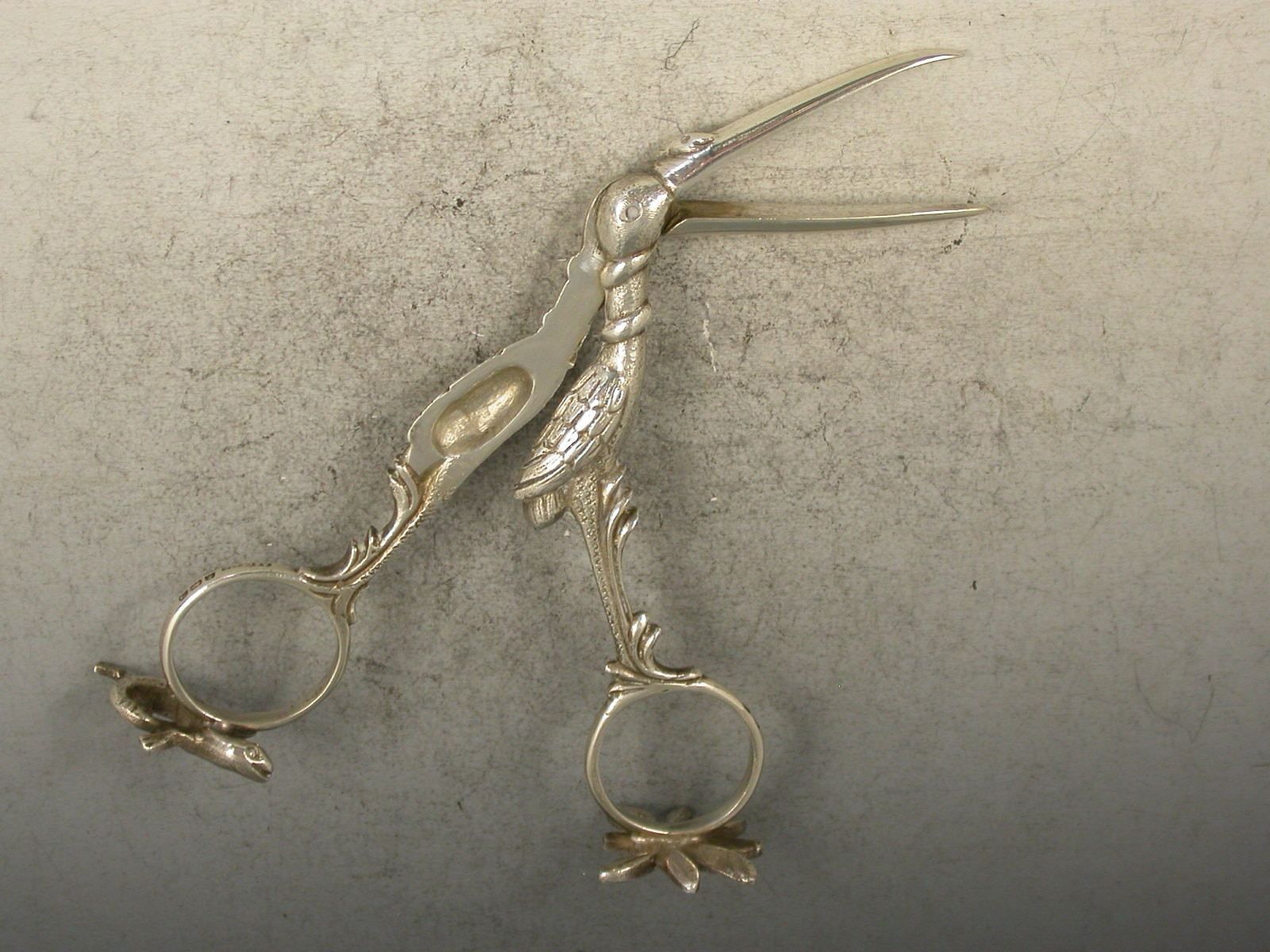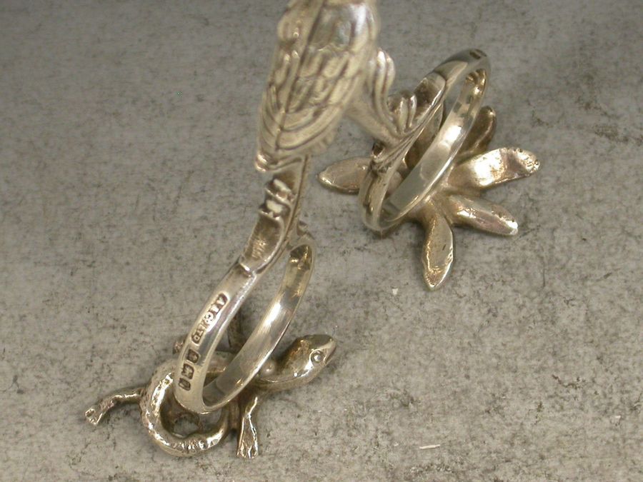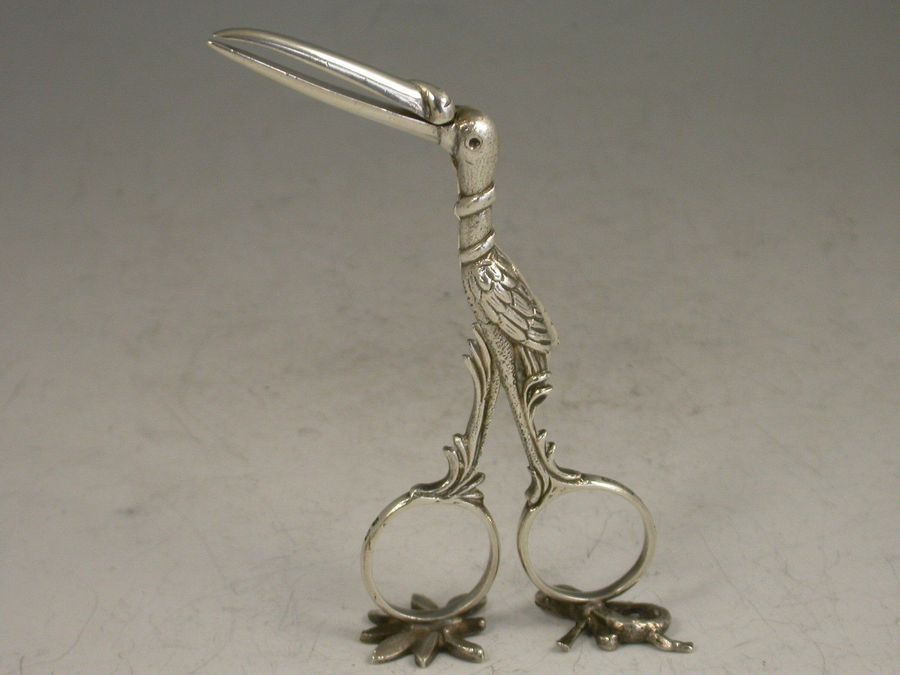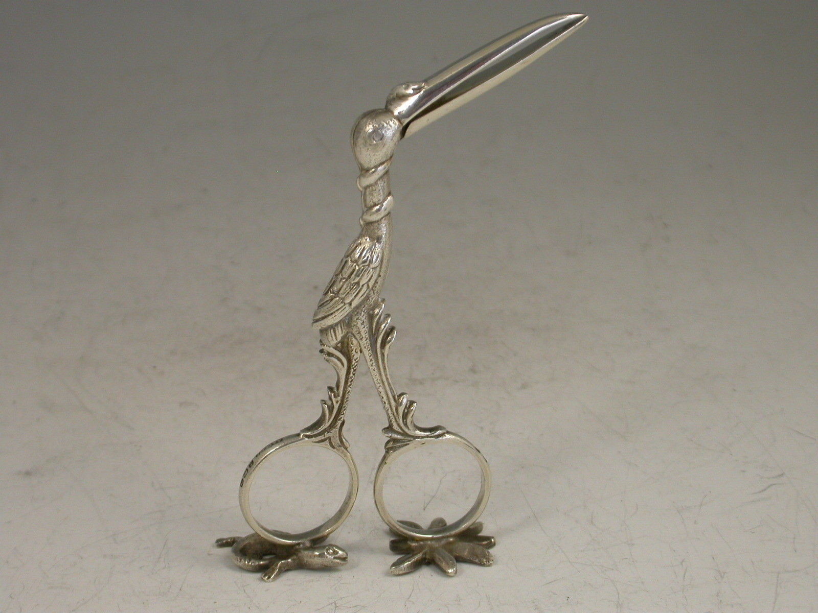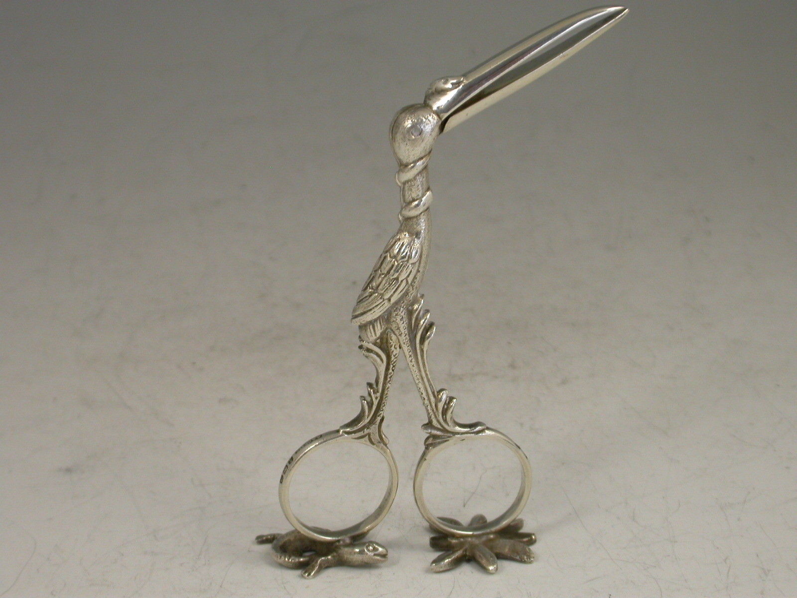 A good pair of George V cast silver Ribbon Threaders made in the form of a Stock, with feathered legs and a snake wrapped around its neck and beak, a baby in swaddling clothes to the interior, standing on two cast supports depicting a lizard and a leaf.