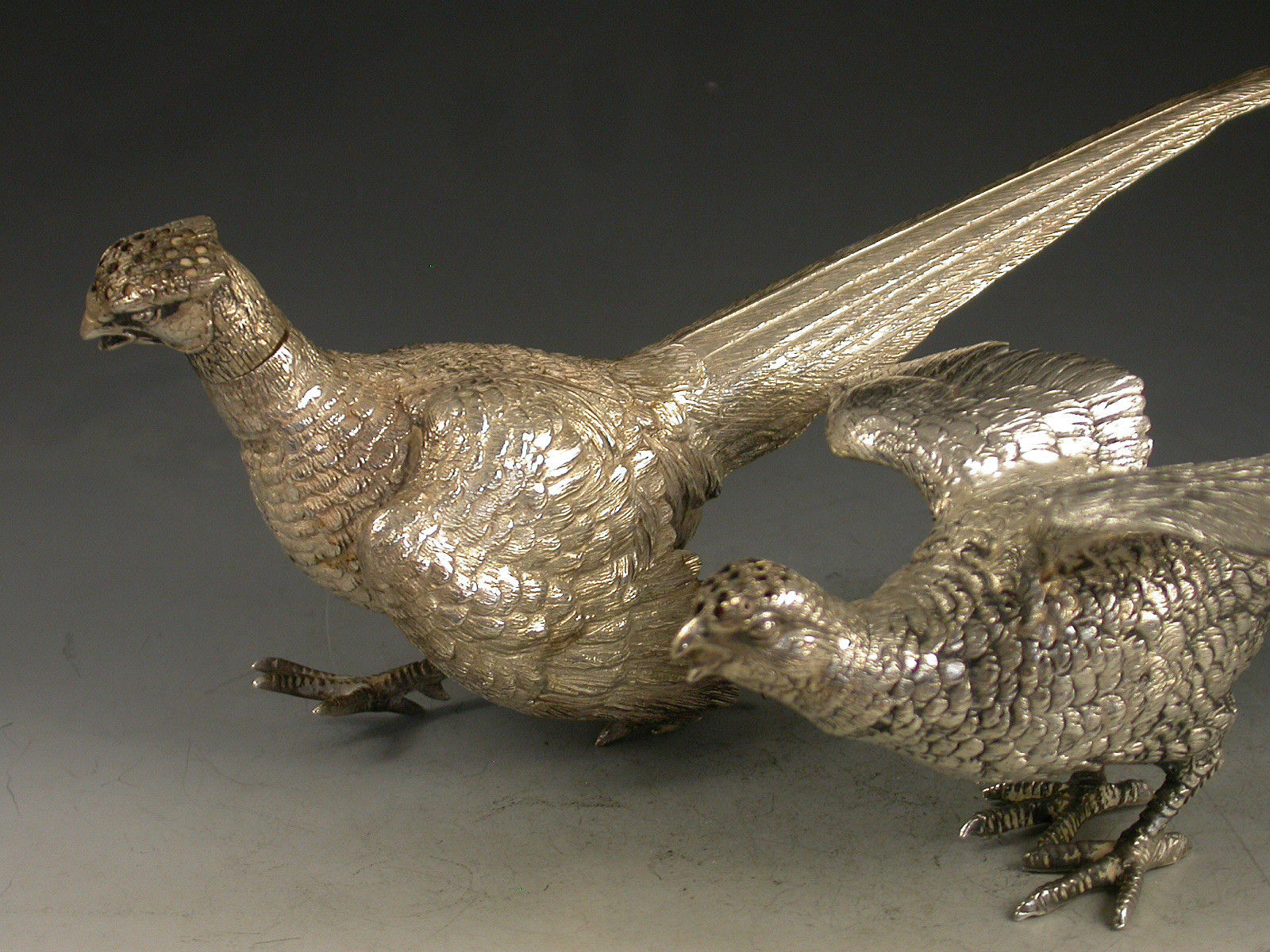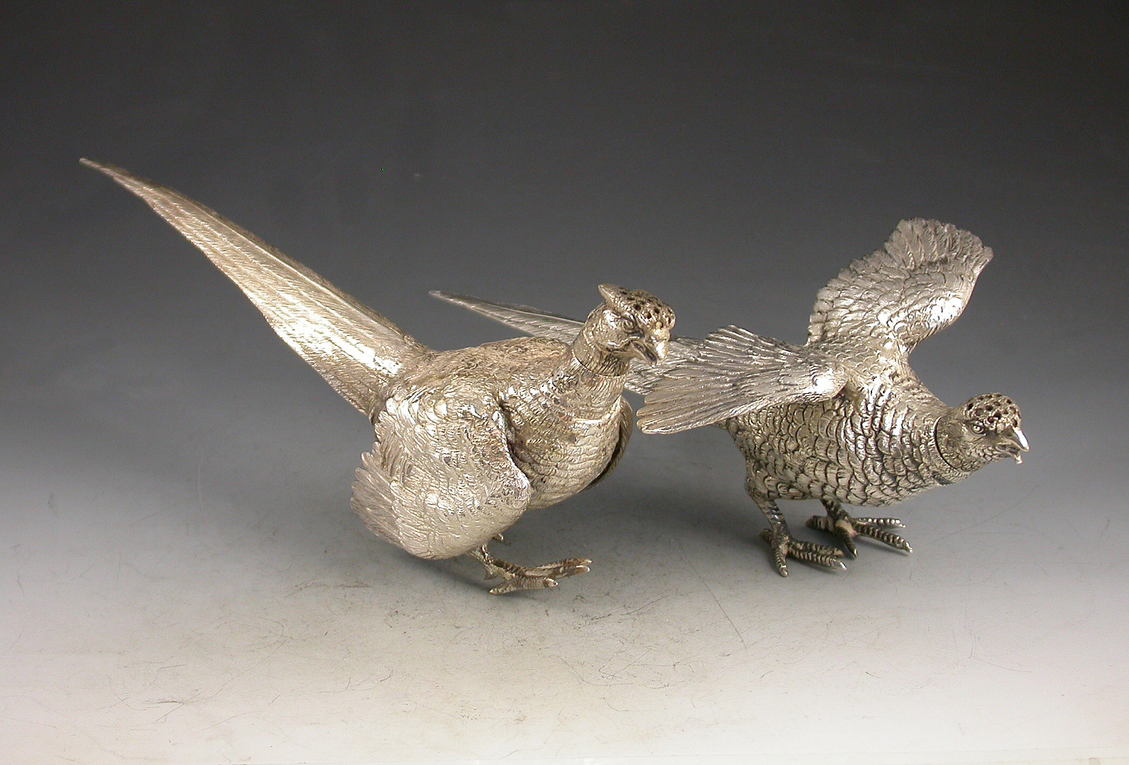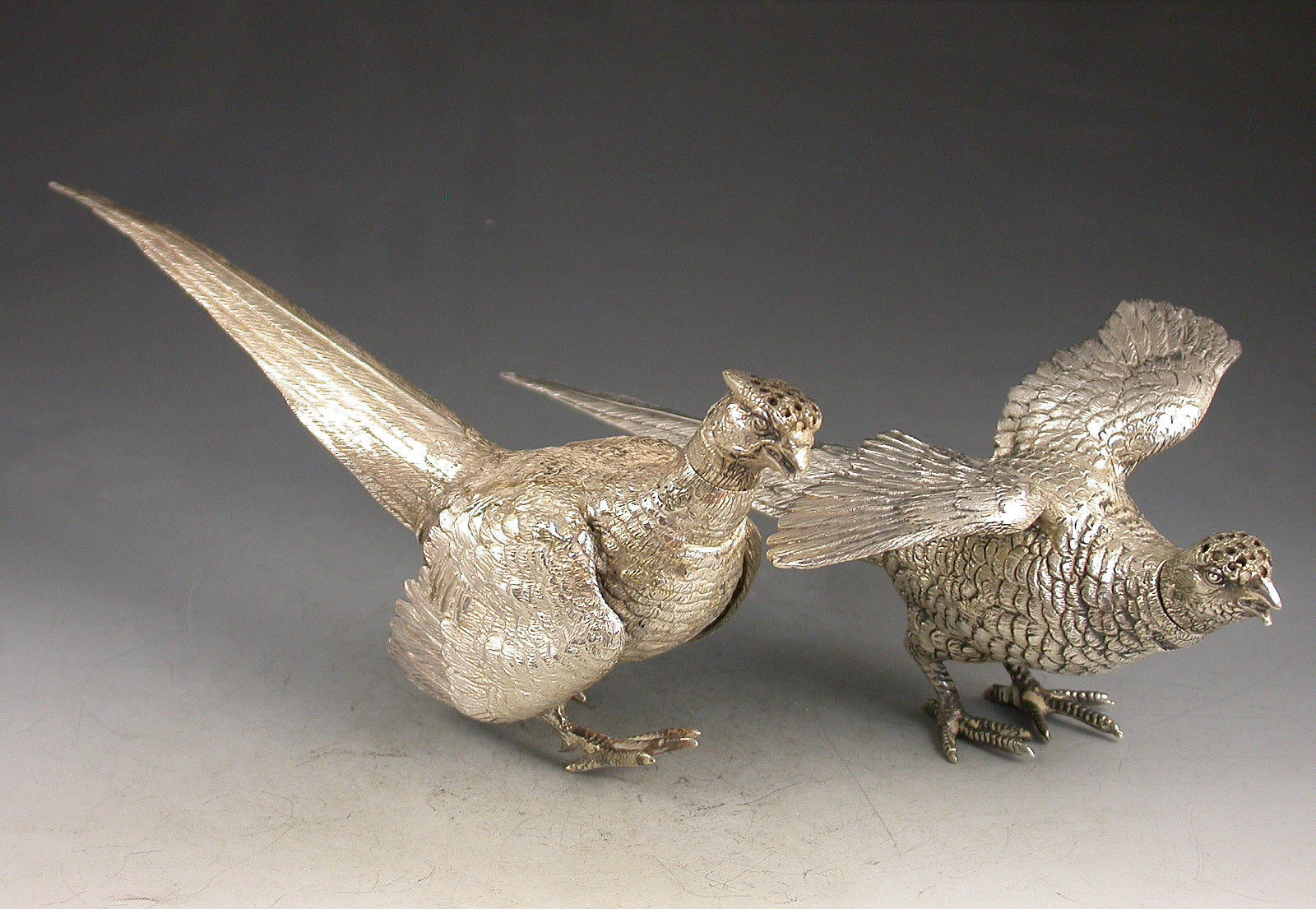 A good quality pair of George V novelty silver Peppers made in the form of a Cock and a Hen Pheasant with pierced pull off heads.