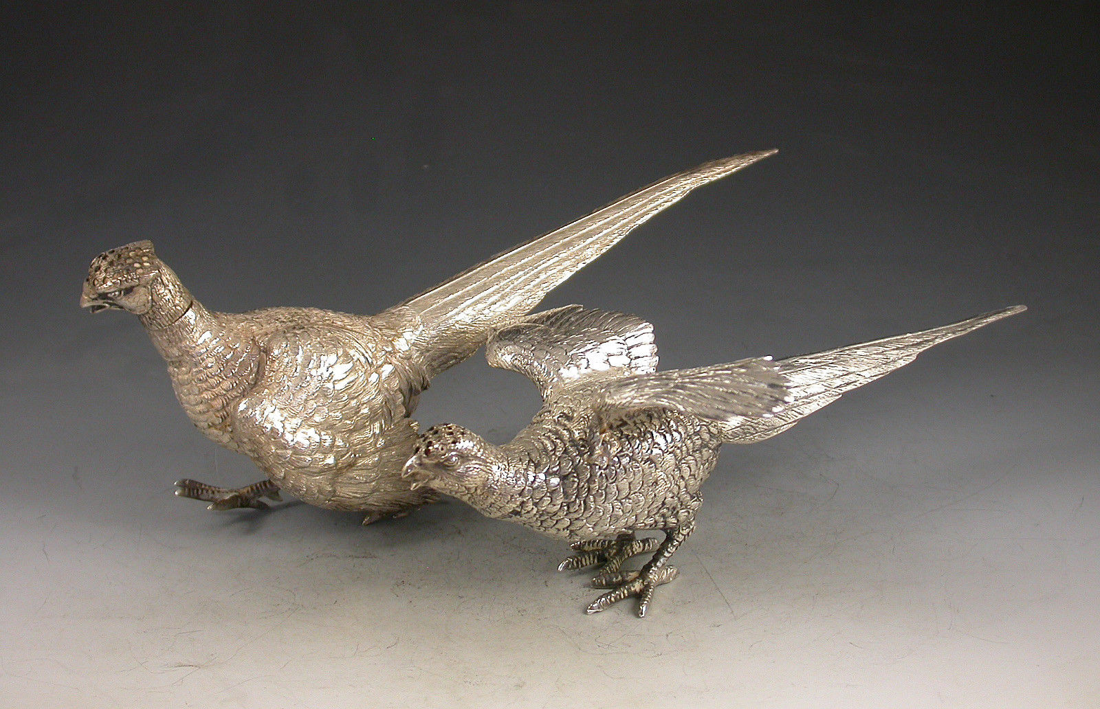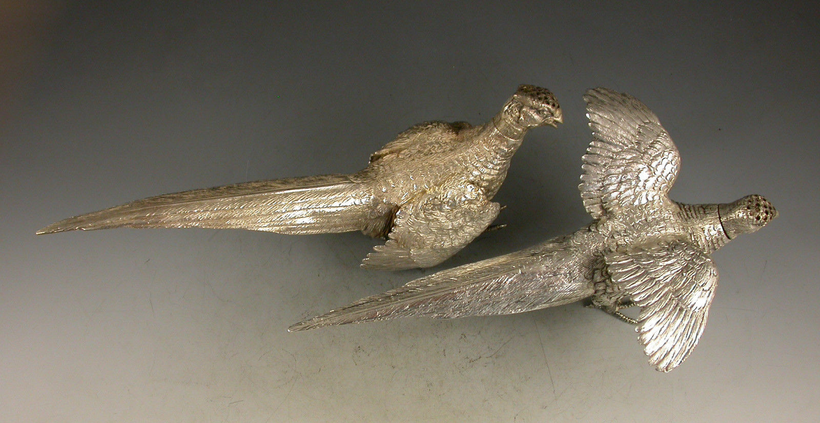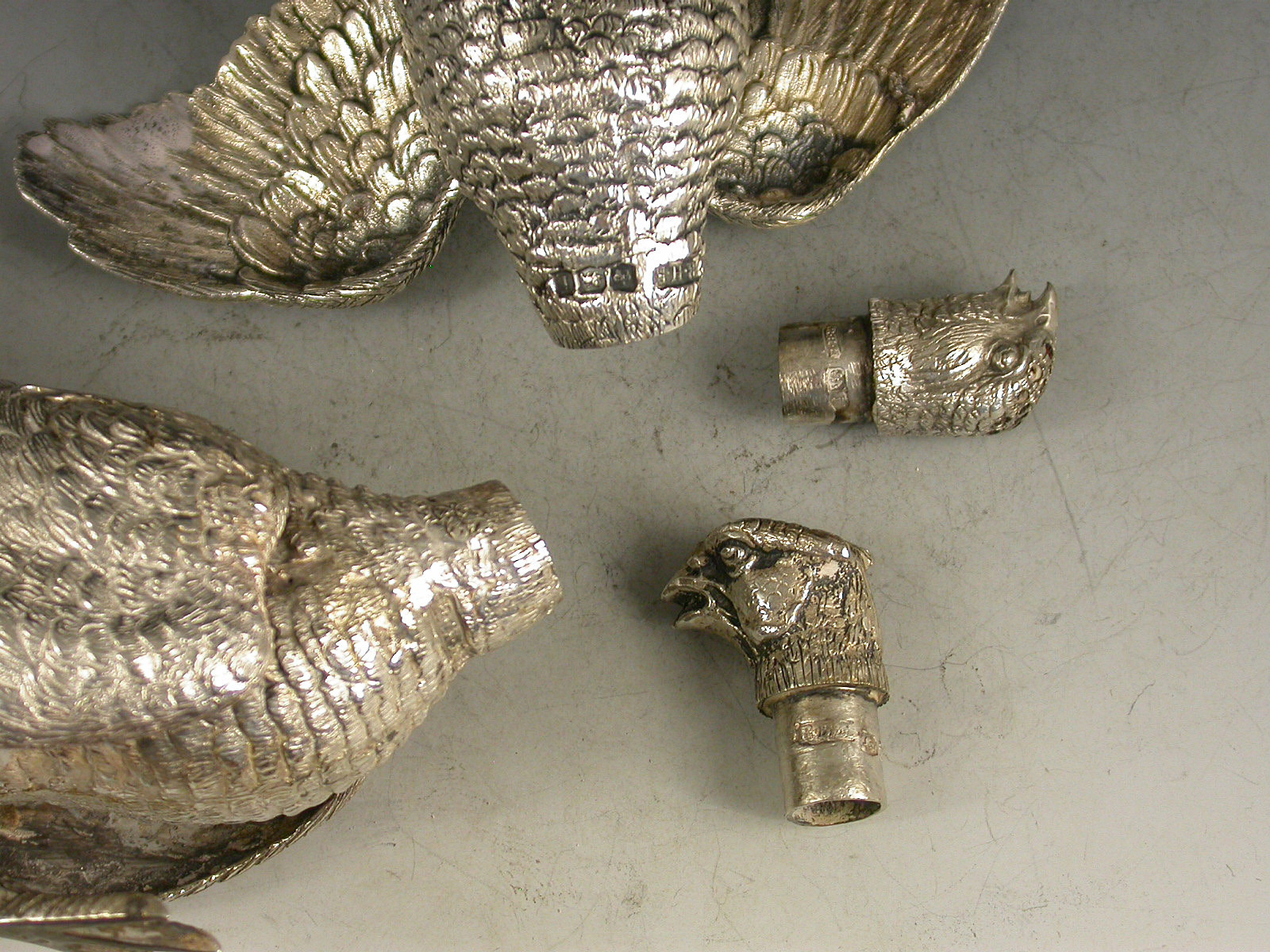 A good quality pair of George V novelty silver Peppers made in the form of a Cock and a Hen Pheasant with pierced pull off heads.