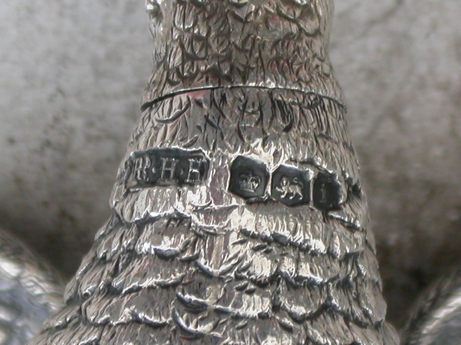 Pair George V Novelty Antique Silver Pheasant Peppers