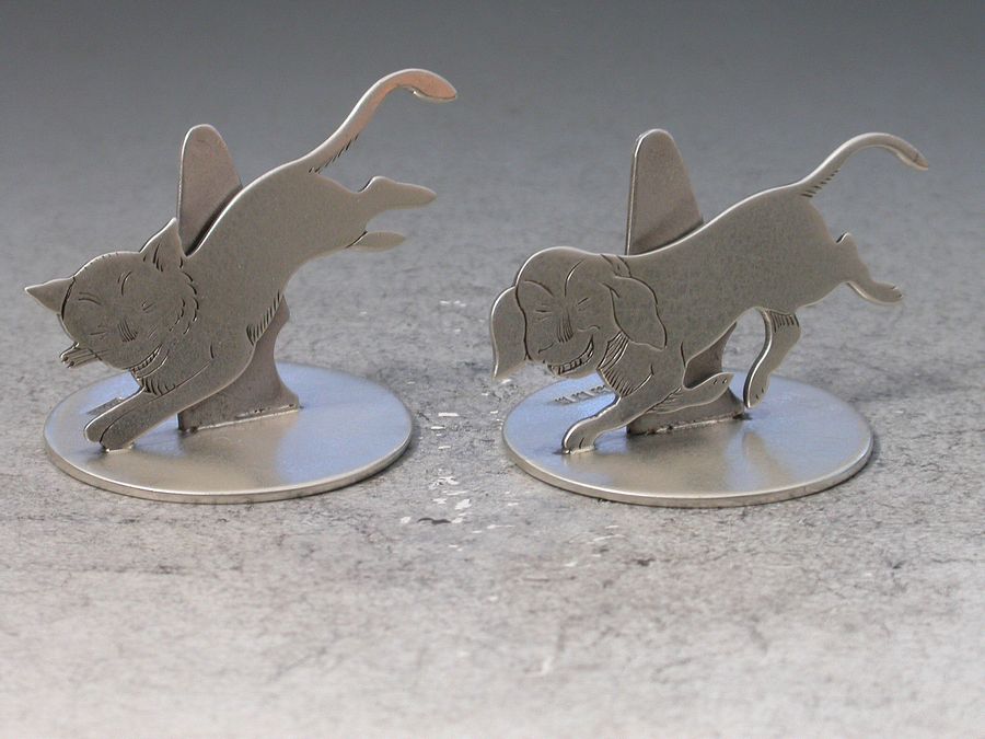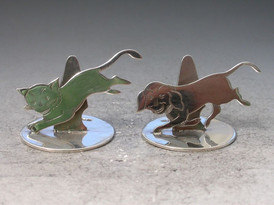 Pair George V Novelty Silver Dog & Cat Menu Holders Benjamin Rabier