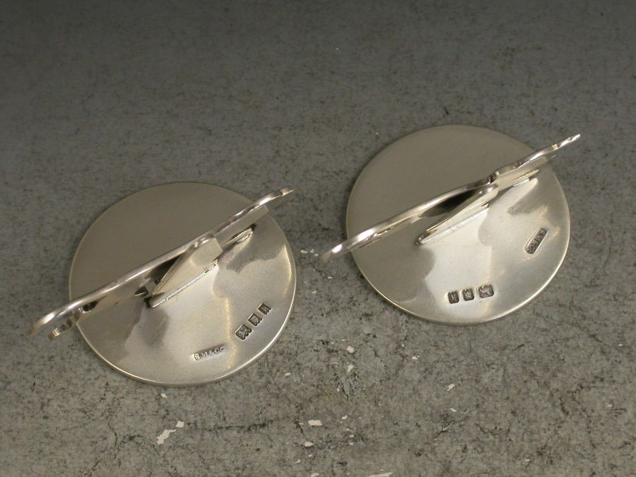 A rare pair of George V novelty silver Menu Holders formed as a comical cat and dog, after a design by Benjamin Rabier. On flat circular bases.
