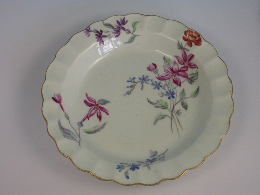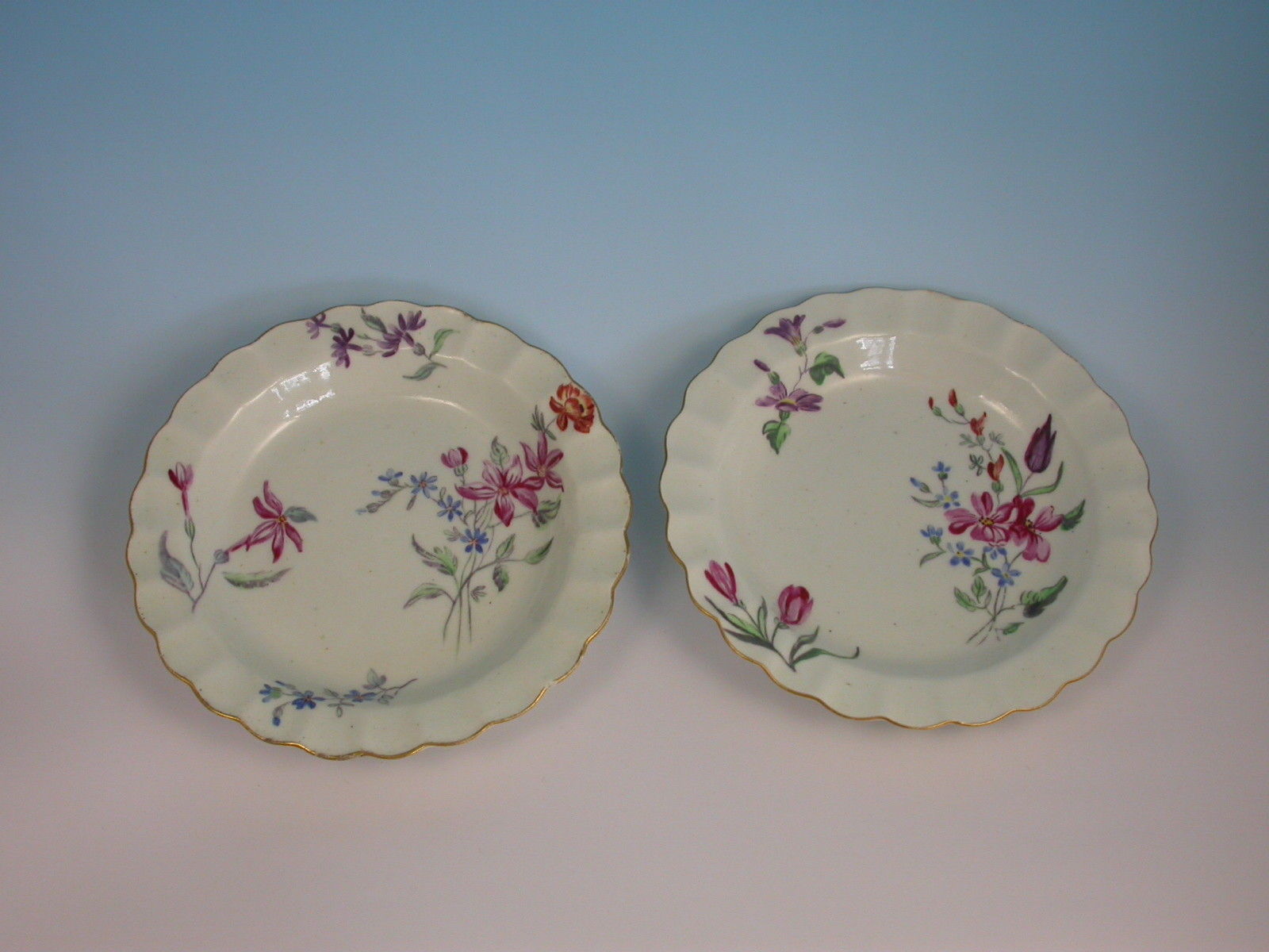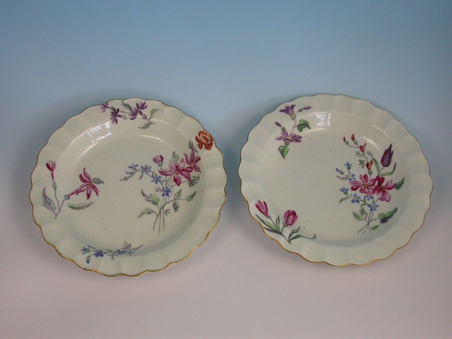 A good pair of First Period Worcester Dessert Plates of small size with fluted rims, painted at the London atelier of James Giles with delicate sprays of flowers within gilt line rims.