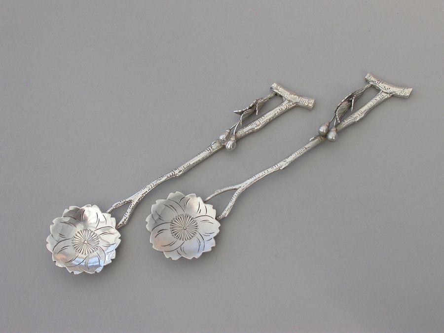 A pair of late 19th century Japanese naturalistic silver Teaspoons with flower head bowls and bamboo style handles adorned with foliage and fruit.