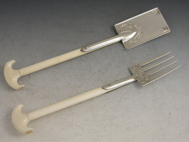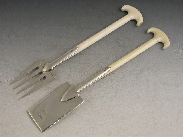A pair of Victorian novelty silver and ivory Servers formed as a garden Fork and Spade, the blades with bright cut engraved foliate decoration. The ends of the ivory handles unscrew to replicate original wooden ones of the period.