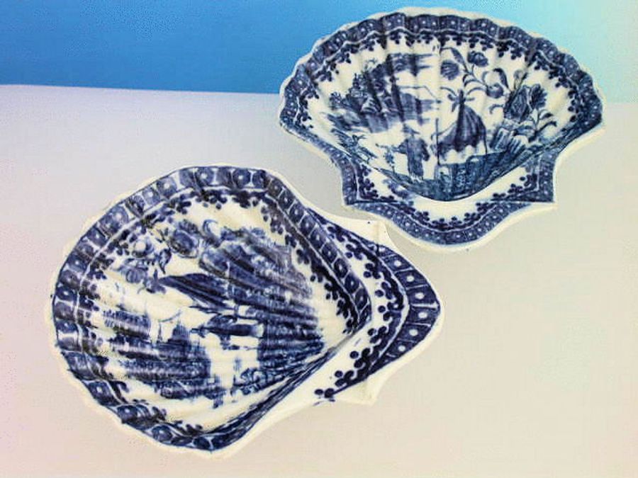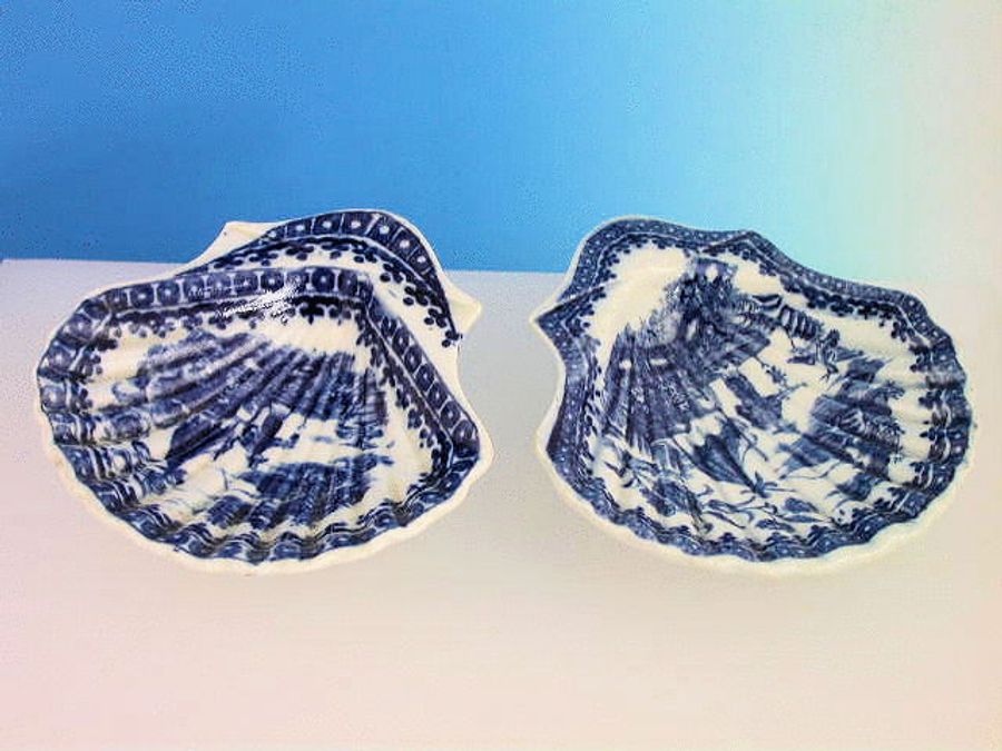 A fine pair of Caughley shell shape Pickle Dishes with thumb nail handles, printed in underglaze blue with a Fisherman pattern, within a cell and dot border.