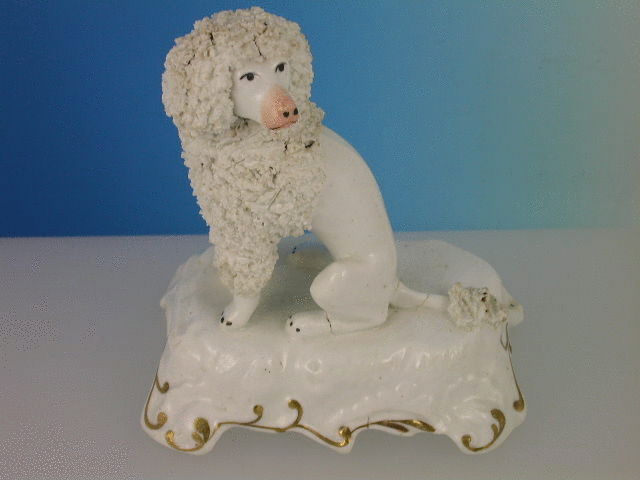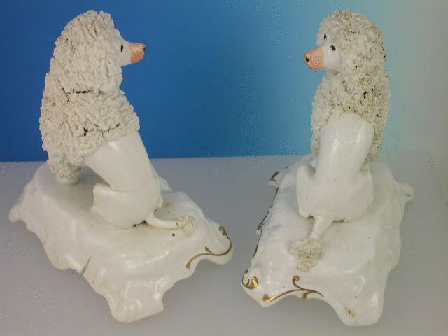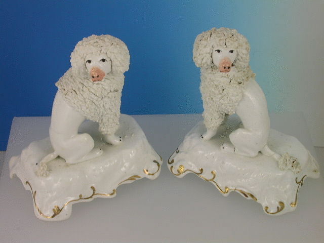 A fine pair of early 19th century Porcelainous Poodles, painted in coloured enamels, on scroll moulded bases.