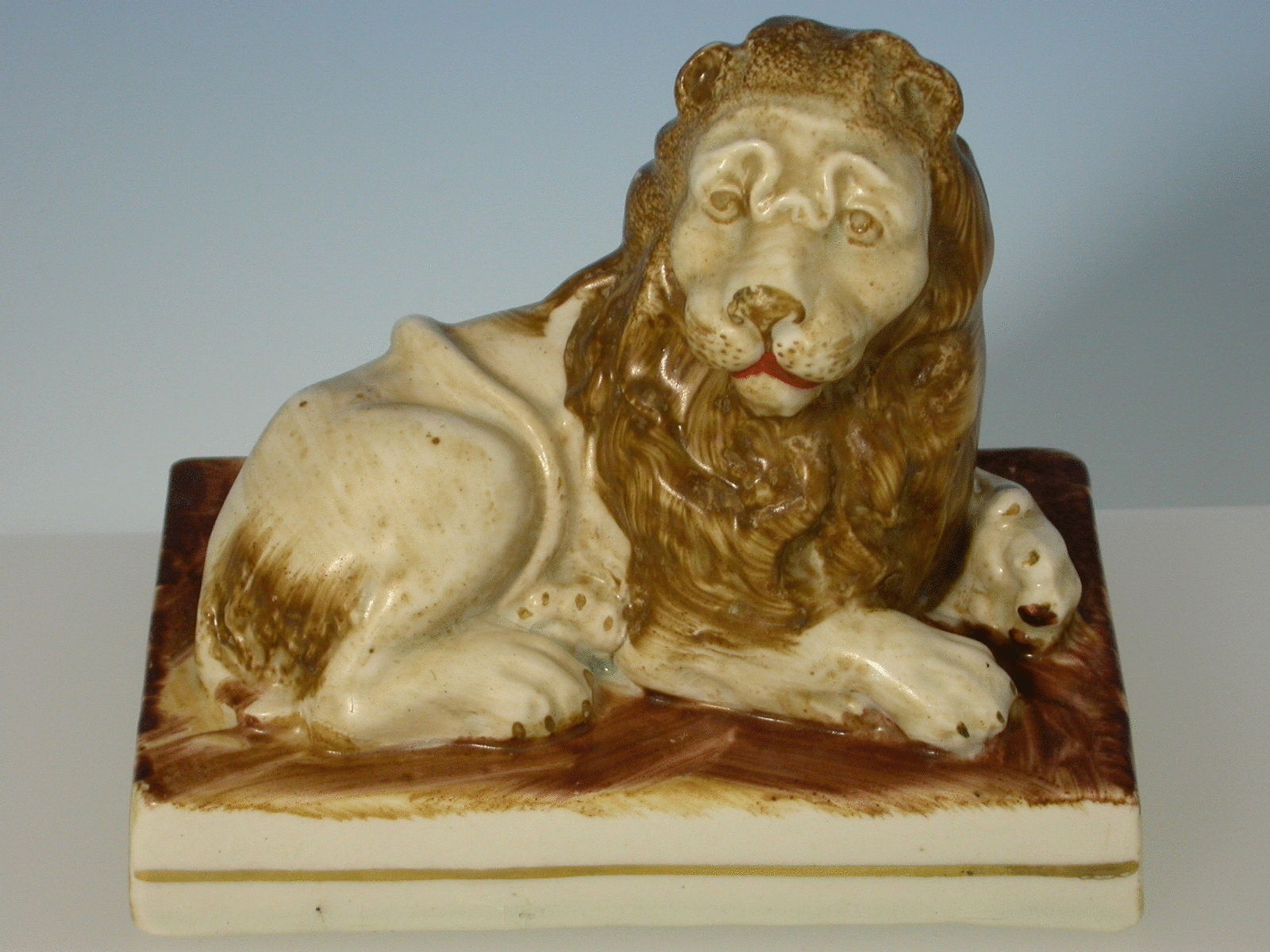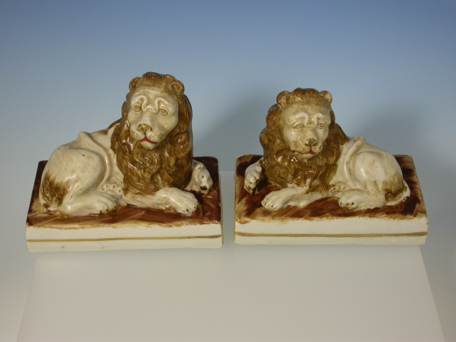 A pair of Victorian Staffordshire Recumbent Lions on rectangular bases with gilt line rims, highlighted in ochreous brown enamels.