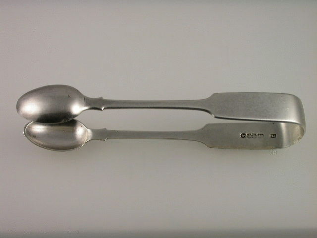 A rare pair of early Victorian Provincial silver plain fiddle pattern Sugar Tongs, engraved with contemporary initials.