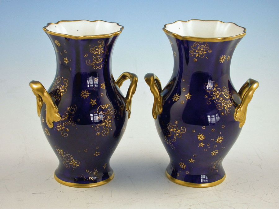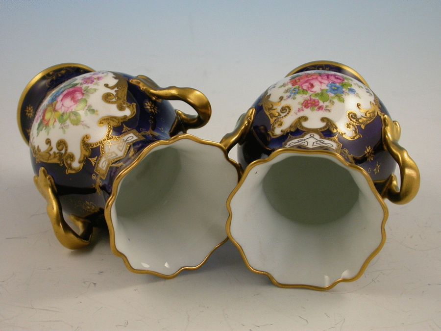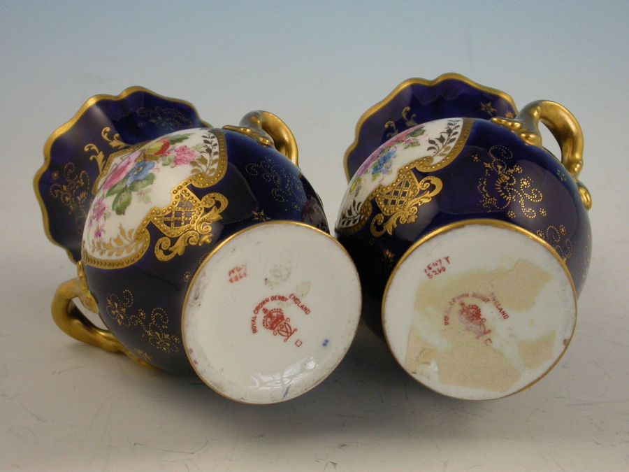 A fine pair of Royal Crown Derby globular shaped Vases with gilt handles, painted in the gilt enriched scroll shaped reserves with sprays of English flowers.