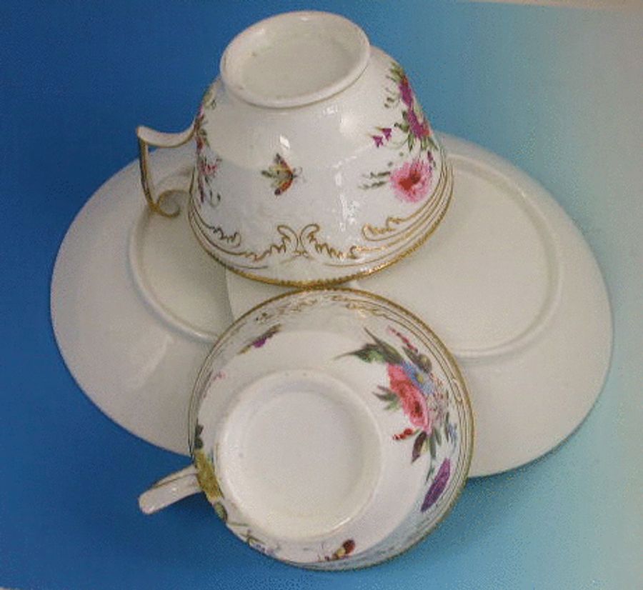 A fine pair of Spode London shape Teacups and Saucers, painted with sprays of flowers and scattered insects on a white ground, within gilt dentil borders.