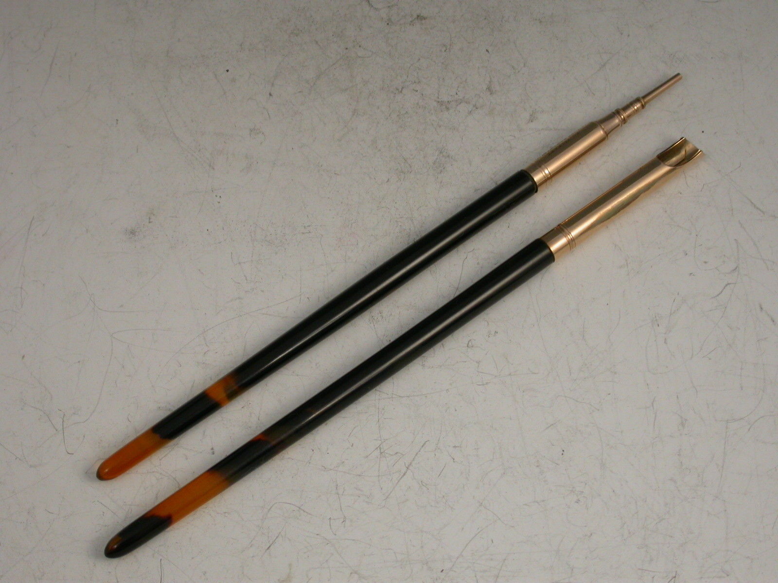 A very fine quality cased pair of Victorian 9 carat gold Dip Pen and Propelling Pencil with tapered tortoiseshell shafts, the plain reeded barrels stamped - J C Vickery 181 & 183 Regent St.W and 9ct.