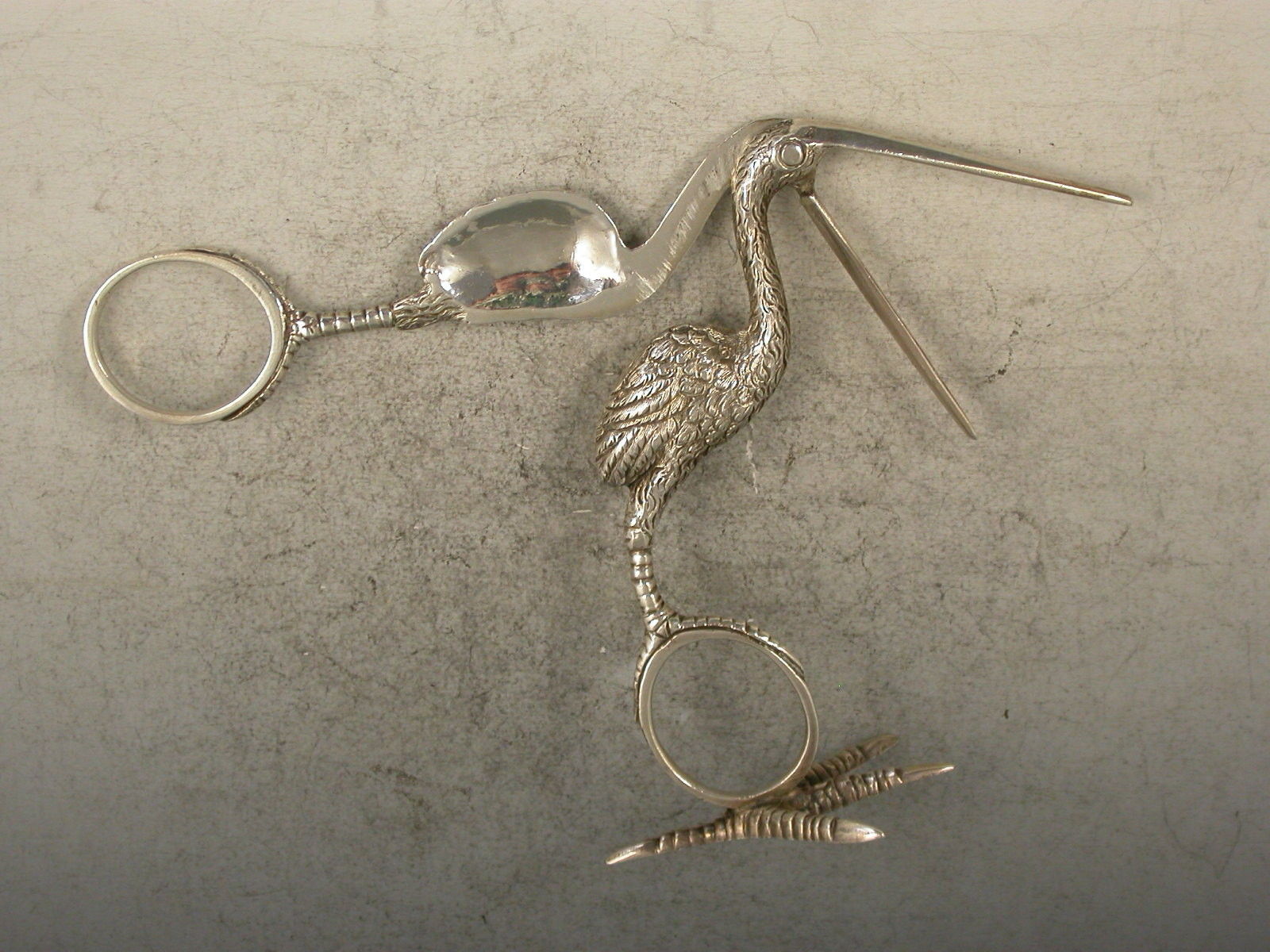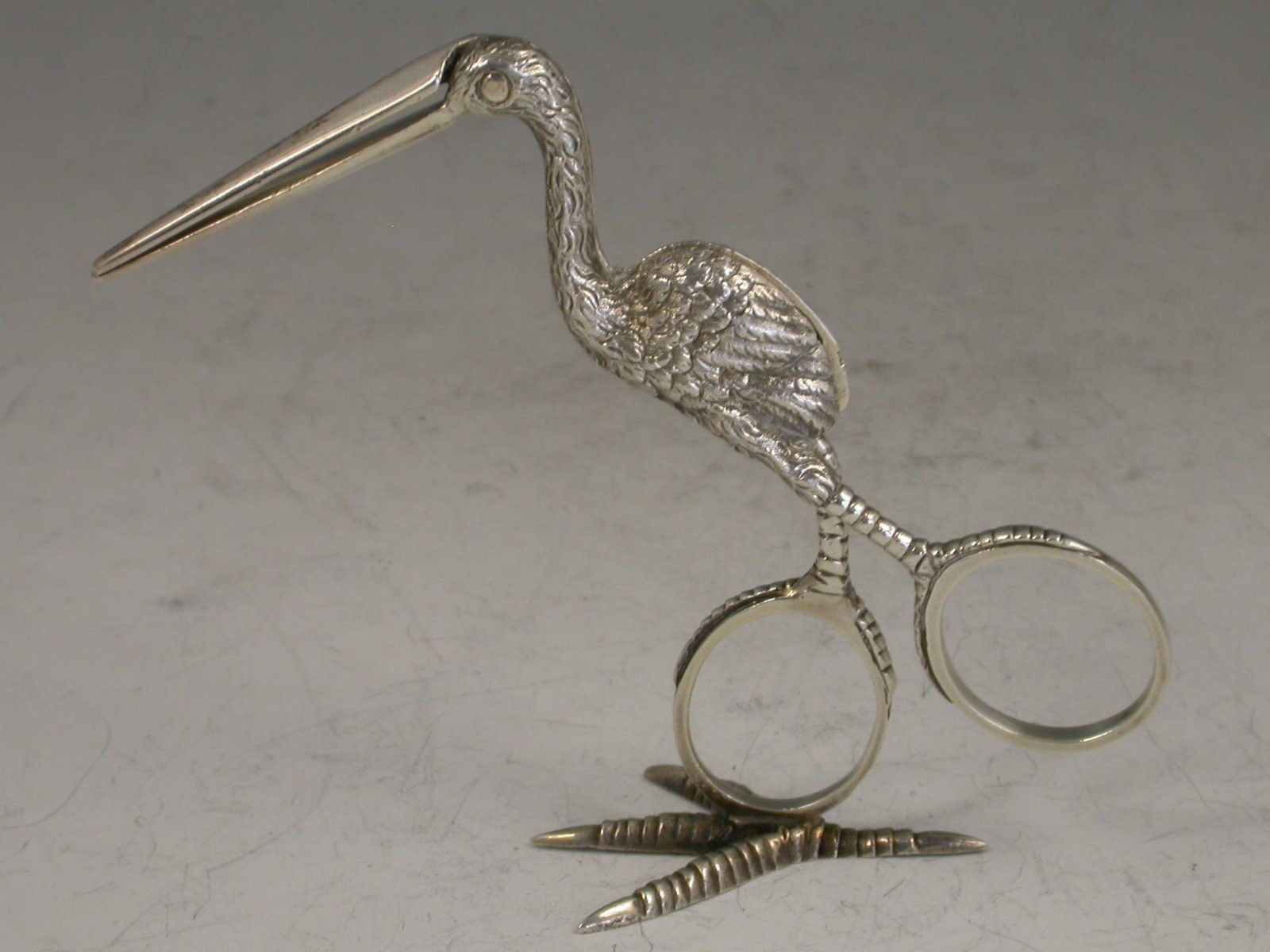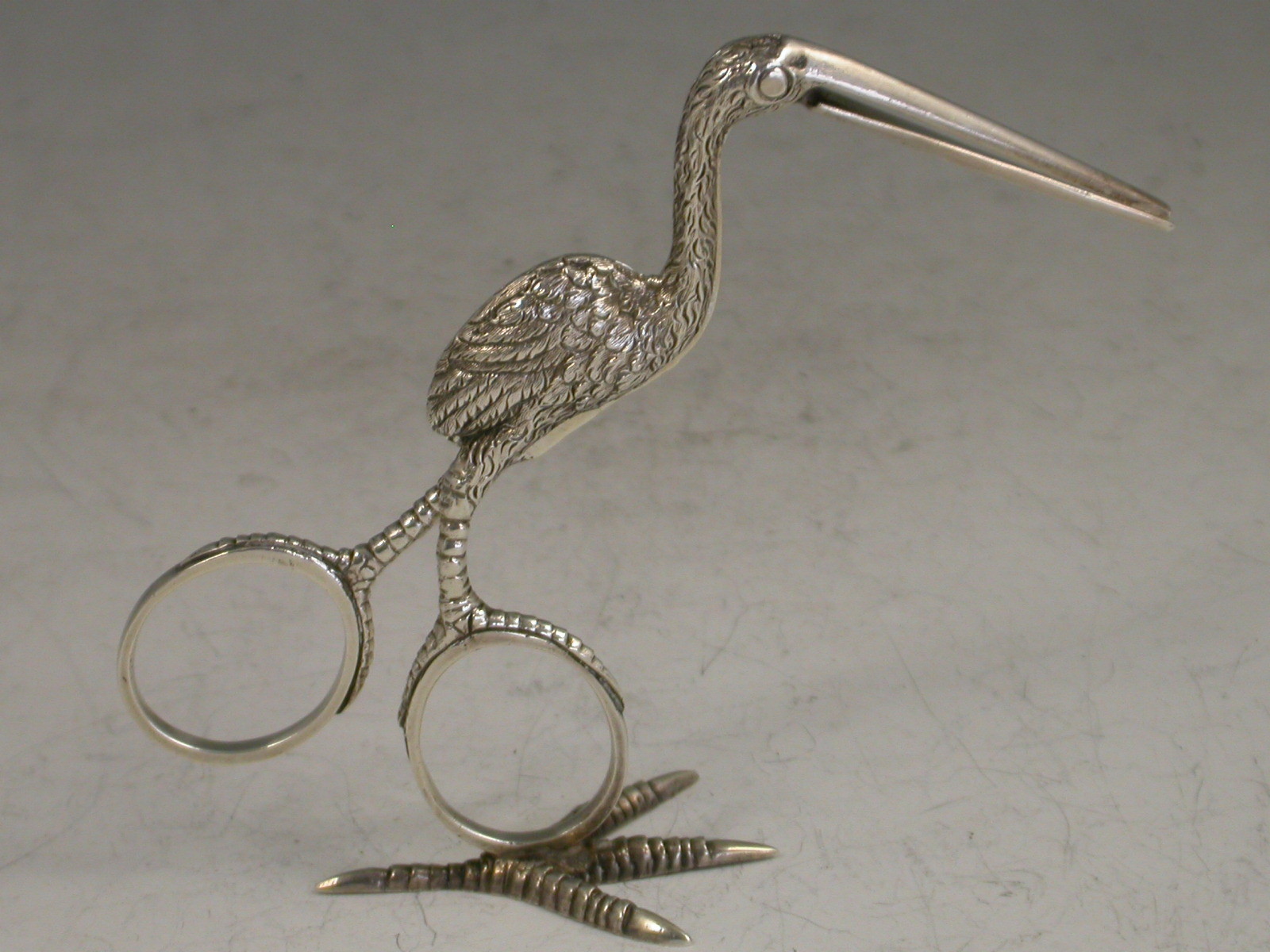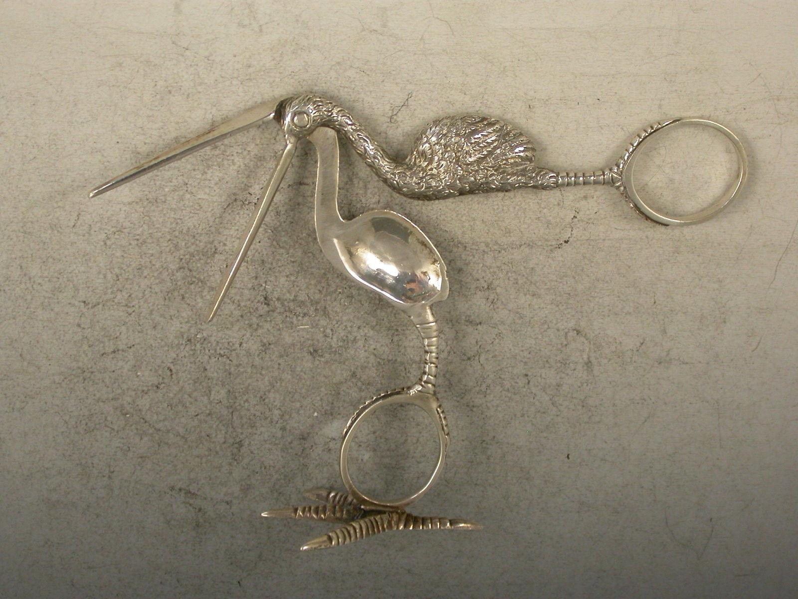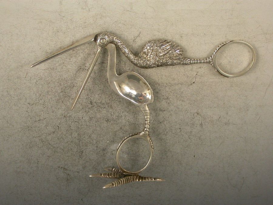 A good quality pair of Victorian cast silver Ribbon Threaders, made in the form of a Stork standing on four claw foot.