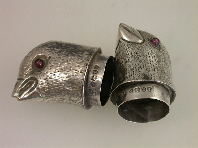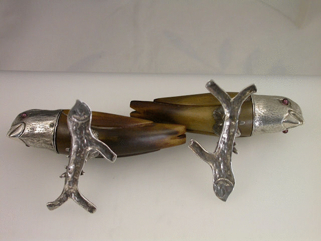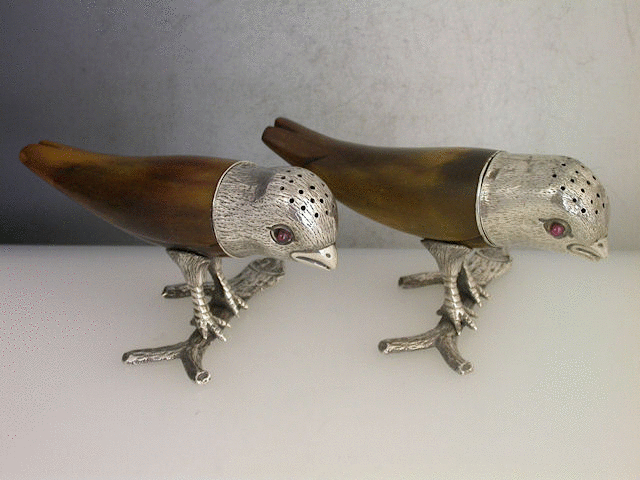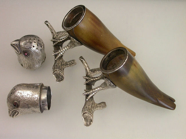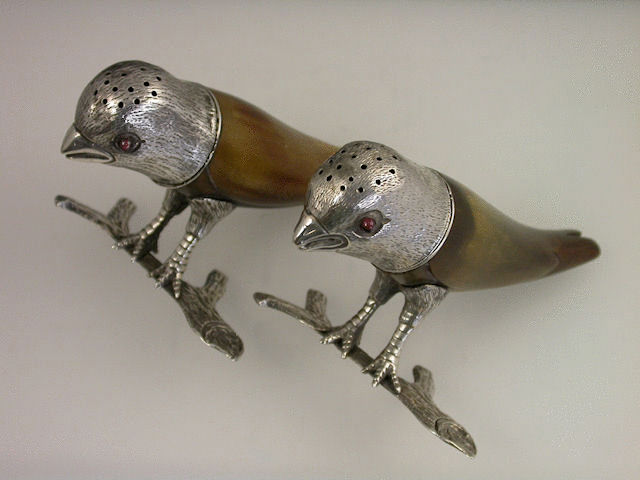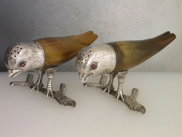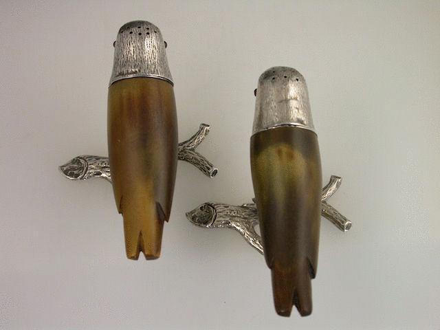 A very unusual pair of Victorian Novelty silver mounted horn Peppers, naturalistically formed as two ‘Love Birds’ standing on branches, the pierced pull-off heads with ruby glass eyes.