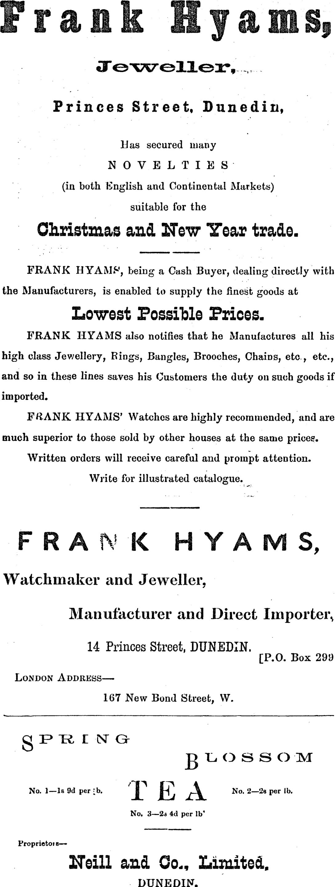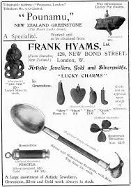 Frank Hyams was a jeweller, silversmith, and watchmaker with stores in New Zealand (founded 1885) and London. He specialized in high-end antique jewellery, silverware, watches, and china along with a strong focus on New Zealand greenstone (nephrite). Mr. Hyams had the native greenstone, which was associated with the Maori race from early records, set in antique jewellery and other collectable objects. He was the leading manufacturer and dealer of New Zealand greenstone at the time.