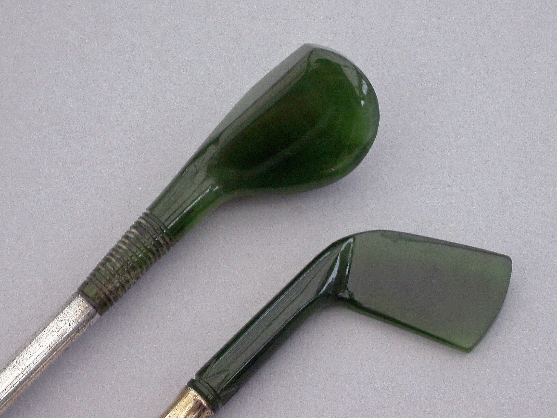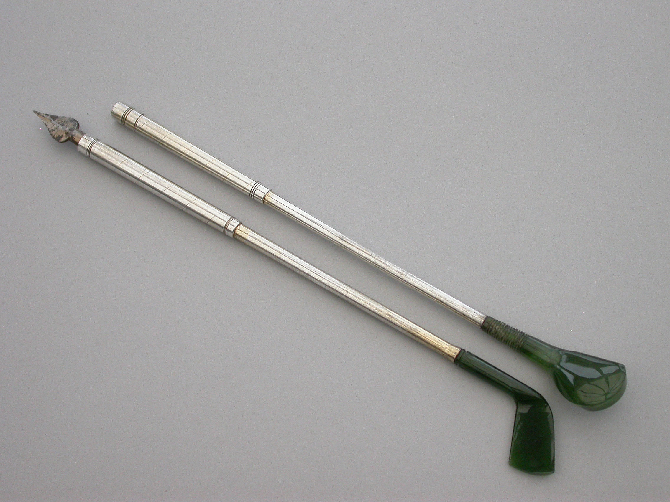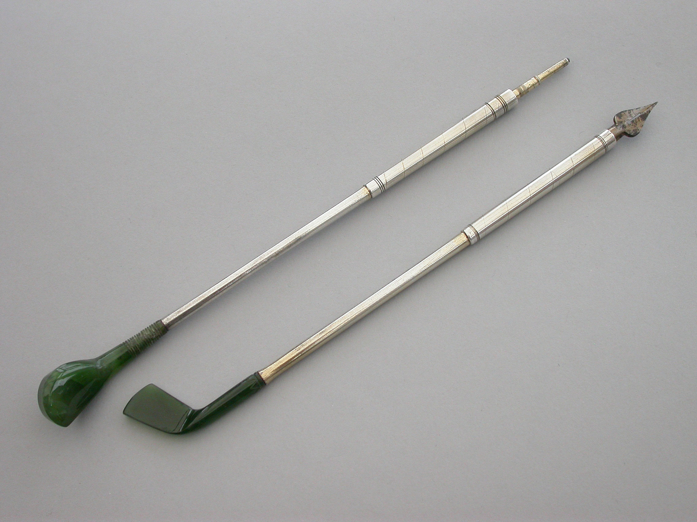 A good quality late Victorian or early 20th century pair of novelty silver mounted nephrite Propelling Pencil and Dip Pen, made in the form of Golf Clubs (a driver and a long iron). Realistically modeled and carved, the propelling pencil extending from the handle of the driver with a twist mechanism. The dip pen with steel nib.