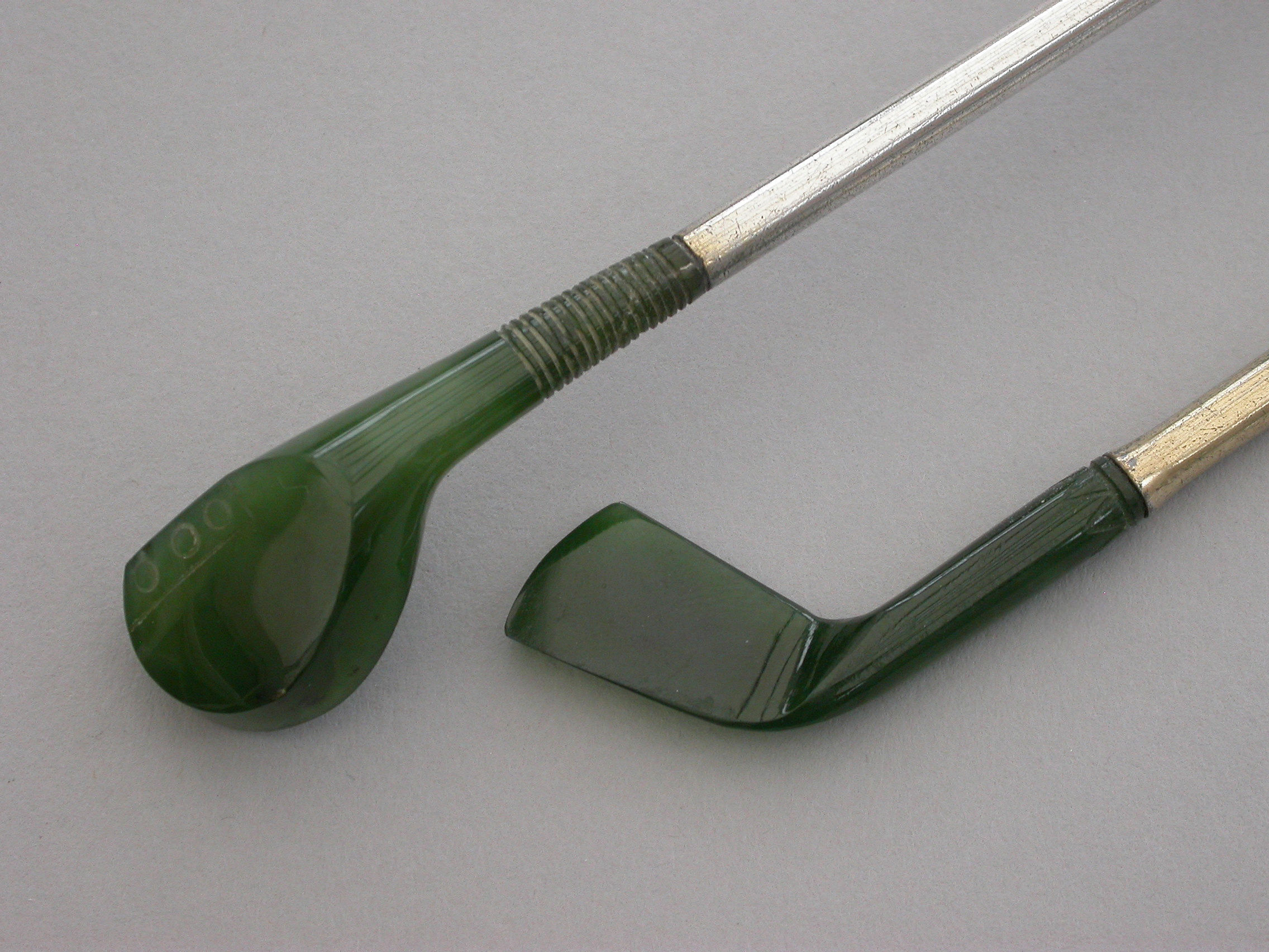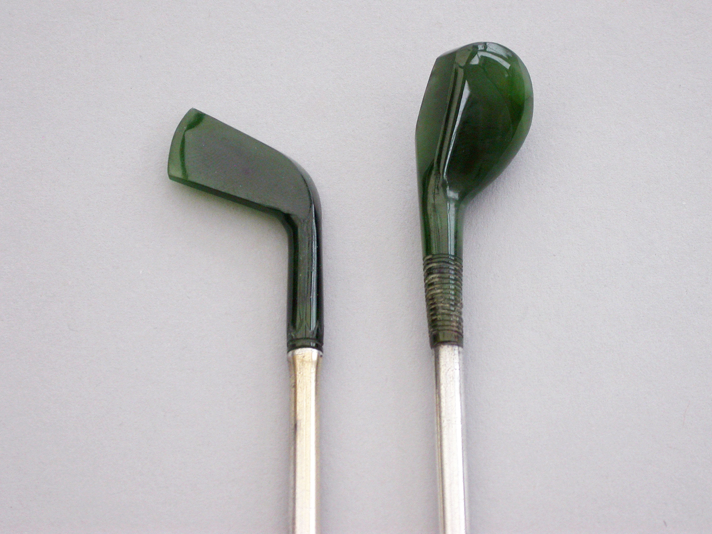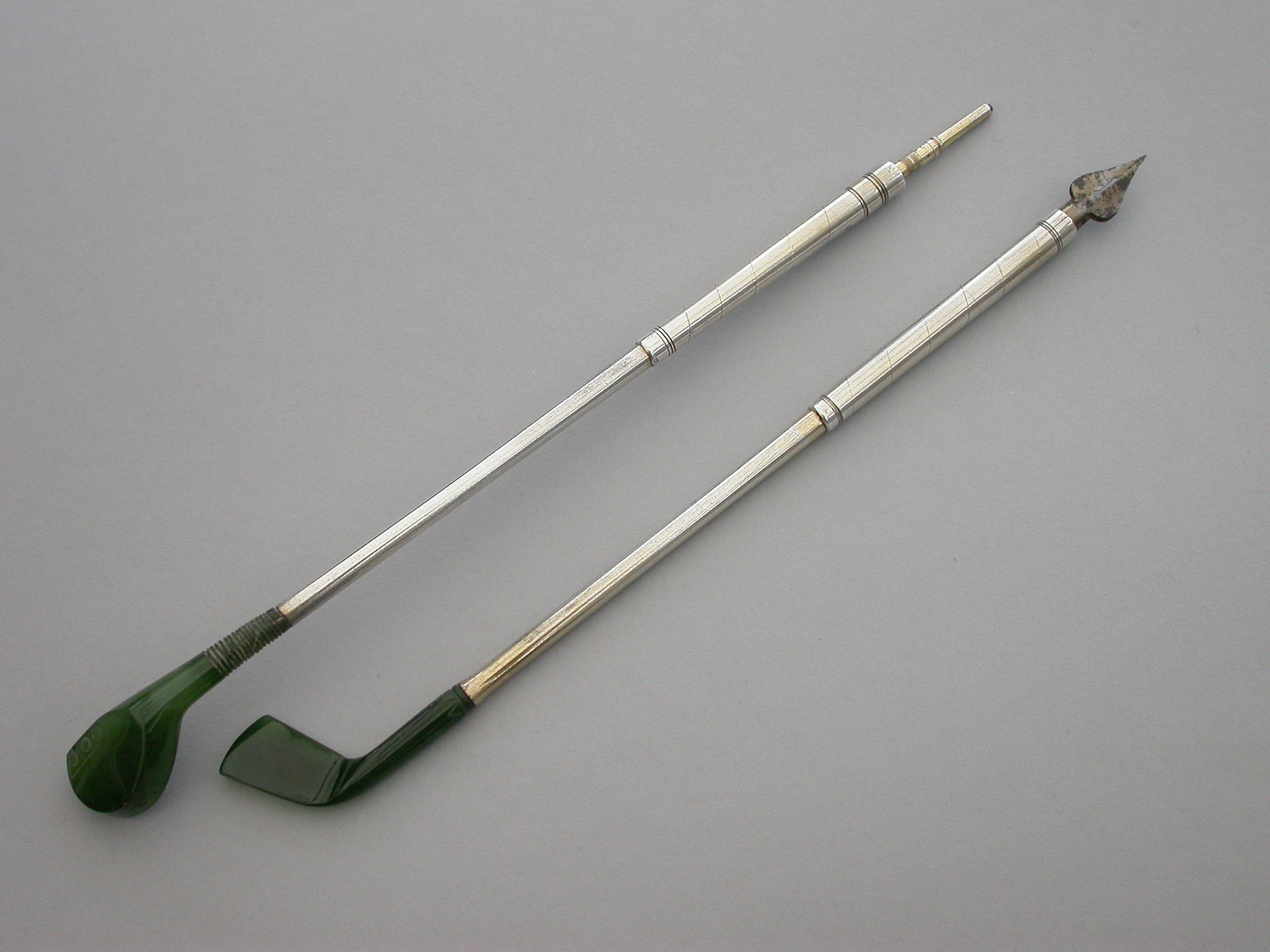 A good quality late Victorian or early 20th century pair of novelty silver mounted nephrite Propelling Pencil and Dip Pen, made in the form of Golf Clubs (a driver and a long iron). Realistically modeled and carved, the propelling pencil extending from the handle of the driver with a twist mechanism. The dip pen with steel nib.