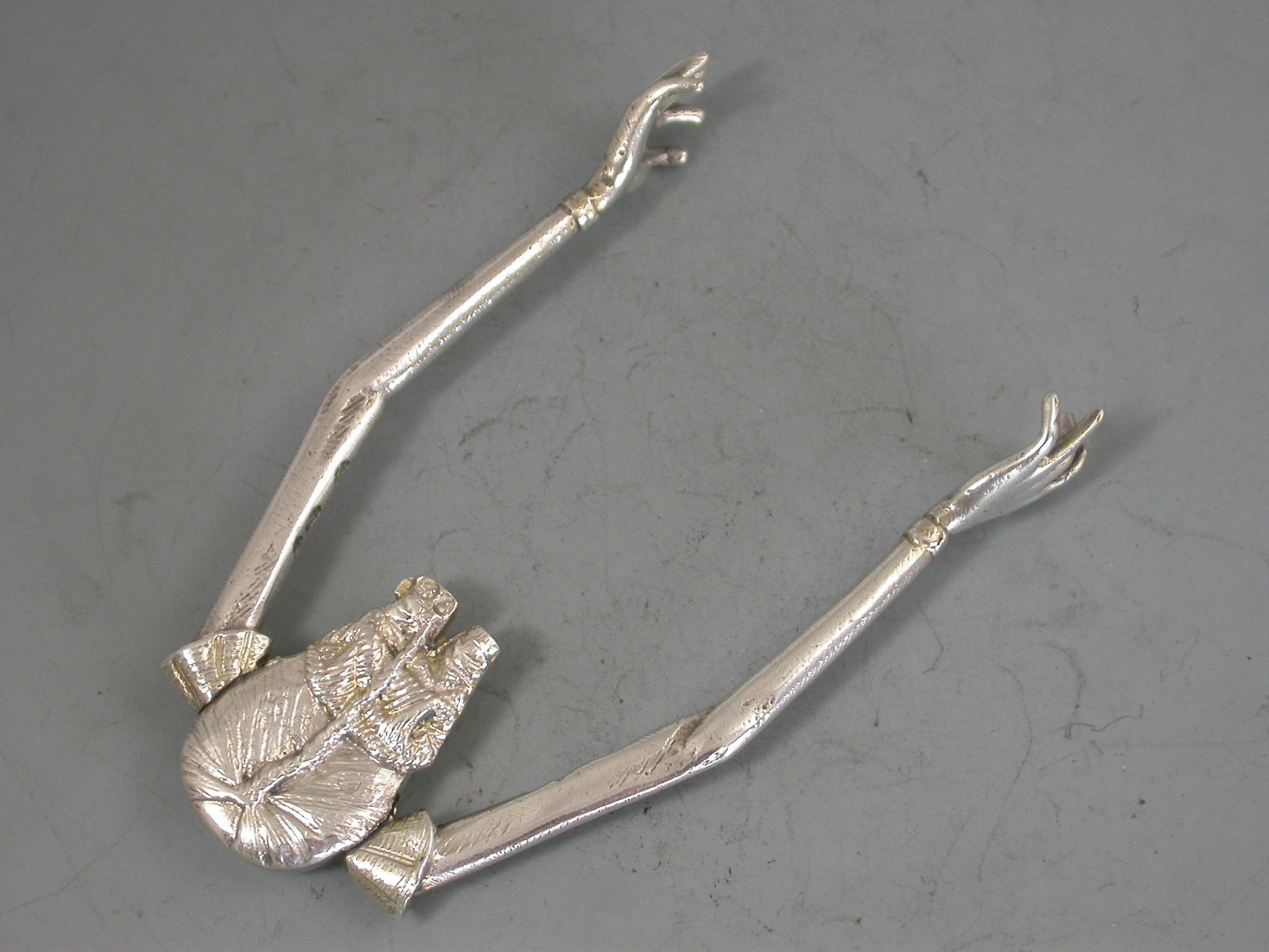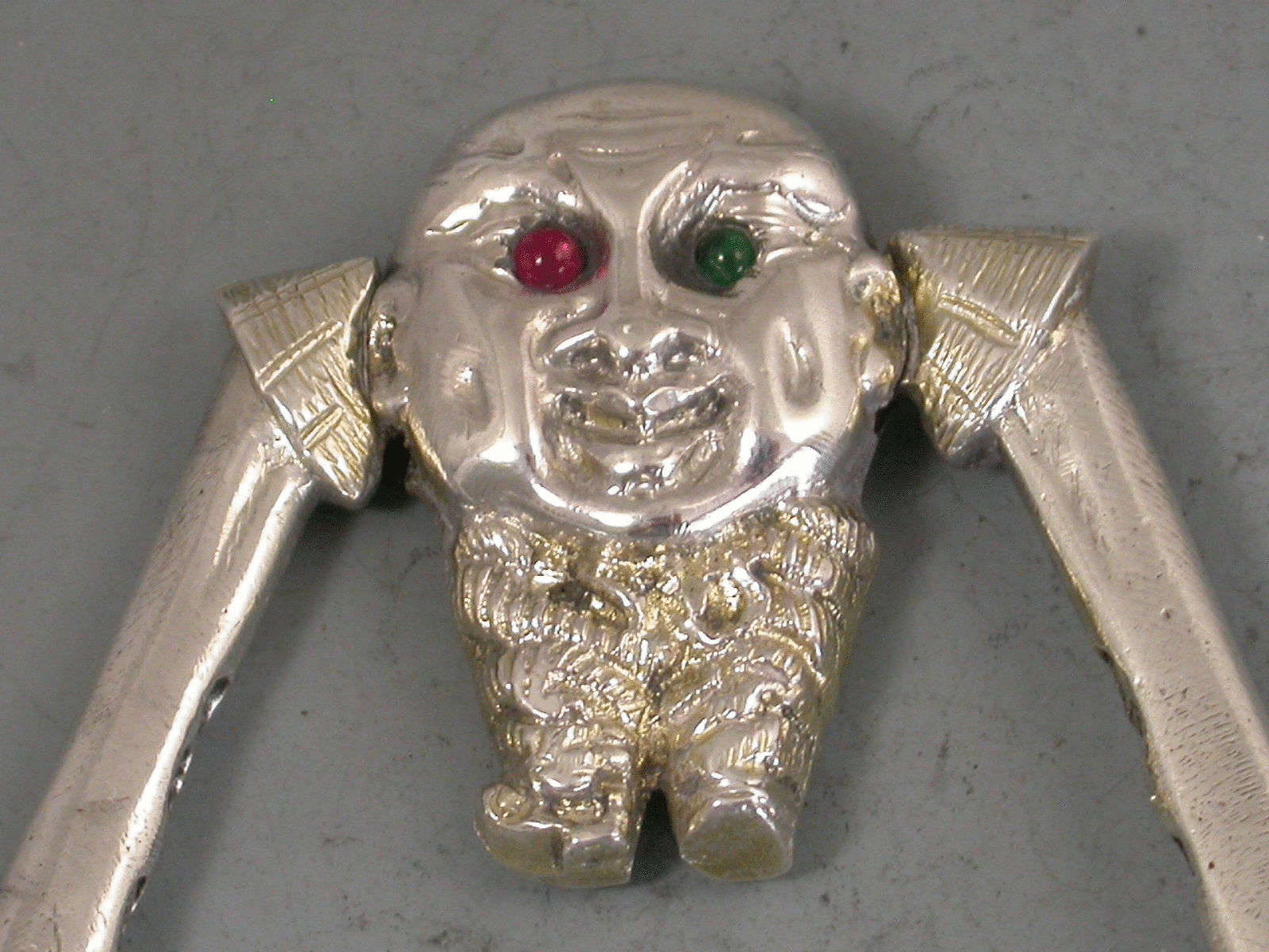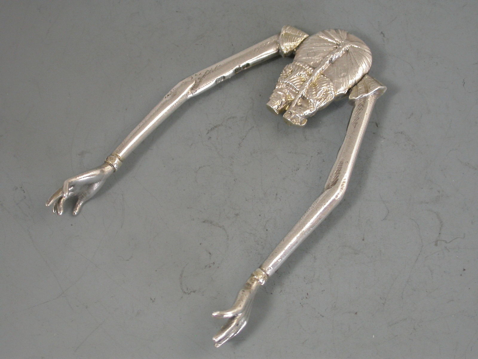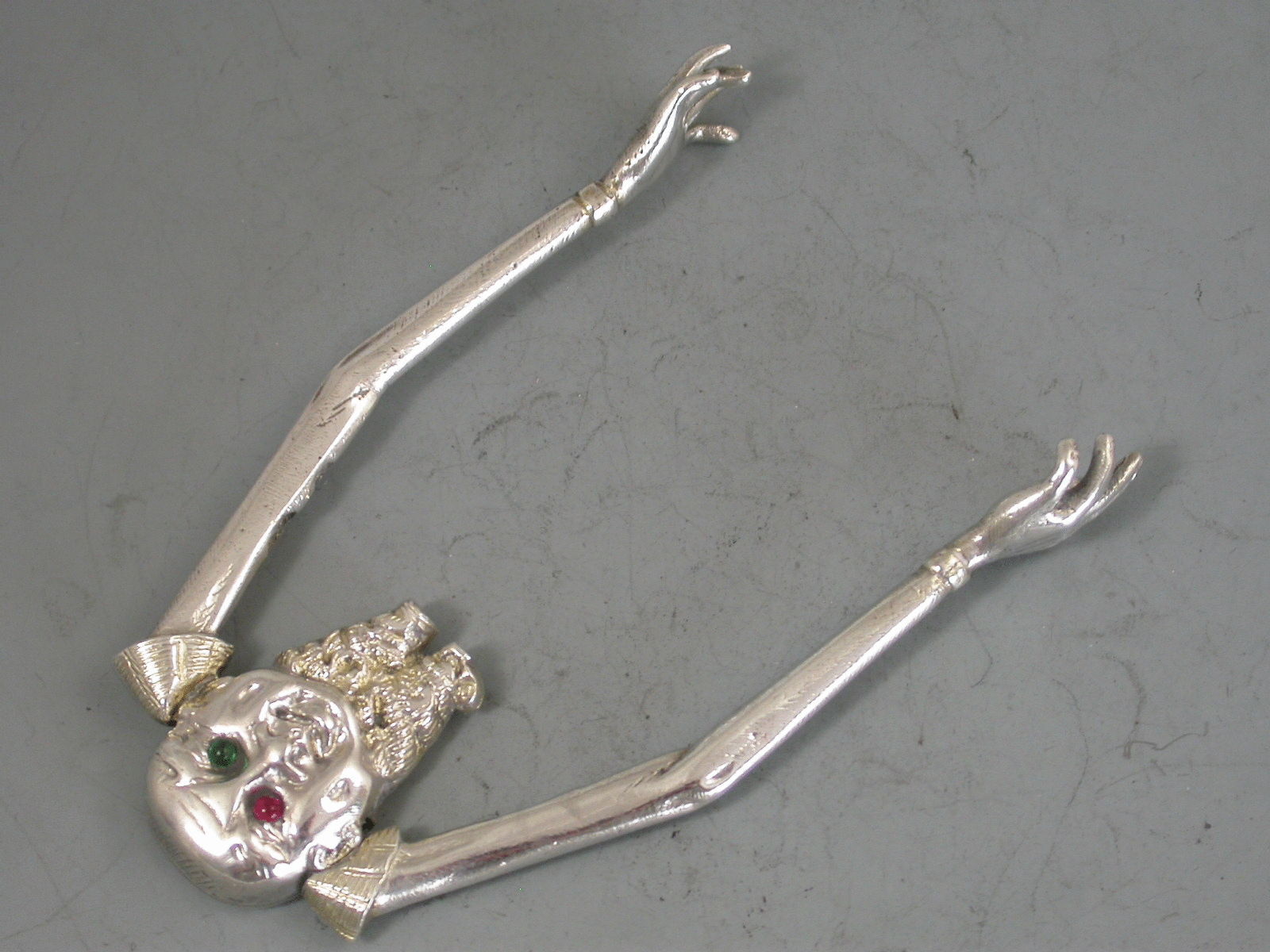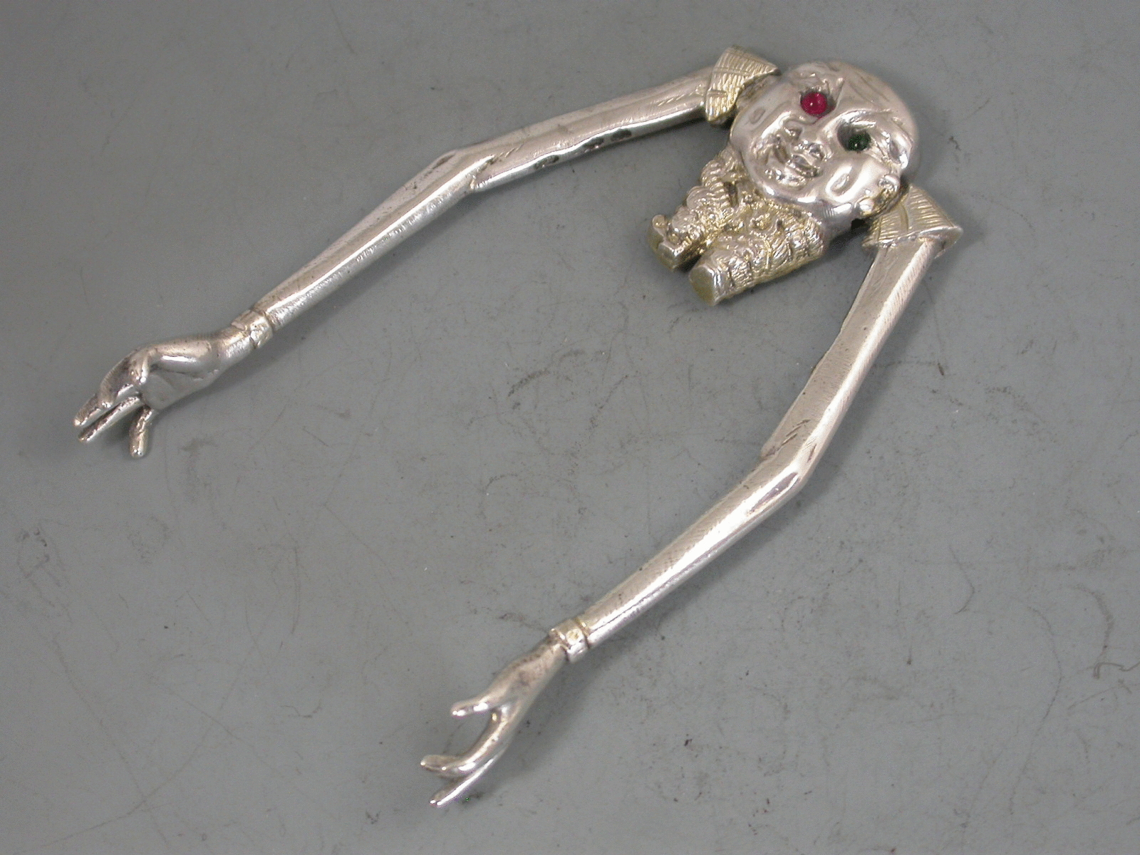 A pair of Victorian novelty silver Sugar Nips in the form of a Chinaman with short legs and long sprung arms, one red and one green glass eye.