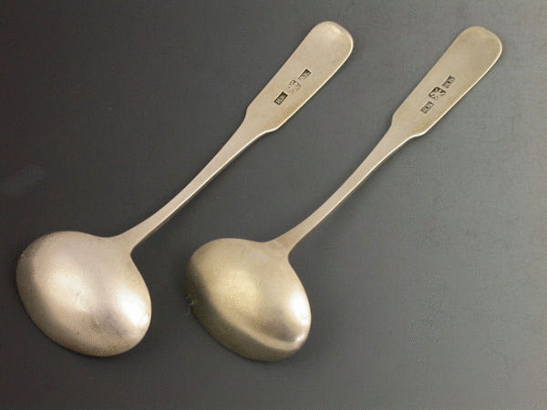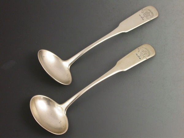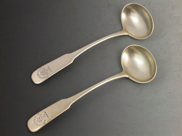 A good pair of early Victorian Scottish Provincial silver Salt Spoons of plain fiddle pattern, the handles engraved with crests depicting an arm holding up a crown, a motto above: “Virtutis Gloria Merces”, probably for Robertson of Perth, Scotland.