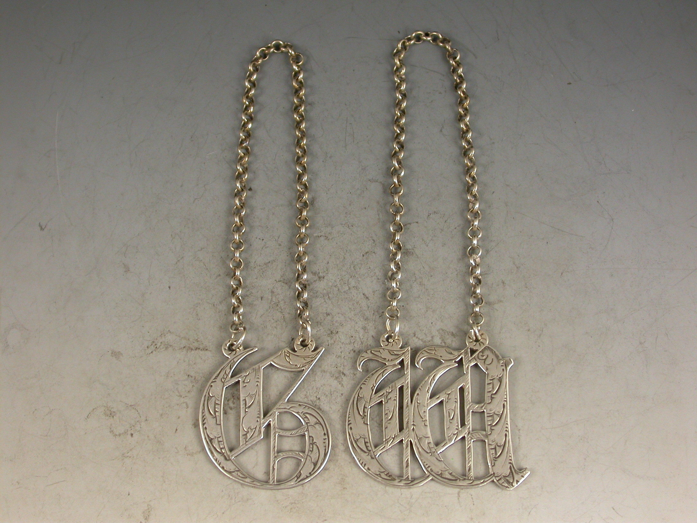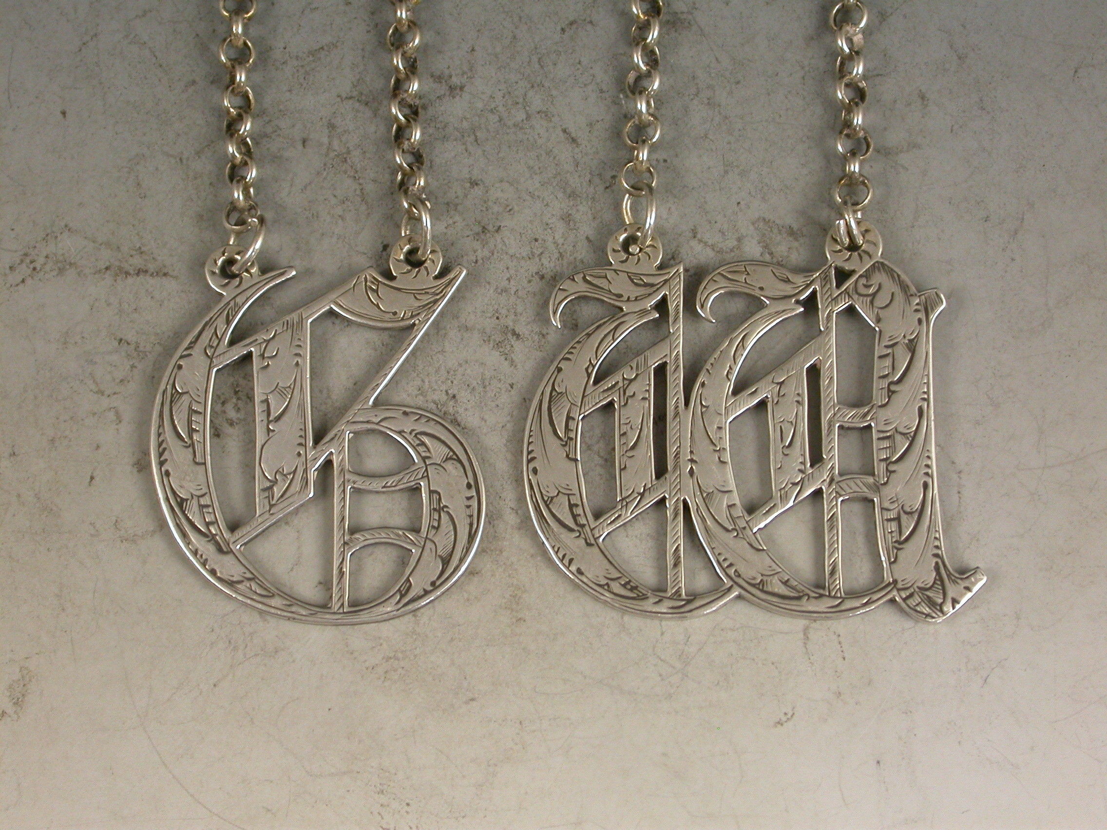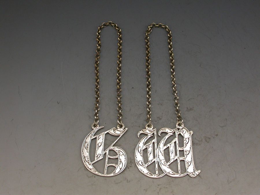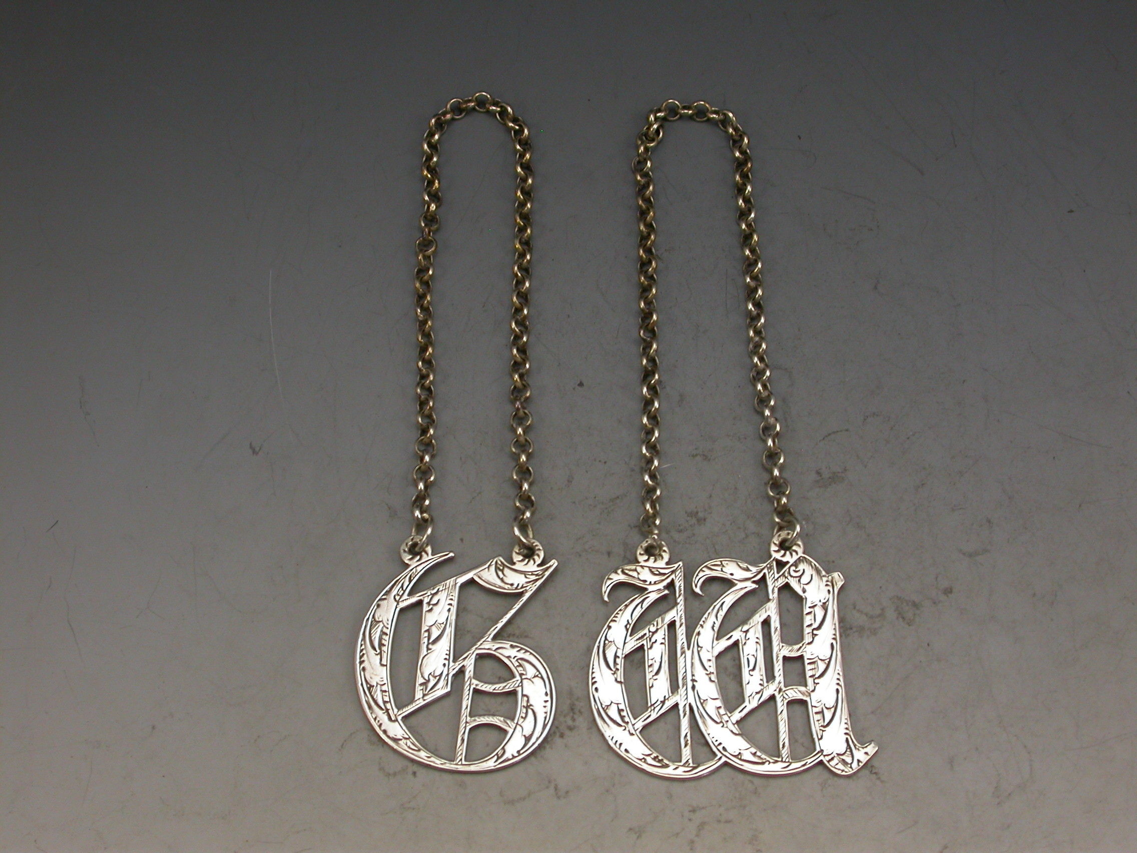 Pair Victorian Silver Gothic Capital Letter Wine Labels 'G & W'