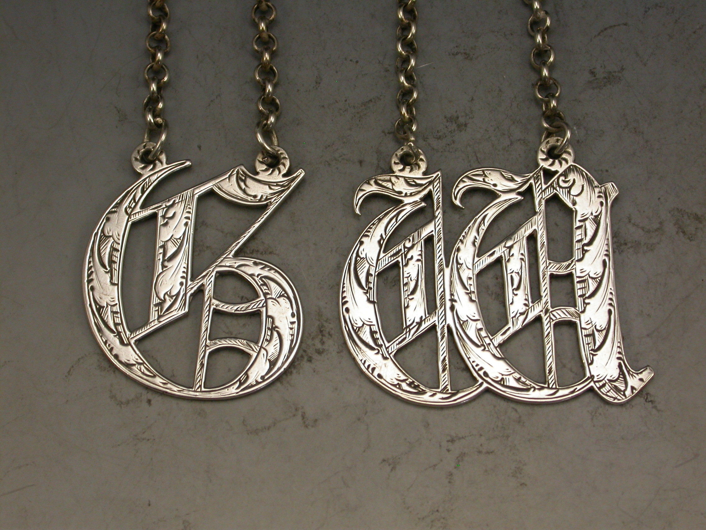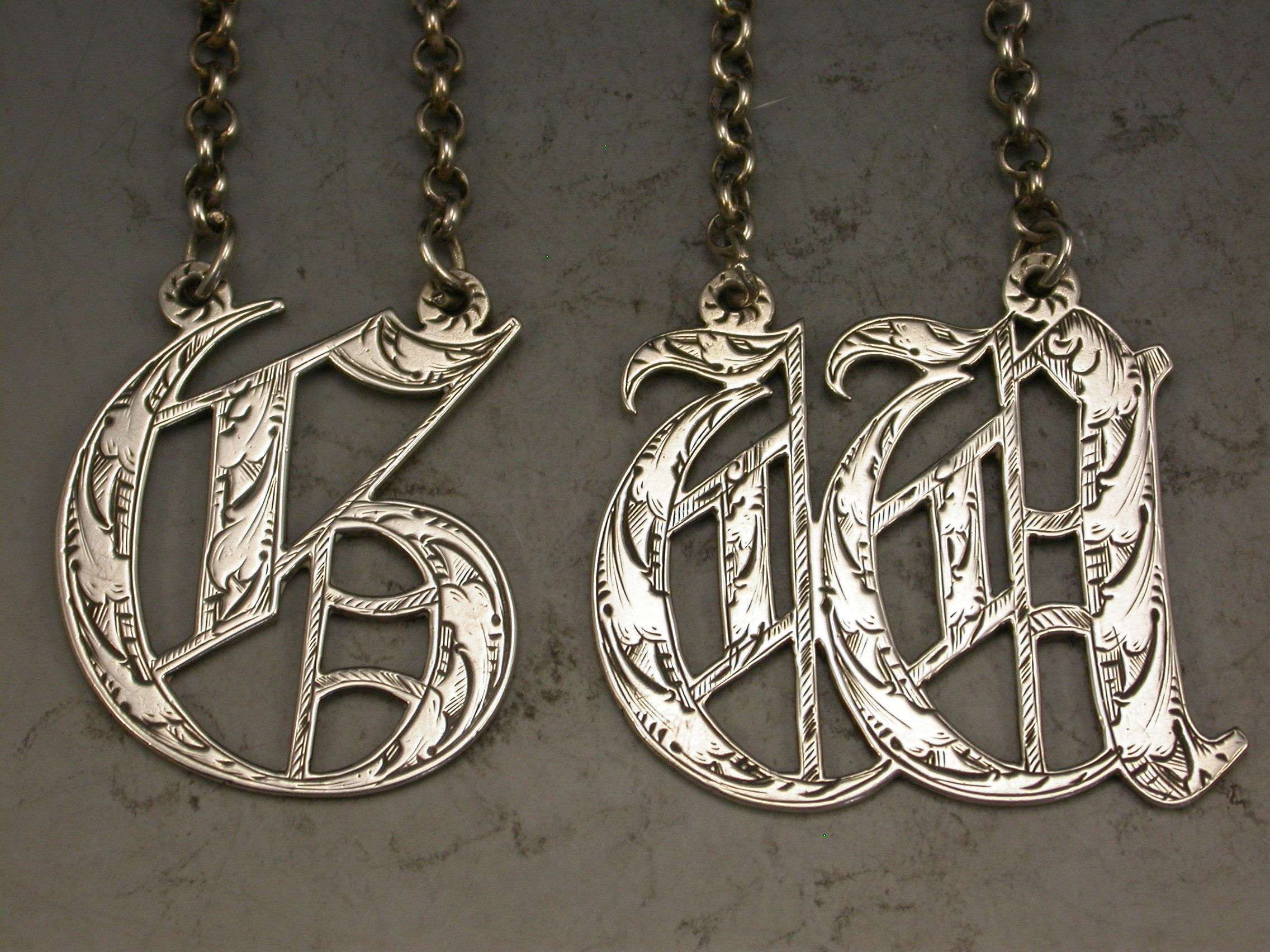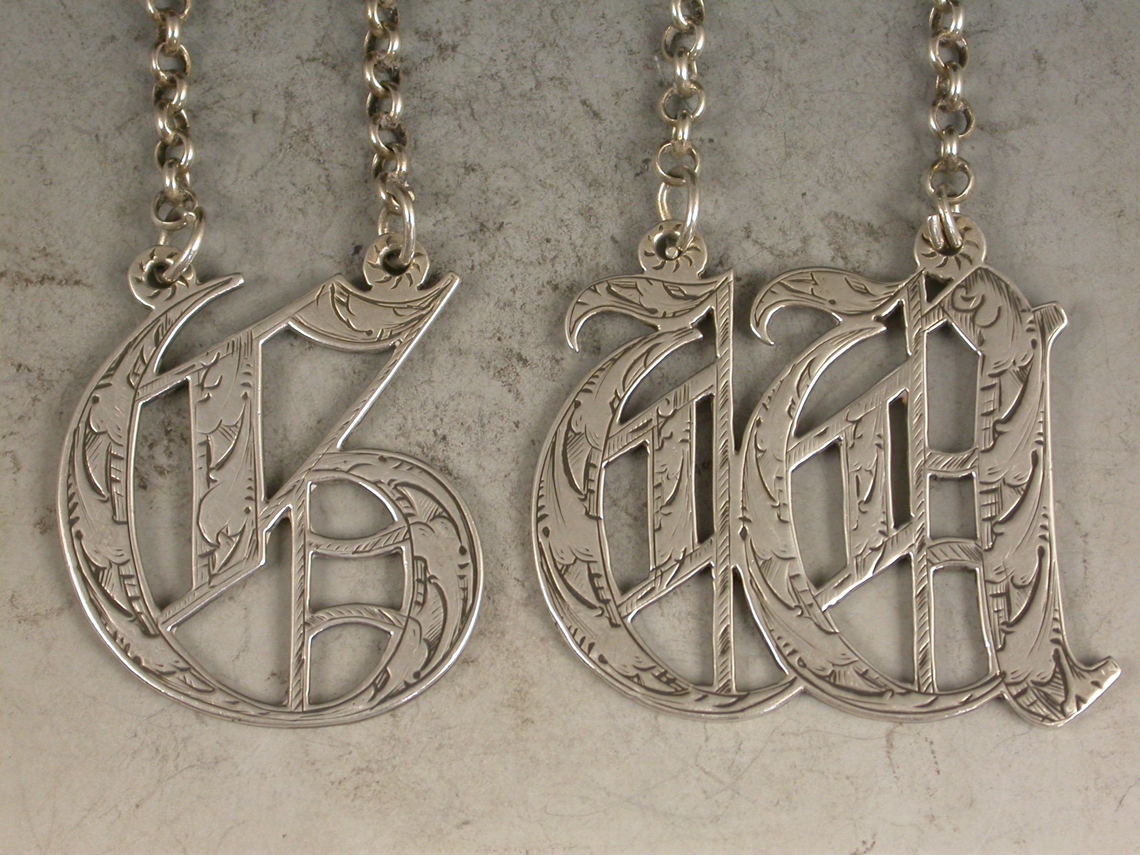 Pair Victorian Silver Gothic Capital Letter Wine Labels 'G & W'