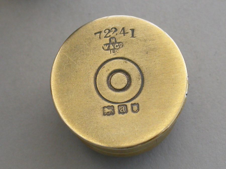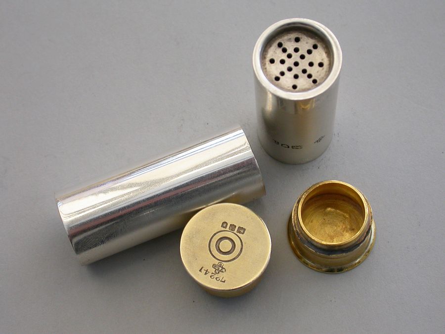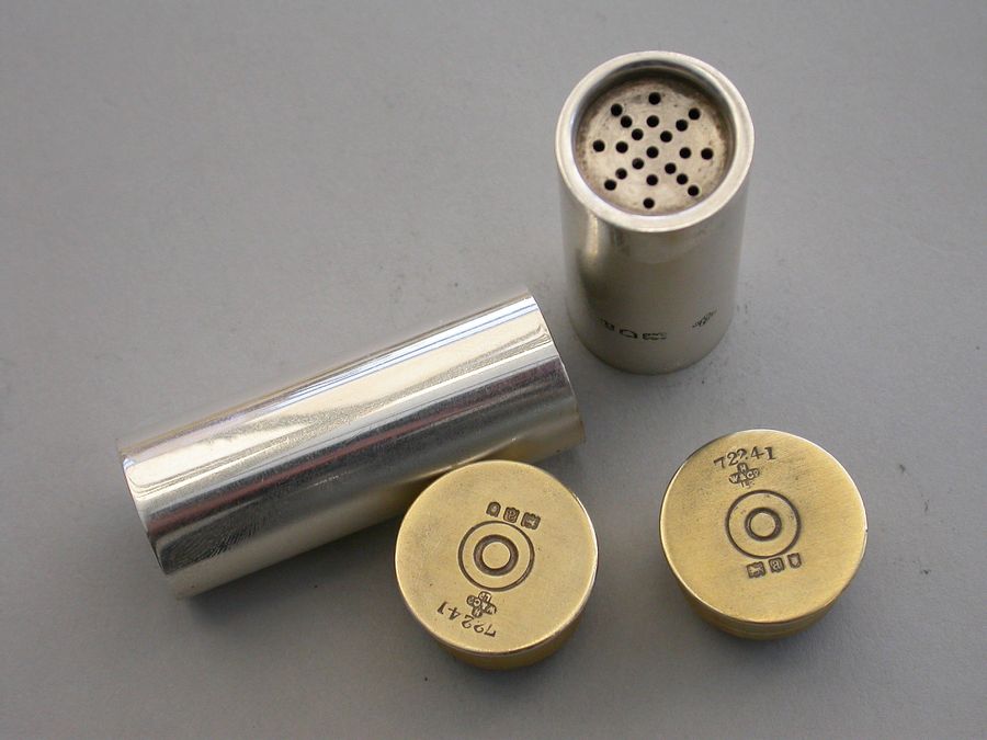 A pair of Victorian novelty silver Peppers made in the form of shotgun cartridges with screw-off silver gilt caps and plain bodies.