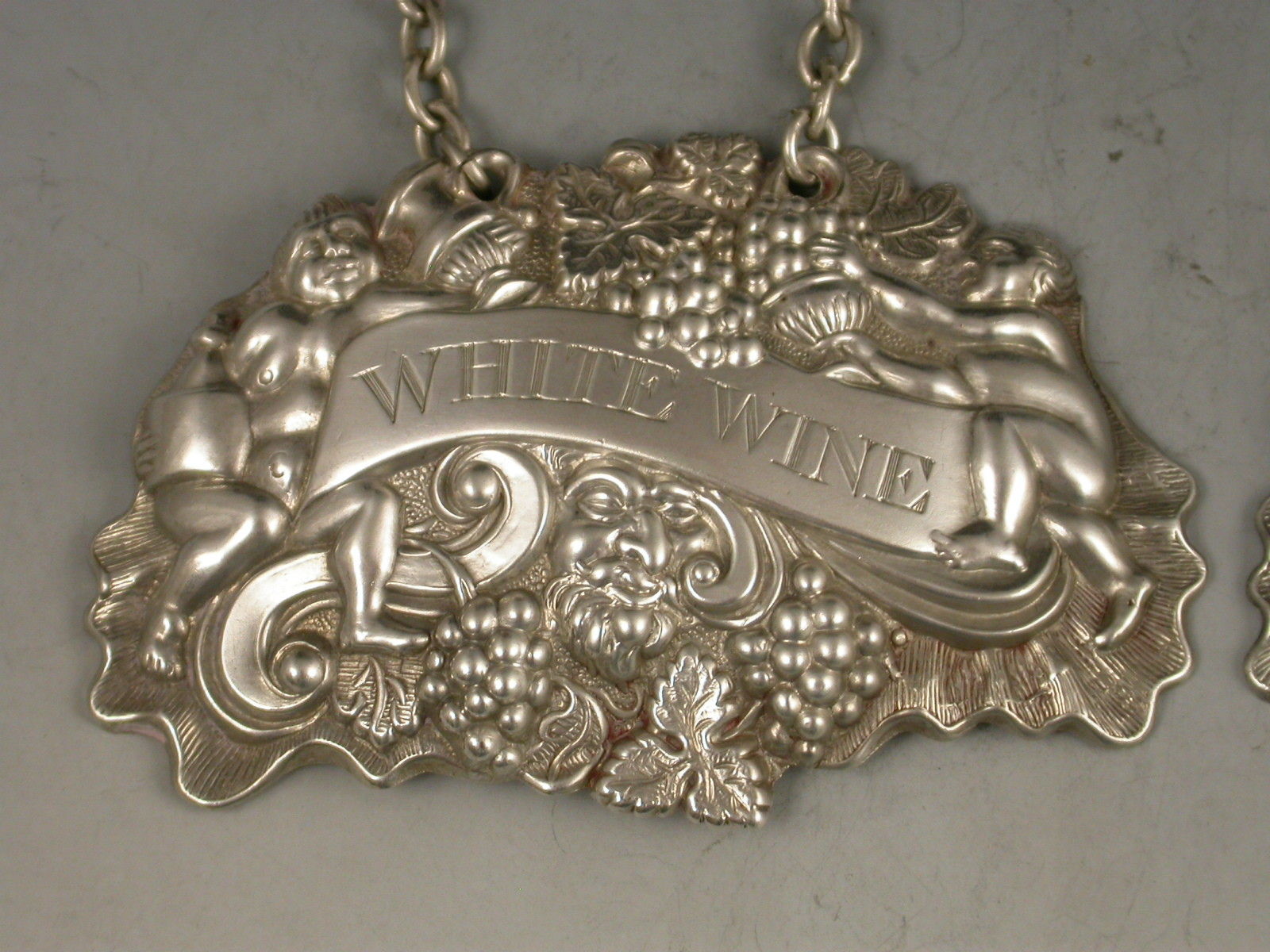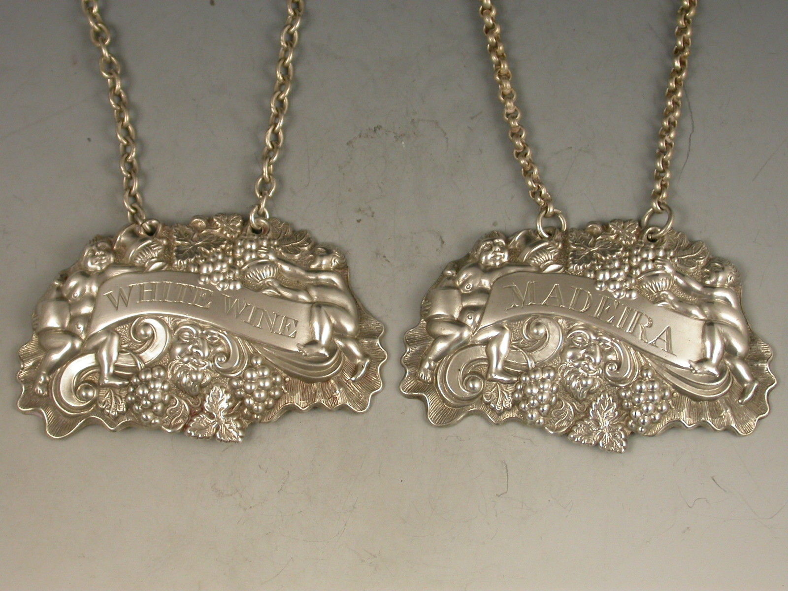 A pair of William IV die-stamped Provincial silver Wine Labels of ""two putti with jug and bottle form"", the scrolled name plates incised for Madeira and White Wine.