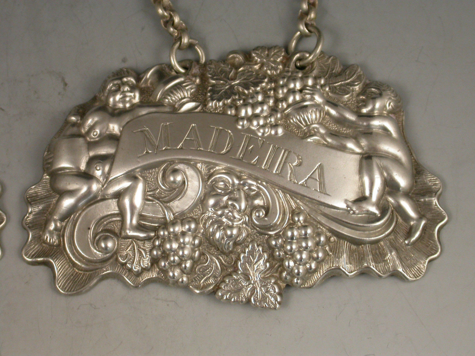 Pair William IV Provincial Silver Two Putti with Jug & Bottle Wine Labels 'Madeira & White Wine'