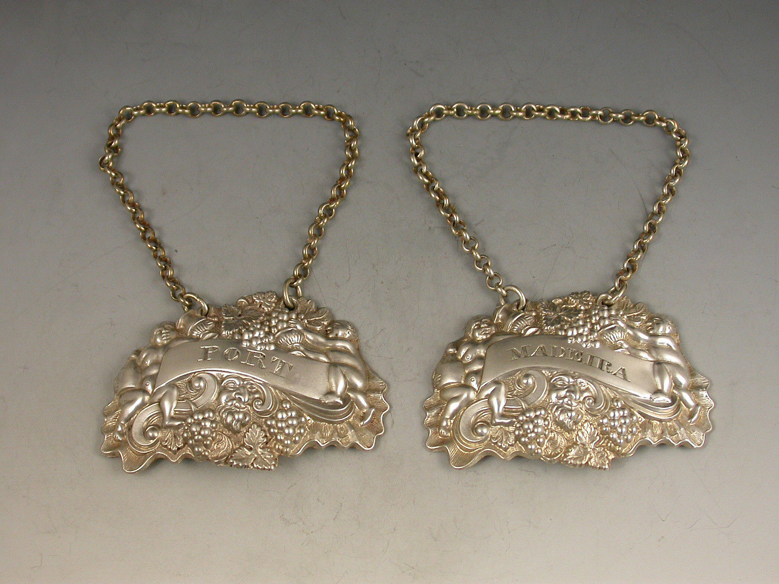 A pair of William IV die-stamped Provincial silver Wine Labels of ""two putti with jug and bottle form"", the scrolled name plates incised for Madeira and Port.